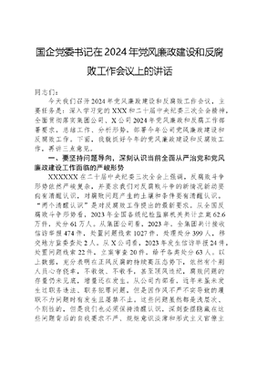 国企党委书记在2024年党风廉政建设和反腐败工作会议上的讲话同志们:今天我们召开2024年党风廉政建设和反腐败工作会议,主要任务是:深入学习党的XXX和二十届中央纪委三次全会精神,全面贯彻落实集团公司、X公司2024年党风廉政和反腐工作部署要求,总结工作、分析形势,部署今年公司党风廉政建设和反腐败工作。下面,我就抓好今年的党风廉政建设和反腐败工作,再讲三点意见。一、要坚持问题导向,深刻认识当前全面从严治党和党风廉政建设工作面临的严峻形势XXXXXX在二十届中央纪委三次全会上强调,反腐败斗争形势依然严峻复杂,并要求我们对反腐败斗争的新情况新动要向有清醒认识,对腐败问题产生的土壤和条件要有清醒认识。两个清醒认识是对反腐败工作提出的最新要求。从全国反腐败斗争形势看,2023年全国各级纪检监察机关共计立案62.6万件,处分61万人。从集团公司看,2023年,全集团共计接收信访举报474件,处置问题线索1027件,处理处分399人,移交地方监委查处2人。从X公司看,2023年发生信访举报24件,处置问题线索22件,立案审查20件,给予各类处分63人。以上数据,充分表明在正风反腐的持续高压态势下,依然有个别人员心存侥幸,不收敛、不收手,甚至顶风违纪,腐败问题的存量仍未见底,增量还在发生。从公司内部看,近年来虽未发生过职务违法、职务犯罪问题,但是因作风不严不实导致的履职不力问题时有发生且屡禁不止。这些问题虽然都是浅层次、个别性的,但是我们也必须保持清醒认识,深刻查摆隐藏在这些问题背后的自我要求不严、规矩意识淡薄和形式主义官僚主义问题,坚决防止小问题变成大隐患,最终一发不可收拾。在认清反腐败斗争严峻形势的同时,我们也要深刻查摆腐败问题的成因,只有这样才能对症下药、由根治腐。刚才,X通报了几起违规违纪违法典型案例,这些案例之中,内外勾连、靠企吃企、利益输送者有之,设租寻租、欺上瞒下、谋取私利者有之,失职失责、胆大妄为、以权谋私者有之。分析问题成因,无非以下几点。一是理想信念不坚定。部分党员干部不重视理论学习,久而久之拜金主义、享乐主义思想就会占据主导地位,理想信念的总开关一旦出现问题,就容易丧失免疫力,在权力诱惑、私利私欲面前,很难不败下阵来。二是贪欲泛滥不知足。贪欲是各种腐败的源头,私心是贪欲形成的驱动。对党员干部来说,如果不能用纪律规矩约束自己的贪心私欲,如果不能正确的认识和看待手中的权力,那么迟早会发生贪腐问题。三是纪律规矩不执行。俗话说,破法无不始于破纪,破纪往往从违规开始。工作中,部分党员干部心存侥幸心理,不学制度、不懂规矩,总觉得追责问责离自己很远,久而久之放松了警惕和要求,最终违规违纪。三是监督约束不到位。失去监督的权力必然导致腐败,这是被无数事实证明了的真理。工作中,我们的领导干部对下属的问题不好意思动真碰硬指出,谈心谈话习惯于用提要求代替指问题,这不是爱护干部,是害了干部。二、要坚持自我革命,树立系统观念,认真落实健全全面从严治党体系的任务要求XXXXXX在二十届中央纪委三次全会上,对构建党委统一领导、全面覆盖、协同高效的反腐败工作体系进行了深刻论述、提出了明确要求。各党支部、各部门、全体干部职工要认清形势,统一思想,认真落实健全全面从严治党体系的任务要求,层层压实管党治党政治责任。(一)要把全面从严治党涵盖党的建设全过程。全面从严治党,不仅仅是正风肃纪反腐一个方面,而是要把严的基调、严的措施贯穿党的工作全过程。一要加强政治建设。要深化拓展主题教育成果,严格落实党委理论中心组学习、第一议题制度,坚持不懈用XXX新时代中国特色社会主义思想凝心铸魂,确保公司上下在思想行动上和党中央保持高度一致。二要坚持问题导向。要深刻查摆公司在党的建设方面存在的短板弱项,坚持有什么问题就解决什么问题,什么问题突出就集中解决什么问题,切实推进党的建设和管党治党工作取得新成效。三要加强制度建设。要强化全面从严治党制度体系建设,进一步健全完善全面从严治党责任清单台账,认真落实党委主体责任,全力支持纪委履行监督责任,督促各级管理干部扎实履行一岗双责,切实构建齐抓共管的责任落实体系。(二)要管住管好各级党组织和全体党员干部。全面从严治党,要面向全部党组织,覆盖全体党员。一是要紧盯关键少数。特别是一把手和领导班子成员,要将其作为日常监督的重点对象,加强三重一大事项集体决策、重大问题请示报告、个人有关事项报告、正确履责、廉洁用权等情况的监督。要高度重视对年轻干部的教育管理监督,引导他们树立正确的权力观、事业观和价值观。二是要管住绝大多数。要坚持大抓基层的鲜明导向,加大对基层职工的监督力度。要扎实开展廉洁警示教育、纪律规矩教育和党纪法规教育,力争做到干部职工教育全覆盖。三是要夯实基层基础。要持续加强基层党支部建设,聚焦