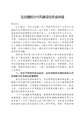 在加强能力作风建设动员会讲话同志们:1月28日,节后上班第一天,市委立即召开了全市关于加强能力作风建设动员大会,充分说明了市委、市政府持之以恒提能抓发展的鲜明导向和坚定决心。今天我们召开这次会议,目的是深入贯彻落实党的XXX和省第十二次党代会精神,按照市委、市政府关于加强能力作风建设部署要求,动员引导市直公路系统广大党员干部以更高站位、更大的决心、更实的举措打一场能力作风建设攻坚战,以能力作风大提升推动X事业大发展,为争当建设示范区、建功先行区的开路先锋提供能力支持和作风保障。刚刚X同志就《X系统关于加强能力作风建设的实施方案》作了解读说明,制定的工作措施很具体、也很实际,请各单位、各科室按照方案要求抓好落实。X、X两名同志结合工作实际围绕能力作风建设进行研讨交流发言,思路清晰、方向明确,值得其他同志学习。下面,就加强能力作风建设,我讲三点意见:一、坚定不移提升政治站位,站在战略和全局的高度认识加强能力作风建设的重要性能力是推动发展的原动力,作风是再创优势的催化剂,加强能力作风建设是永恒的课题。当前X行业正处于高质量转型发展的关键时期,必须要有过硬的能力作风来落实工作、推动工作。大家要充分认识加强能力作风建设的重大意义,切实增强思想自觉和行动自觉。(一)加强能力作风建设,是落实市委市政府战略决策的具体实践。2023年是全面贯彻落实党的XXX精神的开局之年,是实施十四五规划承上启下的关键之年,也是X加快建设绿色低碳发展示范区的深化之年,新年伊始,市委、市政府相继召开了一系列重要会议,提出了四个坚持和实现六个明显提升目标,发出了开局强作风、提能抓发展的强烈信号,对全年的工作定了方向、定了调子。作为我们X部门来讲,加强能力作风建设是贯彻党中央决策部署和省委、市委工作要求的具体行动,是推动X成势见效的具体举措,是解决干部队伍突出问题的迫切需要。当前X事业发展处在关键时期,需要干的事情很多,需要解决的问题也很多,系统上下必须要拧成一股绳、合成一股力、共下一盘棋,紧紧围绕找差距、提能力、转作风、树导向主线,以能力作风建设新成效开创X工作新局面。(二)加强能力作风建设,是推动公路事业高质量发展的必然要求。一个单位的发展,短期靠项目、中期靠政策、长期靠环境,归根结底靠的是干部的能力作风。近年来,我们紧抓干部队伍素质提升,驰而不息抓党风廉政建设,干部队伍纪律观念更强、大局意识更高、精神面貌更优、干事创业氛围更加浓厚,担当作为的大环境初步形成。但是,在肯定成绩的同时,我们必须清醒地认识到,我们的干部队伍中仍然存在思想认识上僵化、发展过程中自满、遵守纪律上松弛、工作执行上无力等问题。不从能力作风上解决问题,再优的条件、再好的机遇,也会失之交臂,能力作风的短板,就是阻碍高质量发展的制约瓶颈,这也必然要求我们围绕能力作风方面的问题来一次全面彻底的大起底、大整顿、大提升,通过加强能力作风建设,促干部队伍业务素质和精神风貌提升,为X事业发展营造风清气正、真抓实干的良好发展环境。(三)加强能力作风建设,是干事创业实现个人价值的重要举措。一代人有一代人的使命,一代人有一代人的担当。当前,X事业发展正处于追逐梦想,也能够实现梦想的阶段,在可以大有作为的时代而颓废,是对事业的不重视,也是对自己大好青春的浪费。要想干事创业实现个人价值,就要端正心态,提升能力,改进作风,从思维方式、知识结构、工作模式等方面进行立体式锻造、全方位重塑,成为X领域里的行家里手,成为值得令人敬佩、学习的先进典范,积极发挥个人贡献,为当前的X事业尽心尽责、奋力打拼,为X事业将来的发展夯基垒台、赋能添彩。二、坚持不懈聚焦重点难点,迅速掀起推进加强能力作风建设热潮一是聚焦政治能力,提升旗帜鲜明讲政治的作风。要坚持政治引领,把提升政治能力摆在首要位置,聚焦政治忠诚,看是否做到两个维护;聚焦政治定力,看是否坚定理想信念;聚焦政治担当,看是否敢于攻坚克难。切实为党分忧、为党尽责,敢于碰硬、敢战能胜,让讲政治成为内在要求、思维常态、行动自觉。要以XXX新时代中国特色社会主义思想为指导,深入学习贯彻党的XXX精神,及时跟进学习XXXXXX重要讲话重要指示以及关于交通运输工作重要论述,始终牢记国之大者省之要者市之重者,确保上级决策部署在X系统条条落实、件件落地、事事见效。二是聚焦专业能力,提升高质量发展的能力作风。紧紧围绕绿色低碳发展示范区定位,结合公路工作实际,找准结合点和切入点,坚持干字当头、实字为要,围绕中心工作,围绕养护质量提升、公路项目建设、行业安全管理、党建工作引领等各方面提升专业能力水平,以起步就要提速,开局就要争先的精气神,推动一季度强劲开局,以开门红确保全年红。以能力作风持续提升引领公路事业发展不断突围,始终保持学习的