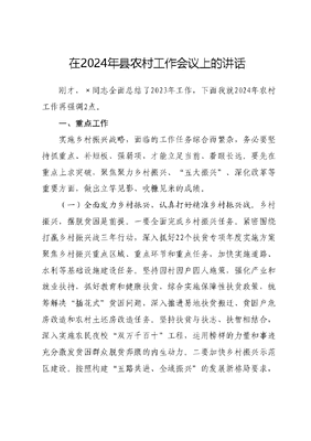 在2024年县农村工作会议上的讲话刚才,×同志全面总结了2023年工作,下面我就2024年农村工作再强调2点。一、重点工作实施乡村振兴战略,面临的工作任务综合而繁杂,务必要坚持抓重点、补短板、强弱项,才能立足当前、着眼长远。要先在重点上求突破,聚焦聚力乡村振兴、五大振兴、深化改革等重要方面,做出立竿见影、吹糠见米的成绩。(一)全面发力乡村振兴,认真打好精准乡村振兴战。乡村振兴,摆脱贫困是前提。一要全面完成乡村振兴任务。紧密围绕打赢乡村振兴战三年行动,深入抓好22个扶贫专项年度实施方案聚焦乡村振兴重点区域、重点环节和重点任务,加快实施道路、水利等基础设施建设任务。坚持因村因户因人施策,强化产业和就业扶持,抓好教育和健康扶贫,综合实施保障性扶贫政策,统筹解决插花式贫困问题,深入推进易地扶贫搬迁、贫困户危房改造和农村土坯房改造任务。坚持扶贫与扶志、扶智相结合,深入实施农民夜校双万千百十工程,运用榜样的力量和事迹充分激发贫困群众脱贫奔康的内生动力。二要加快乡村振兴示范区建设。按照构建五路共进、全域振兴的发展新格局要求,深化南路丘区乡村振兴示范区建设,以3个中心镇为支点,持续推进7个乡镇核心区建设,辐射带动周边10个乡镇加快发展,总结更多可复制、可推广的示范经验。以丘区连片乡村振兴为主攻方向大力推进示范区现代农业发展,重点培育生态循环农业、休闲创意农业、农村电商等新业态,加快推进红花园养心谷、江古镇郪等项目,打造南路精品文化旅游线路,办大办优牡丹文化节、鲁班湖文化旅游节、云台观祖师庙会、江城隍庙会等特色节会,郪切实助农增收。三要健全乡村振兴保障机制。坚持防止返贫与继续攻坚有机结合,依托×脱贫APP,全面实施乡村振兴动态监测,持续做好六个一帮扶、对口帮扶、百企帮百村、光彩扶贫等工作,扎实开展回头看回头帮,确保贫困现象不反弹、脱贫群众不返贫。建立四项扶贫基金县级补充长效机制严格规范扶贫项目资金分配、使用和管理,切实规范用好贫困村产业扶持基金和贫困户小额信贷分险基金,壮大村级特色产业和集体经济,优化利益链接模式,促进贫困户、脱贫户持续增收。拓宽乡村振兴一线干部培养路径,加强对乡村振兴一线干部的关爱激励,让肯实干苦干、群众满意的干部得到重点培养、优先提拔。(二)大力推动产业振兴,加快建设现代农业强县。产业振兴是乡村振兴的支柱,缺乏产业支撑,美丽乡村就是无源之水、无本之木。必须牢牢抓住产业振兴这个牛鼻子,以发展现代农业园区为重点,深入完善3+2现代农业产业体系,加快创建现代农业强县。一要分类分层打造现代园区。在提升农业综合生产能力的基础上,调整优化现代农业产业布局,连片式、规模化打造现代农业园区。县级层面,聚焦麦冬、藤椒、生猪、粮油、蔬菜五大产业,依据东西南北中五路片区资源禀赋、区位条件、产业基础等因素,分产业分片区打造一批产业特色鲜明、产业链条完善、设施装备先进、生产方式绿色、品牌影响力大、辐射带动有力的星级现代农业园区。各乡镇要规划建设1-2个千亩、万头现代农业园区,带动产业结构、品种结构、品质结构调整优化,助力全县现代农业形成由点到线到面的园区发展格局。二要创新园区管理运行机制。将园区作为发展现代农业的综合载体,健全涉农项目资金整合等机制,形成政策叠加的洼地效应,引导资本等现代生产要素向园区集聚。按照管委会+农业公司+乡镇模式推进园区建设,探索成立现代农业园区管委会,统筹园区日常管理事务;组建农业投资公司,依法归集全县国有农业资源、资产等,寻找提供恰当投资契机;园区所在乡镇积极支持,实现共建共享。加快园区生产技术、生产模式变革,推动传统精耕细作与现代装备技术深度融合,因地制宜选择种养结合、粮经轮作等多种生态循环农业模式,完善农业社会化服务体系,健全农产品质量安全监管体系和可追溯体系,提高现代农业园区发展质量效益。三要健全产业链延伸价值链。围绕一二三产业融合发展,推动园区产业增值。抓好粮头食尾、农头工尾,实施农产品加工业提升行动,加快麦冬大健康产业园等现代农业融合发展示范园建设,推进农产品就地就近清洗、冷藏、烘干等商品化处理。大力培育知名农产品品牌,开展农产品地理标志和绿色食品、有机食品标志创建。深入开展互联网+现代农业示范行动,建立完善物流、仓储等服务体系,让潼川豆豉、金鼓粉条等一大批特色农产品真正走出去。实施园区变景区、田园变公园、家园变花园、农房变客房、产品变商品五变行动,推进农业与旅游休闲、农耕体验等服务业态深度融合,进一步延伸农业价值链。四要发挥园区示范带动作用。现代农业园区既是现代农业发展的支撑点,也是助农增收的试验田。要协调利益关系,健全利益联结机制,完善大园区+小业主+农户龙头企业+基地+农民模式,通过就业带动、保底分红、股份合作等形式,让农民稳定长期合理分享全产业链