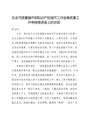 在全市质量强市和知识产权强市工作会暨质量工作考核推进会上的讲话同志们:今天,我们召开全市质量强市和知识产权强市领导小组第一次会议暨2023年质量工作考核工作推进会,主要任务是:全面落实《质量强国建设纲要》及我省实施意见,按照全省质量发展大会的安排部署,认真分析存在问题,深入开展质量提升行动,加快推进质量和知识产权强市建设工作;同时,对照2023年考核标准,深入分析存在的问题和漏洞,进一步压实工作责任,高标准严要求、高质量做好2023年质量强市综合考核的迎检准备工作。党的XX大报告指出,高质量发展是全面建设社会主义现代化国家的首要任务,要求加快建设质量强国;2023年2月,中共中央、国务院发布《质量强国建设纲要》,作为首个由党中央、国务院印发的质量工作中长期纲领性文件,确立了新时期质量工作的新方位,掀开了新时代建设质量强国的新篇章;此次全省质量发展大会对推动×制造、×建造、×服务提质升级,加快形成新质生产力,持续增强产业质量竞争力,为推进中国式现代化的×实践提供有力的质量支撑作出了明确要求,强调品牌是质量的象征、信誉的凝结;省长强调,要聚焦四新四化等重点领域,加快提升产品、工程和服务质量,加强质量品牌建设下大力提升供给体系质量。要充分发挥企业质量建设主体作用,激励引导企业加大质量技术创新投入,推动数字化转型,加强知识产权保护,着力营造公平竞争、优胜劣汰的市场环境。XXXXXX的重要论述和省长批示指示,既包含经济社会发展的宏观质量,也包括具体的产品和服务质量,涵盖了质量领域的方方面面,为我们指明了前进方向、提供了根本遵循。刚才,我们认真学习了全省质量发展大会和《质量强国建设纲要》及我省实施意见精神,×同志《市2023年度质量强市综合考核工作方案》进行了全面解读并对迎检工作进行了安排部署,我完全同意,下面,就如何做好有关工作,我再提两点建议,与大家一同抓好落实。一、肯定成绩,找准差距,切实增强做好质量强市和知识产权强市工作的信心决心近年来,市委市政府认真贯彻落实国家、省、×市关于质量发展和知识产权强市的各项决策部署,坚持把质量放在经济社会发展的突出位置,着力推动高质量发展,加快质量强市建设,全市质量工作取得了一定成绩。一是质量提升行动和知识产权强市工作取得明显成效。2023年,全市深入实施质量强市战略,大力开展产品、工程、服务、环境质量提升行动,县级工业产品抽检92批次,合格率93.5%;新开工建筑工程质量监督覆盖率、建筑工程竣工验收合格率均达100%;注册商标7545件,注册地理标志证明商标1件(×火腿),获得地理标志产品11个;各行业知识产权认定取得了很好的成绩,如:有机认证证书17张,全国排名376名,全省排名16名;食品农产品认证证书37张,全国排名1273名,全省排名20名。取得这些成绩,是我们×各家部门通力协作的结果,是我们扶持企业发展,助推企业成长的具体体现!二是质量工作基础能力建设持续加强。截至目前,全市已有省级检验检测中心2个、县级检验检测中心1个、机动车检验检测机构12个,生态环境检测机构1个,建材及其他类检验检测机构9家,检验检测能力明显增强;通过稳步推进市质量基础设施一站式服务试点建设,夯实质量基础综合服务设施地基营商环境得到进一步优化,服务效能和质量得到进一步提升。三是质量安全工作总体稳定,2022年以来,全市未发生食品药品特种设备安全和工业产品质量安全事故。虽然取得了一定成绩,但对照国家、省和×市的要求,对标发达地区,我市质量和知识产权工作还存在不少短板。一是质量基础还不够扎实。标准体系不完善,计量、标准、认证认可、检验检测等技术支撑能力不足,专业人才匮乏。二是质量发展工作不平衡。产业整体处于价值链中低端,企业规模不大,高新技术产业较少,与发达地区还有较大差距,供给体系有待进一步优化三是质量风险依然存在。企业管理人员和从业人员素质参差不齐企业的重视程度不够,质量意识不强,管理水平不高,质量把关不严,导致企业抵御质量风险的能力不足。四是品牌培育有待进一步加强。好的产品需要好的品牌,但我市很多企业规模不大、标准化程度低、品牌附加值弱、市场占有率小的问题还比较突出大家要高度重视、正确认识这些问题,牢固树立质量发展意识,找准差距、迎头赶上,加快建立现代质量治理体系,为实现高质量发展提供坚强的质量保证。二、提高站位,补齐短板,认真做好首次质量综合考核迎检工作,为质量考核迎检提供有力保障大家都知道,我市的质量工作考核成绩一直以来都很优秀,自×市实施质量考核以来,我市质量工作考核稳居×市第一方阵(2016年、2017年、2019年、2020年、2021年排名全市第一,2022年未开展考核)。2023年,根据全省质量发展大会的安排,首次将知识产权、食品和药品工作纳入质量综合考
