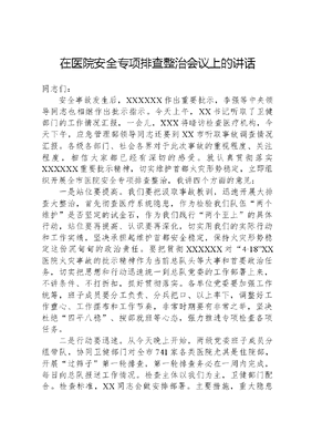 在医院安全专项排查整治会议上的讲话同志们:安全事故发生后,XXXXXX作出重要批示,李强等中央领导同志也相继作出批示指示。今天上午,XX书记听取了卫健部门的工作情况汇报,一会儿,XXX将暗访检查医疗机构,今天下午,应急管理部领导同志还要到XX市听取事故调查情况汇报。各级各部门、社会各界对于此次事故的重视程度、关注程度,相信大家都已经有深切的感受。就认真贯彻落实XXXXXX重要批示精神,切实维护首都火灾形势稳定,立即组织开展全市医院安全专项排查整治,我讲四个方面的意见:一是站位要提高。我们要把汲取事故教训,迅速开展大排查大整治,首先彻查医疗系统隐患,作为检验我们队伍两个维护是否坚定的试金石,作为我们践行两个至上的具体行动,站位要再提高、认识要再深化,切实用我们的实际行动和工作实绩,坚决承担起维护首都安全稳定,保持火灾形势稳定这份沉甸甸的政治责任。要把贯彻XXXXXX对4·18XX医院火灾事故的批示精神作为当前总队头等大事和首要政治任务,切实把思想和行动迅速统一到总队党委的工作部署上来,不讲条件、不打折扣,抓好贯彻落实。各单位党委要加强工作统筹,班子成员要分工负责、分兵把口、以上率下,调整好工作重心、工作摆布和工作节奏,非常时期要有非常之举,坚决杜绝四平八稳、按部就班等心态,强力推进专项检查各项任务。二是行动要迅速。从今天晚上开始,两级党委班子成员分组带队,协同卫健部门对全市741家各类医院尤其是住院部,开展过筛子第一轮排查,第一轮排查务必在一周内完成,每日向总队报送工作情况。检查主体以我们为主,卫健部门配合。检查标准,XX同志会做安排部署。主要措施,重大隐患落实五停整治措施,突出火灾隐患落实五限整治措施,一般火灾隐患落实五立改整治措施,分三类情况依法依规抓实隐患整改。对于排查发现的问题属于五限、五立改的情况,依法依规督促立即整改或限期整改;对于属于五停的情况,统一报排查领导小组,由排查领导小组评估后,依法报请市区两级政府决定,执行局部关停或整体关停,并提前做好患者转院治疗等工作,严防发生涉稳事件。XXX同志在昨天的部党委会上指出:要围绕提高隐患排查整治质量和强化安全责任落实,推动各地各有关部门严格重大事故隐患闭环销号管理,加大现场核查力度,防止出现一报了之、纸面整改。XX部长的讲话针对性、指导性很强,为我们做好专项检查工作指明了方向、提供了遵循。各单位要按照XX部长讲话精神,依法依规把握工作节奏和工作方式,紧盯隐患问题,强化督导检查,力戒形式主义,树牢严实作风,通过四不两直、明察暗访等方式,形成高压震慑态势,坚决做到安全责任不落实不放过,隐患排查不到位不放过,问题整改不彻底不放过,责任追究不到底不放过,确保问题清仓见底、隐患挂账销号。三是作风要严实。本次专项检查实行谁带队谁负责,谁检查谁负责,将741家医院全部实名制分配到两级党委班子成员。具体分工时,考虑各区医院分布不均、各支队力量不一等情况,原则上以各区为主,对本辖区的医院情况更为熟悉,有的也会跨区安排,请XX同志组织具体分工。两级班子成员人人有任务、人人有责任,千斤重担大家一起挑。《医疗机构安全隐患大排查大整治工作方案》和具体任务分工很快会下发。要在抓好专项检查工作的同时,同步推进主题教育、全国两会精神学习宣贯、队伍改革整合、基层基础建设等重点任务,做到两手抓、两促进。特别是,要严抓队伍管理,当前队伍内部出现任何问题,都容易引发连锁反应,影响队伍形象。各单位要紧盯人车酒、网电密、远散直等重点环节和清明假期临近等特殊时期,细致排查内部风险隐患、及时纠正苗头问题,文可居文库——海量学习资料,手机电脑均可下载www.wenkeju.com坚决做到不失控、不漏人,消除盲区死角,确保队伍高度安全稳定。四是效果要显著。通过这次排查整治,要实现全市所有医院突出隐患清仓见底。具体的方法,除了我们依法依规采取警示、约谈、罚款、查封、拘留等措施,重大隐患报请政府同意采取三停措施外,还要灵活运用多种方式,在报请政府同意的情况下,可视情将医院重大安全隐患向社会公告,同时,抄告纪委监委和医院上级主管部门。在积极履行部门职责的同时,最大限度提请各级党政,协同相关行业部门,全力调动各方面有利消除隐患的积极因素,形成隐患整治的强大合力,保证整治工作取得扎扎实实的成效,全面净化我市医院安全环境,坚决确保安全。我就讲这些。文可居文库——海量学习资料,手机电脑均可下载www.wenkeju.com