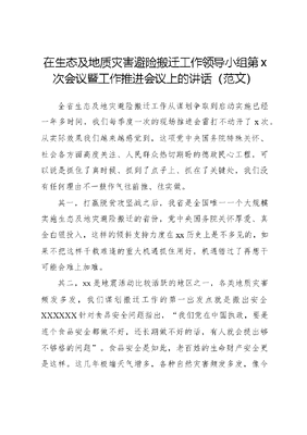 在生态及地质灾害避险搬迁工作领导小组第x次会议暨工作推进会议上的讲话(范文)全省生态及地灾避险搬迁工作从谋划争取到启动实施已经一年多时间,我们每季度一次的现场推进会雷打不动开了x次。从实际效果我们越来越感觉到,这项党中央国务院特殊关怀、社会各方面高度关注、人民群众热切期盼的德政民心工程,可以说是抓住了真时候、抓到了点子上、抓在了关键处,我们没有任何理由不一鼓作气往前推、往实做。其一,打赢脱贫攻坚战之后,我省是全国唯一一个大规模实施生态及地灾避险搬迁的省份,党中央国务院关怀厚爱、真金白银投入,这样的倾斜支持力度在xx历史上是不多见的,如果不把这样千载难逢的重大机遇抓住用好,机遇错过了再想干可能会难上加难。其二,xx是地震活动比较活跃的地区之一,各类地质灾害频发多发,我们谋划搬迁工作的第一出发点就是搬出安全XXXXXX针对食品安全问题指出,我们党在中国执政,要是连个食品安全都做不好,还长期做不好的话,有人就会提出够不够格的问题。食品安全是如此,老百姓的生命财产安全更是这样。这几年极端天气增多,各种自然灾害频发多发,像今年xx县连续两次遭受暴洪灾害,造成人员伤亡。如果不尽快实施整体搬迁,仍然停留在头痛医头、脚痛医脚的治标不治本状态,年年建年年毁、群众年年担惊受怕是必定无疑的,我们各级大量的时间和精力可能都会耗在防灾减灾、抢险救灾上,其中的利弊得失,孰轻孰重,大家应该是能掂量清楚的。其三,XXXXXX把生态文明建设提到中华民族永续发展根本大计的高度,我省生态地位重要,但生态基础和本底十分脆弱,在全国都非常典型。我们把在生态敏感区、自然保护地核心保护区、饮用水水源一级保护区内的群众搬迁出来,最大限度降低人为活动对自然的扰动,实现为土地松绑、给生态减负,这是我们深入贯彻XXX生态文明思想的最好体现。其四,当前内外部环境特别是经济环境复杂严峻,经济下行压力进一步加大,我省是化解地方政府债务任务最重的xx个省份之一,政府投资项目受限,投资增速受到影响,今年我省的固定资产投资增速x—x月是xx.x%、x—x月是x.x%、前三季度是x.x%,呈逐月下降态势。我们要稳住投资、促进增长,实现全年发展目标任务,就必须找到有力抓手和有效引擎,这里面生态及地灾避险搬迁、和美乡村和高标准农田建设都是方向、都是抓手,其中生态及地灾避险搬迁具有扩投资、促消费、保民生等多重效应,是国家当前支持的主要领域,也是填补缺文可居文库——海量学习资料,手机电脑均可下载www.wenkeju.com项、对冲影响的不二选择。研究表明,一个进城人口的市民化,仅市政公共服务的配套,大约要xx万元,高的能够带动xx万元的城镇固定资产投资,城镇化率每提高x个百分点,可拉动投资增长x.x个百分点。从消费来看,据测算,目前城乡居民的消费水平比大概是xx∶,即一个城镇居民大概相当于x个农民的消费,城镇化率每提高x个百分点,可拉动最终消费增长约x.x个百分点。拿我们今年搬迁的x万户约xx万人来说,每户财政补助xx万元,最保守的估计就是xx个亿的投资,如果搬迁对象当中有一半人进城安置,至少能带动几百亿的城镇固定资产投资,同时,还可以扩大建材、家电、家具、床上用品、生活用品等消费规模,并随着搬迁群众收入增长,为长期消费蓄积能量,各级政府都要算好这本大账。其五,XXXXXX20xx年来我省视察,在看望古浪县黄花滩生态移民区群众时指出,让老百姓生活更幸福就是共产党的事业。xx的城乡差距、收入差距都比较大,提升老百姓生活品质是各级政府义不容辞的责任。为此,省里始终把生态及地灾避险搬迁工作,作为增进民生福祉的头等大事和德政工程来抓,我每次到各地调研,搬迁项目都是必看的点,今年以来先后x次专门调研生态及地灾避险搬迁工作,搬迁群众满满的幸福感和满意度都是挂在脸上的,真是一步住到新房子、快步文可居文库——海量学习资料,手机电脑均可下载www.wenkeju.com享受新便利、大步迈向新生活,对这样群众拍手称快的实事、好事,我们何乐而不为,何乐而不早为,何乐而不快为!今天,我们以视频会+现场会的形式召开领导小组第六次会议暨工作推进会,推动各地进一步相互学习、比学赶超。上午,大家现场观摩了xx县生态及地灾避险搬迁工作的创新做法和特色亮点,刚才又观看了xx市的搬迁工作宣传片,xx市、xx县、xx县作了交流发言,他们干得好,讲得好,各有特色、各有亮点,特别是在如何精准认定、科学选址、降低成本、强化配套等方面的经验做法可学可看可复制,具有较强的示范性、带动性,希望大家积极借鉴、取长补短。xx县、xx市作了表态发言,xx县拆旧复垦进度缓慢,xx市搬迁对象认定不准、频繁调整,都对全省工作造成了影响。大家一定要保持定力、咬住不放,工作干得好的要巩固提升、再接再厉,工作后进的要知耻后勇