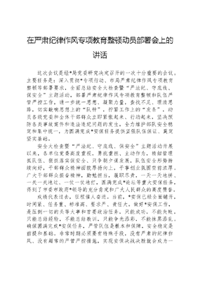 在严肃纪律作风专项教育整顿动员部署会上的讲话这次会议是经*局党委研究决定召开的一次十分重要的会议。主要任务是:深入贯彻*专项行动、市局严肃纪律作风专项教育整顿等部署要求,全面总结安全大检查暨严法纪、守底线、保安全主题活动,部署严肃纪律作风专项教育整顿和队伍严管严控工作,进一步统一思想、凝聚力量,查找不足、理清思路,切实敲响思想上的队钟,拧紧工作上的发条,动员各级党委和全体干部群众立即紧张起来、行动起来,坚决预防各类事故案件和违法违纪问题的发生,全力维护部队安全稳定和集中统一,为圆满完成*安保任务提供坚强队伍保证、奠定坚实基础。安全大检查暨严法纪、守底线、保安全主题活动开展以来,各单位党委高度重视,勇挑重担、主动作为,精细管理抓队伍、狠抓落实保安全、只争朝夕谋发展,队伍安全形势持续向好,干部群众精神面貌昂扬向上,干事创业氛围空前浓厚。广大干部群众振奋精神,勤勉担当,履职尽责,一天一天地拼、一关一关地过、一仗一仗地打,圆满完成*论坛等重大安保任务,得到了市委市政府*领导的充分肯定和广大人民群众的高度赞誉。成绩代表过去,征程催人奋进。当前,*安保已经全面铺开,时间紧、任务重、标准高、要求严、责任大。做好*安保工作,是压倒一切的头等大事和首要政治任务,只能成功,不能失败,只能总结经验,不能总结教训,只能争光添彩,不能抹黑添乱。确保圆满完成*安保任务,严管队伍是根本和保障,安全稳定是前提和基础。非常时期必须要有特殊手段,没有严肃的纪律作风、没有超常的严管严控措施,实现安保决战决胜就会成为一句空话。在此关键时刻,各单位党委要牢牢把握对党忠诚、服务人民、执法公正、纪律严明的总要求,坚持四个第一理念,切实以首善标准、万无一失、一失万无标准和细致、精致、极致的标准抓队伍、保安全、护稳定,坚决消除一切安全隐患,坚决荡涤一切麻痹思想,坚决排除安保中的隐形炸弹,心无旁骛、全力以赴投入*安保工作中,坚决实现大事不出、小事也不出的目标,以优异成绩迎接*胜利召开。下面,我代表*局党委就开展严肃纪律作风专项教育整顿暨队伍严管严控工作再强调几点意见。一是提升政治站位,坚决守纪律讲规矩,切实增强抓队伍管理教育的责任感和紧迫感。要充分认清形势。各级党委务必认清队伍管理教育形势的艰巨性、复杂性,务必认清维护安全稳定的重要性、紧迫性,切实站在讲政治、顾大局的高度,保持如履薄冰、如坐针毡的紧迫感和危机感,以超常规措施推动严肃纪律作风专项教育整顿和队伍严管严控工作措施落地见效。要敢于担当负责。各级领导班子和领导干部要切实强化严是爱、松是害的理念,带头践行五个亲力亲为,敢于担当,履职尽责,敢抓敢管,严抓严管,做到操心、尽心、精心、细心,不能当糊涂官、太平官、享乐官。要逐级压实责任。各级党委要严格落实抓班子、带队伍、保安全的主体责任,各级政治主官要切实担负起抓队伍的第一责任,单位其他领导班子成员要认真落实一岗三责,坚持谁主管谁负责、谁带队谁负责、谁审批谁负责,切实履行好管理、教育、监督责任,形成齐抓共管良好局面。二是突出防范重点,紧盯关键环节,努力营造风清气正、安全稳定的良好环境。要以开展严肃纪律作风专项教育整顿和落实战时队伍严管严控十项措施为抓手,突出抓好执法队伍整治。深入推进公正执法护平安专项活动暨监督执法突出问题专项整治回头看,组织防火监督执法干部进行集中整训,全面分析队伍形势,查找摸排重点人,加强廉政队示教育,研究文可居文库——海量学习资料,手机电脑均可下载www.wenkeju.com制定规范廉洁执法措施,切实解决监督执法工作中存在的不公不廉不作为等突出问题。突出加强重点人员管控。针对长期外借人员、有嗜酒习惯、社会交往复杂、家庭发生矛盾、自控能力差、干部群众关系紧张、遵章守纪意识差等重点关注对象开展谈心谈话,落实帮扶帮教工作,及时消除影响安全稳定的隐形炸弹,切实把人管住。突出开展涉酒问题整治。全面加强队示教育,以案说法,增强干部群众的自律意识、自控能力;对饮酒报备人员要加强跟踪管理,强化事前事中事后管理,确保人人、时时、处处都在管控之中;要加大召回测酒力度和频次,严格执行纪律规定,严防发生涉酒违纪问题,切实把酒管死。突出抓好交通安全管理。强化对前置动态执勤车辆、公务车、私家车的管理,严格落实驾驶员思想分析和每日测酒、车辆外出审批和动态跟踪、干部跟车和车辆强制保养等制度,对所有驾驶员开展交通安全教育,深入查纠交通违章行为,切实把车管严。三是强化管控措施,落实精细管理,切实提高队伍严管严控的精准度和安全度。法纪教育要入脑入心。持续深化党纪政纪、法律法规、条令条例和各项禁令队规学习教育,尤其是加强违法违纪典型案例的队示教育,引导干部群众牢固树立法纪红线不能触碰、法纪底线不能逾越的观念,