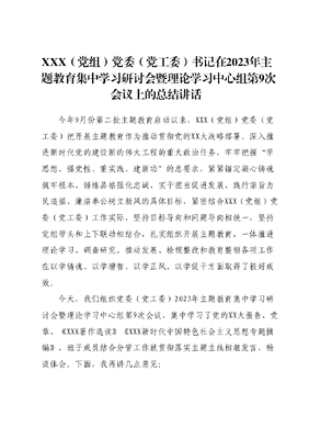 XXX(党组)党委(党工委)书记在2023年主题教育集中学习研讨会暨理论学习中心组第9次会议上的总结讲话今年9月份第二批主题教育启动以来,XXX(党组)党委(党工委)把开展主题教育作为推动贯彻党的XX大战略部署、深入推进新时代党的建设新的伟大工程的重大政治任务,牢牢把握学思想、强党性、重实践、建新功的总要求,紧紧锚定凝心铸魂筑牢根本、锤炼品格强化忠诚、实干担当促进发展、践行宗旨为民造福、廉洁奉公树立新风的具体目标,紧密结合XXX(党组)党委(党工委)工作实际,坚持目标导向和问题导向相统一,坚持党组带头和上下联动相结合,扎实组织开展主题教育,一体推进理论学习、调查研究、推动发展、检视整改和教育整顿各项工作在以学铸魂、以学增智、以学正风、以学促干方面取得了较好成效。今天,我们组织党委(党工委)2023年主题教育集中学习研讨会暨理论学习中心组第9次会议,集中学习了党的XX大报告、党章、《XXX著作选读》《XXX新时代中国特色社会主义思想专题摘编》,班子成员结合分管工作就贯彻落实主题主线相继发言,畅谈体会。下面,我再讲几点意见:主题教育工作时间已经过半,全XXXX要按照要求,抓住进度提高质量、突出效果,确保主题教育高质量推进。重点提示几项工作。第一,始终坚持牢牢把握主线,深入学习思考。学习是我们的首要任务,XXX委近期已经全面加强了主题教育巡回指导督导工作,全X各级党组织和党员干部要以学习贯彻XXX新时代中国特色社会主义思想为主线,认真收集归档学习资料、深入学习研讨、规范学习笔记记录、亲自拟草发言材料等,围绕主线深学细悟,真正做到学懂弄通做实、真学真懂真信真用。第二,始终坚持深入调查研究,找准问题症结。调查研究是抓好主题教育的前提和基础。要对照学习贯彻XXX新时代中国特色社会主义思想主题教育要求,对照学习贯彻XXX新时代中国特色社会主义思想要求,结合各自调研主题,真正扑下身子,深入基层一线,把问题找准找实,认真解剖麻雀,拿出破解实招硬招抓好成果交流运用。第三,始终坚持深刻对照检查,剖析存在问题。近期我们将开展XXX、第XXX次理论学习中心组专题研讨会等规定动作,各级党委(党组)要按照X委主题教育办工作提示要求,深刻对照XX,认真查找问题,逐一剖析根源,抓好各项准备落实。第四,始终坚持回应群众期待,办好群众实事。开展好主题教育的重要任务中,关键的一个就是注重解决群众最急最忧最盼的紧迫问题。全XXXX要坚持以人民为中心的发展思想,集中力量办好群众烦心事操心事揪心事,一件件办实,不能滥竽充数。第五,始终坚持突出质量标准,抓好专项整治。紧盯XXX专项整治任务,严格整治标准,找准找全问题,完善整治台账,逐条逐项推进落实销号。对于能够马上解决的问题,要立行立改、即知即改;对一时解决不了的,要盯住不放,持续整治。最后,按照近期主题教育的重点工作,我再强调一下,各级党员干部要切实扛起主题教育主体责任,坚持将理论学习,调查研究,推动发展,检视整改贯穿主题教育全过程,确保学习贯彻XXX新时代中国特色社会主义思想主题教育取得实效。要加强统筹调度,定期研究部署,重点抓好专项整治工作,本着问题去盯着问题改,切实做到真改实改彻底改。要加强上下联动,从源头解决问题,很多查摆出来的问题其实是病症在下面、病根在上面,单靠XX、部门是难以解决的,要建立完善上下联动机制把主题教育XX与XX回头看、XXX问题联动整改。要紧盯夺取XXX乡村振兴,严肃驻村工作纪律,强化作风建设,抓紧抓实XXX、人居环境整治等工作,确保抓在日常、抓在经常。要加强督导检查,充分发挥X委巡回指导组督导作用,有针对性进行分类指导,精准指导;要及时下发工作提示单,抓好各项工作统筹推进总之,我们要以学习贯彻XXX新时代中国特色社会主义思想为主线,严格对标对表中央和XXXX要求部署,高标准、高质量抓好主题教育各项工作,持续把全X各级党组织和党员干部在主题教育中激发出来的热情,转化为推动经济高质量发展的强大动力。我的发言完毕,谢谢。