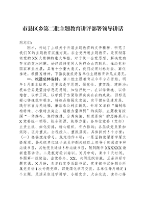 市县区乡第二批主题教育讲评部署领导讲话同志们:刚才,传达了上级关于开展主题教育的文件精神,研究了我们X的主题教育实施方案。在全党开展主题教育,是贯彻落实党的XX大精神的重大举措,对于统一全党思想、解决党内存在的突出问题、始终保持党同人民群众血肉联系、推动党和国家事业发展,具有十分重大意义,我们必须对标对表、高位推进。根据X精神,下面我就抓好X单位主题教育讲几点意见。一、吃透总体安排。第二批主题教育从今年9月开始,明年1月基本结束。总要求是学思想、强党性、重实践、建新功;根本任务是坚持学思用贯通、知信行统一,在以学铸魂、以学增智、以学正风、以学促干方面取得实实在在的成效;目标是凝心铸魂筑牢根本,锤炼品格强化忠诚,实干担当促进发展,践行宗旨为民造福,廉洁奉公树立新风。针对X单位编制结构特殊、小散特点突出、组教力量薄弱的实际,主题教育按照一体摆布、集约推进、分类实施、贯通落实的思路展开:X党委统一领导、统合资源、统筹力量;各单位党委(支部)主责主抓、细化安排,精心组织、有力推动;各层级党员紧扣实际、区分重点,全程投入、重抓落实。具体抓好5个方面:(一)抓实理论学习。规定动作4项:一是坚持读原著学原文悟原理。县处级单位班子成员和副处级以上领导干部通读9种必读书目,其他党员通读5种必读书目,随到随学XXXXXX最新重要讲话。二是抓好轮训培训。X月中旬,集中7天时间,参照第一批做法,由党委办、XX、共同组织实施。三是讲好专题党课。X月份,各单位党委正副书记、党支部书记分别为所属党员讲1次专题党课。四是深化学习交流。各单位每月确定1个主题,灵活采取述学讲学、小组发言、大会交流、读书心得展评等形式,检验理论学习实效。(二)准确把脉施策。规定动作3项:一是深入把脉问诊。党委班子成员每人形成1篇研究报告。二是典型案例剖析。11月份,结合单位实际确定1个正面案例和1个反面案例,组织案例剖析和复盘检讨,通过解剖一个问题,推动解决一类问题。三是推动成果转化。12月份,党委班子召开研究成果交流会,建立调研成果转化运用责任清单。(三)全力推动发展。规定动作4项:一是坚持向X用力破难题。结合参加年度发展目标和重大建设任务,复盘检讨总结反思在推进任务落实中的差距不足,进一步提升服务支撑高质量发展能力。二是坚持大抓基层固根基。紧盯X项工作和X个突出持续用力,研究加强和改进自身建设的措施。年底前,X各级党委结合考核干部、帮建班子和全面从严治党形势分析,对X单位党委(支部)落实全面从严治党主体责任进行检查评价。三是坚持岗位建功做贡献。贯穿全程开展立足岗位做贡献活动,X月底,遴选先进典型代表作事迹介绍;X月中旬,组织到基层锻炼的机关人员围绕岗位建功交流体会心得。四是坚持基层至上办实事。动态调整X党委机关和X单位为基层办实事计划,年底前组织对困难党员帮扶救济。(四)深入检视整改。规定动作3项:一是开展清单治理。各单位要制定一本问题清单,并强力推动清单问题整改见底清零。二是组织专项整治。X月份,量力而行确定专项整治方案,抓好党中央、省委党委常规巡视反馈问题整改,下力纠治网赌网贷、酒驾醉驾、不正当交往等倾向性问题。三是召开专题民主生活会(组织生活会)。区分县处级级单位党委、党支部、党员3个层次搞好党性分析,明年1月底前完成。(五)搞好建章立制。主题教育结束前,制定和落实巩固深化主题教育成果的长效机制,健全完善学习贯彻党的创新理论制度机制。总之,整个主题教育不划阶段、不分环节,把理论学习、把脉施策、推动发展、检视整改等贯通起来、一体推进。各单位要对照X单位实施方案,结合实际把各个规定动作的内容充实起来,对时间、内容和重点解决的问题进行细化明确,什么时间干什么事搞得清清楚楚,一项一项盯着抓落实。二、把握关键重点。XXXXXX强调指出,第二批主题教育要更加注重理论武装、更加注重分类指导、更加注重强基固本、更加注重领导指导,特别是要解决实际问题,防止出现形式主义等不良形象,把主题教育抓出高质量好效果。我们要认真学习领会、贯彻落实XXXXXX重要指示,以高度负责的精神把主题教育谋划好、组织好。一是要分层分类组教。要针对不同层级、不同领域、不同对象实际,合理安排、精准组教。县处级单位党委班子及副处级以上干部是必须突出抓好的重点,参加主题教育的要求与第一批是相同的,要抓好5个方面17项具体工作,(5个方面:抓实理论学习、准确把脉施策、全力推动发展、深入检视整改、搞好建章立制;17项具体工作:读原著学原文悟原理、理论轮训、专题党课、学习交流、把脉问诊、典型案例剖析、研究成果交流、服务基层破难题、大抓基层固根基、开展立足岗位做贡献活动、办实事解难题、开展清单治理、组织专项整治、整治基层不良现象、党性分析、召开专题民主生活会、建章立制),每个动作都要落实好。党支