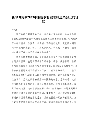 在学习贯彻2023年主题教育读书班总结会上的讲话同志们:按照这次主题教育的安排,我们集中安排时间,举办了学习贯彻XXX新时代中国特色社会主义思想主题教育读书班,让大家沉下心来认真学、认真思、认真悟,取得良好效果。交流研讨期间大家积极踊跃发言,讲了不少真知灼见,有高度、有内容、能落实,体现了理论水平和实践能力的提升。举办主题教育读书班,是贯彻落实市委关于主题教育部署要求的具体实践,也是发挥领导干部领学、带学、促学作用,推动全局主题教育走心走深走实的重要举措。经过6天紧张的学习,读书班高质量地完成了各项培训任务。行百里路半九十,接下来X月X日和X月X日的第三阶段两堂专题授课,请大家再接再厉,认真学习,为此次读书班画上一个圆满的句号。总的来看,这次读书班深化了思想认识,强化了理论武装,锤炼了党性素养,凝聚了奋进力量,达到了预期效果,有4个突出特点:一是主题鲜明举办这次读书班就是要集中时间、集中精力,深入学习贯彻XXX新时代中国特色社会主义思想,系统把握这一思想的世界观、方法论和贯穿其中的立场观点及方法,推动主题教育走深走实,夯实团结奋斗的共同思想基础,凝心聚力奋进新征程、建功新时代读书班方向性、目标性非常明确。二是内容丰富。这次读书班既有专题辅导、又有课后自学,既有集中研读、又有交流研讨,课程内容丰富、安排科学合理,针对性很强。三是学风优良。大家十分珍惜这次难得的学习机会,坚持组织管理与自我管理相结合严格按照读书班安排参加学习,深入广泛思考,积极踊跃发言,真正把精力放在了学习上,展示了我局党员干部良好的作风学风四是思考深入。在发言中,大家结合工作实际,坚持把自己摆进去、把思想摆进去、把职责摆进去、把工作摆进去,认真思考、精心准备、深入交流、相互取经,达到了互学、互促、互鉴的目的。通过学习,大家对党的创新理论有了更深刻的认识。XXX新时代中国特色社会主义思想,坚持把马克思主义基本原理同中国具体实际相结合、同中华优秀传统文化相结合,科学回答一系列重大时代课题,以全新的视野深化对共产党执政规律、社会主义建设规律、人类社会发展规律的认识,开辟了马克思主义中国化时代化新境界,是推动新时代伟大实践、引领新时代伟大变革的强大思想武器,必须深切感悟党的创新理论的真理力量和实践伟力坚持不懈在学懂弄通做实上下功夫,内化于心、外化于形,做到学思用贯通、知信行统一,更好用以武装头脑、指导实践、推动工作。通过学习,大家对两个确立决定性意义有了更深刻的领会。党的十八大以来,党和国家事业取得历史性成就、发生历史性变革。以XXX同志为核心的党中央团结带领人民,攻克了许多长期没有解决的难题,办成了许多事关长远的大事要事,推动实现中华民族伟大复兴进入不可逆转的历史进程,在党史、新中国史、改革开放史、社会主义发展史、中华民族发展史上具有里程碑意义。辉煌成就的取得,根本在于XXXXXX的掌舵领航,有XXX新时代中国特色社会主义思想的科学指引。两个确立是党在新时代取得历史性成就、发生历史性变革的决定性因素,已经深深扎根于亿万人民心中。有XXXXXX领航掌舵,有XXX新时代中国特色社会主义思想科学指引,我们一定能夺取一个又一个伟大胜利通过学习,大家对坚决做到两个维护有了更深刻的理解。X年和X年,XXXXXX两次视察XX,亲自为XXX发展把脉定向,亲手为XXX描绘了XXXXXX的发展蓝图,为XXXX建设和发展提供了根本遵循指明了前进方向,成为英雄城市再创辉煌的航向指引和不竭动力我们一定要把XXXXXX的关心关怀转化为高度的政治自觉、思想自觉和行动自觉,认真贯彻落实市委、市政府的部署要求,进一步解放思想、奋发进取,不断推动工作迈上新台阶。开展主题教育,是今年党的重大建设任务,读书班结束后,还有大量的工作需要抓紧做好。要以此次读书班为新的起点,牢牢把握学思想、强党性、重实践、建新功的总要求,坚持把理论学习、调查研究、推动发展、检视整改、建章立制贯通起来有机融合,一体推进,推动主题教育不断走深走实。下面,我讲几点意见。一、要在理论学习上持续下功夫大家要自觉把学习贯彻XXX新时代中国特色社会主义思想当作一种生活习惯、当作一种精神追求。要沉下心来读原著、学原文、悟原理,深刻领会蕴含其中的马克思主义立场、观点和方法,从中获得察大势、应变局、观未来的指路明灯,获得奋斗不止、精进不怠的动力源泉,获得辨别是非、廓清迷雾的政治慧眼,获得抵御侵蚀、防止蜕变的强大抗体。要扎实推进学习常态化、制度化,深化拓展党组会第一议题制度,严格落实理论中心组学习制度,局领导班子成员要带头讲党课,做到以讲领学、以讲促学。各党支部将通过三会一课、主题党日、党建品牌创建等,推动学习贯彻XXX新时代中国特色社会主义思想往深里走、往实里走、往心里走。二、要在调查研究上持续下功夫领导干部要用好XXX