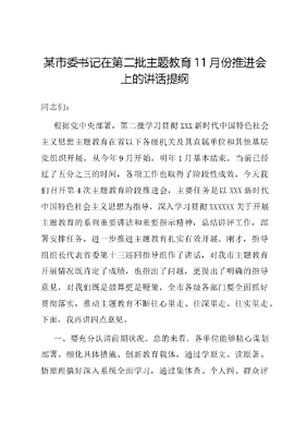 某市委书记在第二批主题教育11月份推进会上的讲话提纲同志们:根据党中央部署,第二批学习贯彻XXX新时代中国特色社会主义思想主题教育在省以下各级机关及其直属单位和其他基层党组织开展,从今年9月开始,明年1月基本结束。当前已经过了五分之三的时间,各项工作也取得了阶段性成效。今天我们召开第4次主题教育阶段推进会,主要任务是以XXX新时代中国特色社会主义思想为指导,深入学习贯彻XXXXXX关于开展主题教育的系列重要讲话和重要指示精神,总结讲评工作,部署安排任务,进一步推进主题教育扎实有效开展。刚才,指导组组长代表省委第十三巡回指导组作了讲话,对我市主题教育开展情况既肯定了成绩,也指出了问题,更提出了明确的指导意见,对我们既是鼓舞更是鞭策,全市各级各部门要全面抓好贯彻落实,推动主题教育不断往心里走、往深里走、往实里走。下面,我再讲四点意见。一、要充分认清前期状况。总的来看,各单位能够精心谋划部署、细化具体措施、创新教育载体,通过学原文、读原著、悟原理搞好深入系统全面学习,通过集体查、个人纠、群众评等方式搞好检视整治,通过上级查、本级督、下级提等方式搞好督导推进,大家在理论学习上有了新感悟、在问题整改上有了新高度、在推动工作上有了新成效,取得扎扎实实成效,但在肯定进展成效的同时,也要清楚看到还不同程度存在一些短板弱项。一是学习教育存在不够平衡的现象,有的集体学习好于个人自学,指定书目学习进度缓慢,个人学习成效不够明显,特别是基层末端的学习抓得还不够紧,一些单位没有开展专题研讨。二是问题整改存在不够深入的现象,制定的措施不具体,推进整改不力,特别是有的没有支撑材料,就整改抓整改,与实际结合不紧密,没有举一反三。三是方式方法存在不够灵活的现象,有的领导干部调研次数偏少、部分工作项目清单不够精准,把办实事泛化、简单化,将日常工作与解决群众急难愁盼问题混为一谈,请进来、走出去的方式也不够灵活,部分单位还没有邀请驻地党校的专家教授开展宣讲活动;四是宣传氛围存在不够浓厚的现象,电视、报刊和网络的宣传力度还不够,重点路段、公共场所、部分单位看不到宣传内容,部分单位上报信息质量不高,与学习教育关联不紧密,特别是部分单位对市县信息约稿反应不及时,上报素材迟缓,在出经验、出典型、出创新上存在较大距离。二、要持续抓实理论学习。要紧紧围绕学思想、强党性、重实践、建新功的总要求,牢牢把握深入学习贯彻XXX新时代中国特色社会主义思想这一主题主线和根本任务,做到以学铸魂,紧跟核心强忠诚;以学增智,理论武装强本领;以学正风,廉洁奉公强宗旨;以学促干,推动发展强担当。要牢牢把握用XXX新时代中国特色社会主义思想武装头脑,毫不松懈地反复深入学习党的XX大报告、党章、《XXX著作选读》《XXX新时代中国特色社会主义思想专题摘编》,跟进学习XXXXXX系列最新重要讲话,力求学懂弄通、学深悟透,确保将XXX新时代中国特色社会主义思想和指示精神流淌在血液中、铭记在脑海里。要结合集中自学、彼此交流、警示教育等多种方式,不断加深认识和把握历史规律、历史趋势的能力,在思想和认识上明确我们党从哪里来、到哪里去,继往开来,砥砺前行,奋斗新时代。三、要持续抓严问题整改。学习贯彻XXX新时代中国特色社会主义思想主题教育,自上而下分两批开展,第一批主题教育有些问题本级不能解决,需要下级解决。要坚持边学习、边对照、边检视、边整改,把问题整改整治贯穿始终,解决真问题、真解决问题。必须坚持问题导向,对于检视出来的问题短板,必须立足自身主动改,承接落实涉及自己的任务,上下互动、抓好整改,更要注重联动合力,联合会诊把脉的同题共答,要上下贯通、合力攻坚。要坚持边查边改,建好问题清单,逐条逐项抓好问题整改,动态更新、及时增减问题清单,对需要开展专项整治的问题,要认真制定方案,严密组织实施,努力变问题清单为满意清单。把建章立制与解决问题统一起来,既拿出当下改的举措,又善于运用制度思维和制度方式补短板、堵漏洞、固根本,形成长久立制度机制,防止问题反弹。四、要持续抓细提质增效。主题教育开展得如何,最终看效果。要坚持在实做上求成效,坚持知行合一,聚焦精准发力,动真碰硬解难题求实效。要深入把当前调查研究形成的成果进行再细化,深入查找自身在工作作风和生活作风上的不足,聚焦已经凸显的各种问题,列出问题清单,从严从实、标本兼治,加大成果转化力度,带动突出问题的有效解决。要坚持把改善人民群众生活时刻放在心上、抓在手上、扛在肩上,做到谋划实、推进实、作风实,真抓实干,拼出一流干劲,干出一流业绩,提升民生温度,让党放心,让人民满意。全体党员干部特别是领导干部要深入把当前调查研究形成的成果进行再细化,深入查找自身在工作作风和生活作风上的不足,聚焦已经凸显的各种问题,列出问题清单,从严从实、标本兼治,加大