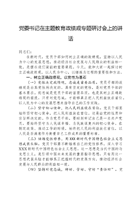 党委书记在主题教育政绩观专题研讨会上的讲话同志们:在新时代,党员干部如何树立正确的政绩观,坚持以人民为中心的发展思想,推动经济社会发展与人民群众的利益相一致,是摆在我们面前的重要课题。今天,我和大家一起探讨树立正确政绩观,以人民为中心,以锤炼为过程的重要性和方法。一、树立正确政绩观,以党性为基石(一)党性决定政绩观,忠诚是首要品质。党员干部的政绩观是由其党性所决定的。具有坚定的党性,是对党员干部的基本要求。而忠诚是党员干部的首要品质,也是其树立正确政绩观的前提。只有对党忠诚,才能够真正把人民利益放在首位,以人民为中心的发展思想来指导自己的工作实践。(二)坚守初心使命,把人民利益放在首位。党员干部要始终坚守初心使命,把人民利益放在首位。这是由党的性质和宗旨所决定的。作为党员干部,要时刻牢记自己是一名共产党员,要始终坚守为人民谋幸福、为民族谋复兴的初心使命。在制定政策、推动工作的时候,始终把人民的利益放在首位,以人民是否满意作为衡量自己工作成果的重要标准。(三)锤炼党性修养,用XXX新时代中国特色社会主义思想武装头脑。党员干部要不断锤炼自己的党性修养,深入学习XXX新时代中国特色社会主义思想。这一思想是当代中国的马克思主义,是引领中国未来发展的重要指导思想。只有用这一思想武装头脑才能够真正把握时代的发展方向,推动经济社会发展与人民群众的利益相一致。(四)坚持对党忠诚,种好、管好、守好责任田。党员干部要始终坚持对党忠诚,种好、管好、守好自己的责任田。这是由党员干部的职责所决定的。作为党员干部要认真履行自己的职责把工作做好做实做到位只有这样才能够真正做到以人民为中心的发展思想推动经济社会发展与人民群众的利益相一致。二、树立正确政绩观,以人民为中心一要为民谋幸福,把群众满意不满意作为工作标准。作为党员干部,要始终把人民放在心中最高位置,以人民为中心开展工作。这是由党的宗旨所决定的。党员干部要深入了解人民群众的需求和期望,把群众满意不满意作为衡量自己工作成果的重要标准。只有这样,才能够真正做到以人民为中心的发展思想,推动经济社会发展与人民群众的利益相一致。二要实干苦干,深入调查研究,创造实实在在的工作业绩党员干部要实干苦干,深入调查研究,创造实实在在的工作业绩,让人民群众真正得到实惠和利益。这是由党员干部的职责所决定的。作为党员干部,要深入基层,深入调查研究,了解人民群众的需求和期望,创造出实实在在的工作业绩,让人民群众得到真正的实惠和利益。只有这样,才能够真正做到以人民为中心,树立正确的政绩观。三要尊重客观规律,贯穿新发展理念,推动高质量发展。党员干部要尊重客观规律,贯穿新发展理念,推动高质量发展。这是由新时代的发展要求所决定的。新发展理念是指创新、协调、绿色、开放、共享的发展理念,这是指引中国经济社会发展的重要方向。只有遵循这些发展理念,才能够实现高质量发展,让人民群众真正得到实惠和利益。四要脚踏实地,埋头苦干,抓落实,创造实绩。党员干部要脚踏实地,埋头苦干,抓落实,创造实绩。这是由党员干部的职责所决定的。作为党员干部,要注重抓落实,创造实绩,让人民群众真正看到实实在在的成效。只有这样,才能够真正做到以人民为中心,树立正确的政绩观,推动经济社会发展与人民群众的利益相一致。三、树立正确政绩观,以锤炼为过程第一,朴素情感和对党的忠诚之心永葆对党忠诚的政治本色。朴素情感和对党的忠诚之心是党员干部树立正确政绩观的重要基础。这种情感和忠诚源于对马克思主义信仰、对共产主义远大理想、对中国特色社会主义共同理想的坚定。只有具备这种情感和忠诚才能够真正做到以人民为中心的发展思想推动经济社会发展与人民群众的利益相一致。同时,也要永葆对党忠诚的政治本色,只有这样才能够真正做到以党性为基石树立正确的政绩观,推动事业发展和社会进步。第二,理性自觉源于对马克思主义信仰、对共产主义远大理想、对中国特色社会主义共同理想的坚定。理性自觉是党员干部树立正确政绩观的必备素质,它源于对马克思主义信仰、对共产主义远大理想、对中国特色社会主义共同理想的坚定。只有具备这种理性自觉才能够真正理解党的路线方针政策并将其贯彻到实际工作中去,创造出实实在在的工作业绩,让人民群众真正得到实惠和利益。同时也要善于独立思考,有效贯通决策部署和人民群众愿望期待,只有这样才能够真正做到以人民为中心树立正确的政绩观,推动经济社会发展与人民群众的利益相一致。第三,敢于坚持真理、善于独立思考、有效贯通决策部署和人民群众愿望期待。敢于坚持真理、善于独立思考、有效贯通决策部署和人民群众愿望期待是党员干部树立正确政绩观的必备能力之一,也是检验党员干部是否合格的重要标准之一。只有具备这种能力才能够真正做到以人民为中心的发展思想,推动经济社会发展与人民群众的利益相一致,让人民群众真正得到实惠和利益。同时也