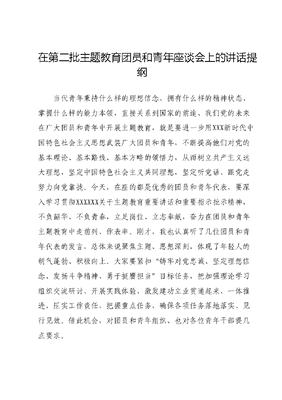 在第二批主题教育团员和青年座谈会上的讲话提纲当代青年秉持什么样的理想信念、拥有什么样的精神状态、掌握什么样的能力本领,直接关系到国家的前途、我们党的未来在广大团员和青年中开展主题教育,就是要进一步用XXX新时代中国特色社会主义思想武装广大团员和青年,不断提高他们对党的基本理论、基本路线、基本方略的领悟力,从而树立共产主义远大理想,坚定中国特色社会主义共同理想,坚定听党话、跟党走努力向党靠拢。今天,在座的都是优秀的团员和青年代表,要深入学习贯彻XXXXXX关于主题教育重要讲话和重要指示批示精神,不负韶华、不负青春,立足岗位、立志奉献,奋力在团员和青年主题教育中走前列、作表率。刚才,我也认真听了几位团员和青年代表的发言,总体来说聚焦主题、思想深刻,体现了年轻人的朝气蓬勃、积极向上。大家要紧扣铸牢对党忠诚、坚定理想信念、发扬斗争精神、勇于挺膺担当目标任务,把加强理论学习组织交流研讨、开展实践体验、激发建功立业贯通起来、一体推进,压实工作责任,把握重点任务,确保各项任务落地落实、见行见效。借此机会,对团员和青年组织、也对各位青年干部提几点要求。第一,针对各层级各领域的团员和青年主题教育,要突出体现团员和青年特点,科学谋划好、精心组织好。团员和青年群体有着自己的特点,面向他们的主题教育,要把加强理论学习、组织交流研讨、开展实践体验、激发建功立业贯通起来、一体推进在广大团员和青年中开展主题教育,根本目的在于动员引领广大团员和青年认真学习领会XXX新时代中国特色社会主义思想,努力掌握这一重要思想的世界观和方法论,善于运用贯穿其中的立场观点方法分析问题,提高对党的基本理论、基本路线、基本方略的领悟力,做有理想、敢担当、能吃苦、肯奋斗的新时代好青年要用党的科学理论武装青年,用党的初心使命感召青年,用党的优良作风塑造青年,用党的远大目标指引青年,用党的扎实业绩说服青年,让他们深刻感受到XXXXXX对青年一代的亲切关怀,深刻感受到中国必将在党的领导下以中国式现代化实现民族复兴,从而真正拥护两个确立,做到两个维护。要通过改革开放以来特别是新时代十年伟大变革的事实,使广大团员和青年理解伟大思想指导伟大实践,对伟大思想产生情感认同;要通过对XXX新时代中国特色社会主义思想的系统学习,使广大团员和青年理解其中的道理学理哲理,自觉把思想伟力转化为远大理想把理论清醒转化为政治坚定。要组织广大团员和青年全面贯彻党的创新理论,着力搭建青年施展才干、实现梦想的舞台,引导青年立足岗位、争创新功,争做走在时代前列的奋进者、开拓者、奉献者,在中国式现代化建设中勇当先锋队、突击队。第二,把党的领导贯穿团员和青年主题教育全过程、各方面突出党建带团建,充分发挥基层团组织的主阵地作用。坚持党的领导,是做好一切工作的根本保证。抓好团员和青年主题教育,必须把坚持党的领导贯穿全过程、各方面。抓好团员和青年主题教育,必须把坚持党的领导贯穿全过程、各方面。要突出基层导向,做实做细做精面向基层一线的组织发动,广泛覆盖各类团员和青年群体,充分尊重青年的主体性和基层的创造性,使团员和青年主题教育贴近青年实际、融入青年生活。要积极服务青年,紧扣服务青年的工作生命线,倾听青年呼声、反映青年愿望,了解青年所忧所盼,千方百计为青年办实事、解难事。要力戒形式主义,不随意增加自选动作,不增加基层负担,坚决防止形式化、套路化、表面化。要做好宣传引导,把准宣传重点,注意宣传尺度,注重宣传实效,守牢宣传底线,以扎实成效体现团员和青年主题教育进展。注重发挥组织优势,发挥党建带团建的组织优势,主动争取党组织支持,党团组织有机联动,党员结对带着团员和青年学习、实践。发挥共青团自身的组织优势,依托三会两制一课、主题团日制度开展学习。各级团组织书记要履行主题教育主要负责人职责、团干部要发挥骨干带头作用。用好青年马克思主义者培养工程、青年讲师团等团内已有的理论学习品牌。调动青联、学联、各类青年社团等外围组织的力量。第三,面向广大团员和青年紧盯学习重点,围绕学习对象、学习内容、学习方式等关键要素精心谋划,真正做到入脑入心、凝心铸魂。要准确把握团员和青年主题教育的总体要求,紧扣深入学习贯彻XXX新时代中国特色社会主义思想这一根本任务,聚焦铸牢对党忠诚、坚定理想信念、发扬斗争精神、勇于挺膺担当的具体目标,结合不同青年群体特点,在加强理论学习上下实功,在组织交流研讨上出实招,在开展实践体验上行实策,在激发建功立业上求实效,动员引领广大团员和青年认认真真读原著、学原文、悟原理,深学细悟党的创新理论,用理论学习指导实践建功。理论学习要更加聚焦学什么、怎么学,充分借鉴运用第一批主题教育成功经验,在学思用贯通、知信行统一上下功夫,做到真心至诚学、全面系统学、跟进追随学,深刻领悟蕴含其中的真理力量、实践力量,学出忠诚品