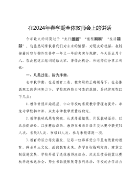 在2024年第一次全体教师大会上的讲话尊敬的各位领导,老师们:大家好!新春贺喜龙年到,春暖花开正当时。新年伊始,经过大家的不懈努力,今天,我们实现了全面平稳开学。为了将开学工作做到最好,实现开好头、起好步的基本要求,为有效推进教育教学夯实基础。借此机会,和老师们交流两点意见,希望大家吸取经验,为我所用,掌握方法,更好工作。一、不忘初心,不折不扣推进有效教育教学磨刀不误砍柴工,确保学生思想转变到位,是我们有效开展教学工作的基础。帮助学生做好各种学习准备,是我们有效教学的保证。学生没有做好准备就急于教学的做法不可取,惟有让学生在思想上想学,心理上进入状态之后,我们的教学工作才算真正做到水到渠成,顺理成章。(一)坚持凡事从思想上解决问题的工作理念。俗话说得好,正人先正己,欲要学生思想认识提升,我们必须先提升,以无形的榜样示范,引领学生在思想认识上提升,全力从思想上解决根本问题,促进学生想学、要学、、主动学、有效学。一是要着力解决教师自身思想懈怠。不怕任务艰巨,就怕思想垮塌。没有灵魂的支配,我们将形同行尸走肉,精神萎靡,士气低落,一蹶不振。只要我们树立起不怕困难,直面困难,解决困难的决心,铸炼不达目的不罢休的意志,锤炼把工作进行到底的决心,坚定信念,强化信心。努力根除破罐子破摔的不良思想,积极工作,就一定没有解决不了的问题,教学成绩便会蒸蒸日上。二是要着力解决学生厌学问题。厌学的根源,无疑于学生听不懂、学不会、失信心等原因。不解决好这一问题,我们的班级管理,学生管理便是大问题。而彻底解决这一问题的方法主要在于我们老师教什么?怎么教?我的经验是切合学生实际教,教学生需要的,能听懂的,有适用价值的。结合学生兴趣爱好实施教学,逐步培育学生的学习兴趣,引领全体学生积极学习。三是要着力解决教师教的桎梏。一视同仁的教学思想不可取,一刀切的教学过程没有效,一次备课针对所有学生的做法已经淘汰。把教材当成教条,一成不变教教材的做法没有实际效果,会导致学生不想听,不想学。脱离课程标准的教学适应不了考试,教学成绩会大打折扣。脱离学生实际的教学难以被学生接受,教不出优异成绩。所以,积极主动,勤于钻研,针对学生实际备课,落实因材施教,落实辅导过程,是我们解决教学桎梏的有效方法。(二)坚持安全底线的教学提质工作理念。安全不保,教学没有具体意义。安全是底线,教学质量是生命线,坚持安全必须服务于教学,教学必须渗透安全教育,以教学提质助推安全工作提质。一是必须牢牢守住学生的身心健康。在学生的优秀学习成绩和身心健康之间任选其一,我们必定选的是学生的身心健康。所以,守住安全底线,确保学生安全,助力学生健康成长是首要的工作任务。在此基础上,引领学生健康生活,快乐学习,我们的教学才有其本质意义。二是必须牢牢扭住常规安全管理和教育。学生的安全教育是每一个教职工必须担负的神圣职责,每一位教职工都是学生安全教育的当事人。做实监课和候课,确保学生不脱离监护;做好提示提醒,确保学生时时处处注意安全;做好隐患排查治理,确保环境安全;做好矛盾纠纷排查化解,确保校园祥和稳定;做好学生日常检查,确保第一时间掌握学生的身心健康状况。(三)牢牢扭住教学提质中心不动摇。学校的一切工作,都必须围绕教学提质这个中心来开展。脱离教学提质,不能为教学提质服务的一切工作都是没有意义的。一是以德育教育推进教学提质。前面我们谈到,必须坚持凡事从思想上解决问题。而德育工作便是解决思想问题的关键一招。做好思想教育,培育学生浓厚的学习兴趣,激发学习的积极性,努力建设良好的学风,从思想上推进学生积极主动学习。二是以指导、引领的方式促进学生积极有效学习。指导好学生学习的方法,为学生有效学习奠基。引领学生积极学习,主动学习,快乐学习,是学生高质量学习的基本保障。所以,在学习方法、过程上积极指导,在学习思想上有效引领,助力学生高质量学习。三是以教师自我提升促进教学提质。良好的教学方法是我们教学取得事半功倍效果的基础。良好的教学方法可以通过学习得来。良好的教学心态是我们推进教学提质的保证。带着为学生的美好前途工作,我们必定能以一颗赤诚的热心去做实精准备课、精细教学、精心辅导、精准考评,做富有实效的教学工作。二、牢记使命,不折不扣推进教育教学提质教育的本质就是服务,我们必须全力服务好学生的饮食起居,服务好学生的学习,助力学生健康成长。(一)教育即服务,全力推进服务育人。打造良好的育人文化,做实真切的服务工作,以富有实效的服务质量促进学生健康成长。一是要千方百计做好学生的饮食起居服务。民以食为天,解决学生的吃饭问题是重中之重的大事。不但要让学生吃得饱,更要让学生吃得好,不但要让学生吃得胖胖的,更要让学生吃得壮壮的。有效的休息是学生有效学习的基础,大家一定要齐心协力,共同管理好学生的午休和晚休,不是万不得已的时候,杜绝任何人占用学