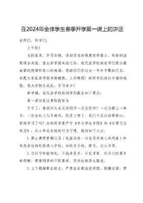 在2024年全体学生春季开学第一课上的讲话老师们,同学们:上午好!光阴荏苒,岁月如梭。冰封雪冻的寒意即将散去,初春的温暖将会来临。值此新学期来临之际,我代表学校向老师们致以最诚挚的感谢和衷心的祝福,感谢你们在过去一年中辛勤的付出,祝愿大家在新学期身体健康,工作顺利!向同学们致以幸福的祝愿,祝大家快乐成长,学习进步!新学期,我代表学校向同学们提出如下要求:第一部分是注意校园安全开学了,看到许久未见的同学一定会怎样?一定会聊上一阵子,一定会玩上几个游戏,但是上学了,我们不是应该要收心,好好学习了吗?全体同学要严守《中小学生守则》和《日常行为规范》,从小养成良好的行为习惯。做到如下六点:1.禁止携带管制刀具(包括其他一切会伤害他人的利器)和有危害性的玩具进入学校,如玩具手枪、弹弓、打火石等。2.与同学和睦相处,不挑弄是非,引发矛盾。同学之间要互相理解,尊重同学的不同喜好,坚决杜绝学生欺凌。3.上下楼梯靠右轻走,严禁在走廊追逐奔跑、跳橡皮筋,禁止在校园打闹、做危险游戏,不扑伏拦河,不攀高爬低,注意体育课和课外活动安全。4.注意安全用电。不接近、触摸电源、电器;发现损坏的电线、灯头、插座,要及时向老师报告。5.注意劳动安全。在学校各种劳动中,如除草、平整沙池、擦窗户、搬桌子等,要注意安全。6.上厕所时注意安全。有些同学是真的很别致,宽阔的操场不去,敞亮的教室不去,偏喜欢呆在阴暗潮湿的厕所玩。虽然我们学校的厕所香气扑鼻,但也不是玩的场所。第二部分是注意校外活动与居家安全1.防溺水安全。做到六个不:(1)不私自下水游泳;(2)不擅自与他人结伴游泳;(3)不在无家长带领的情况下游泳;(4)不到不熟悉的水域游泳;(5)不到无安全设施、无救援人员的水域游泳;(6)不熟悉水性的学生不擅自下水施救。还记得我们的防溺水警示歌吗?四季常吹安全哨,严防溺水最重要,溪流湖川池塘边,水坑水库水沟旁,无数生命遭溺亡,亲人悲痛泪千行,时时刻刻要牢记,生命安全是第一,不私自下水玩耍,不盲目下水施救,会相互报告提醒,会自护自救法则。2.防高空坠冰坠物。随着冰冻结束,屋顶的积冰开始融化。有多辆停在路边的汽车被掉落下来的冰块砸伤,车主在报保险理赔。即使坐在家里,也时常能听到冰块坠落轰隆的声音。试着想想,如果是砸在人的头上,该会造成多大伤害?眼下正值厚重冰块脱落之际,存在安全隐患,一排排倒挂在屋檐的冰溜子,就像一柄柄锋利的匕首,时刻威胁着人们的生命安全,易出现高空坠雪落冰现象。请提高警惕,谨防高空坠冰坠物,宁可走在空旷的大道上被淋湿,也不要站在或行走在屋檐下,确保人身安全3.注意防汛、防雷电安全。春季雷雨天气比较多,雷电发生时尽量不要呆在户外,躲避雷雨不要选择大树下及高楼旁。4.注意外出安全。同学们外出要征得家长或监护人的同意,并向家长或监护人说明去向、活动内容、随行同伴、回家时间等(要注意回家的时间不要太晚,以免父母担心。)5.注意居家安全。自己一个人在家时,不要给来访的陌生人开门,避免引狼入室;在家中玩耍时,不要在阳台、窗边及楼梯口嬉戏,避免发生坠楼事故。6.注意网络安全。在网上,不要轻易向别人透露家庭地址、学校名称、家庭电话、父母身份、家庭经济状况等信息,使用网络要注意节制有度,劳逸结合。谨防电信诈骗。7.注意交通安全。严格遵守乘车要求,不乘坐无牌无证和三超车辆,不在公路上玩耍,不在马路上蹲下身子,未满12周岁不许骑自行车上路。还记得我们交通安全警示歌吗?放学回家的路上,安全牢记在心间,途中不逗留玩耍,过马路先看两边,记得要走斑马线,交叉路口不争抢,如果乘坐电动车,安全帽可别忘了,时时刻刻要记得,安全出行乐呵呵。8.要遵纪守法。不看不健康的电影、录像、书刊;不进游戏机室、网吧等限制未成年人进入的场所;不参与打架斗殴、吸烟吸毒、赌博等非法活动等,做遵纪守法的小公民。9.注意消防安全:近期冰冻雨雪天气,取暖需求旺盛,一些大功率电器使用频繁,容易因可燃物积聚、用电超负荷、违规使用取暖设备或燃料等,引发火灾事故。大家自己要有这个安全意识,同时也要提醒家人。10.防性侵:寒假期间,我们连续下发了一个星期的防性侵的安全教育。一方面,我们要有一个正确的价值观,不要被手机上的视频和信息给带偏了。人生而为人是因为人懂得礼义廉耻,丧失了这些品德,那就和动物没什么区别了。另一方面,我们要有防范之心。还记得我们防性侵的警示歌吗?严防性侵记在心,时时注意言和行。隐私部位要遮住,谁都不能乱碰触。偏僻地方莫逗留,要和伙伴一起走。若雨陌生人问路,直指方向不带路。不与异性单独处,熟人亲近要防护,发现危险速远离,告诉老师父母亲,勇敢面对向前进,绝对不能藏在心,相信学校和警察,一定会把坏人抓。与未满十四周岁的人发生亲密关系,无论是不是你情我愿,都是犯罪,都要坐牢。生命只有一次,不能重来,望同学