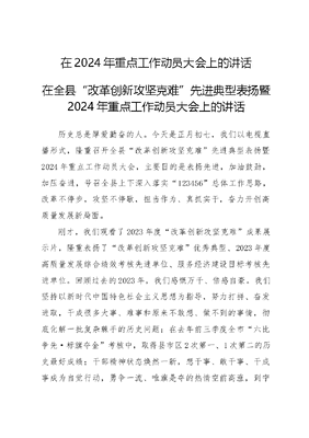 在2024年重点工作动员大会上的讲话在全县改革创新攻坚克难先进典型表扬暨2024年重点工作动员大会上的讲话历史总是厚爱勤奋的人。今天是正月初七,我们以电视直播形式,隆重召开全县改革创新攻坚克难先进典型表扬暨2024年重点工作动员大会,主要目的是表扬先进,加油鼓劲,加压奋进,号召全县上下深入落实123456总体工作思路,改革不停步,攻坚不停歇,担当作为、真抓实干,奋力开创高质量发展新局面。刚才,我们观看了2023年度改革创新攻坚克难成果展示片,隆重表扬了改革创新攻坚克难优秀典型、2023年度高质量发展综合绩效考核先进单位、服务经济建设目标考核先进单位。回顾过去的2023年,我们感慨万千、倍感自豪。我们坚持以新时代中国特色社会主义思想为指导,努力打拼、奋发进取,干成很多大事、难事和原来不敢想、做不到的事情,彻底化解一批复杂棘手的历史问题;在去年前三季度全市六比争先·标旗夺金考核中,取得县市区2次第一、1次第二的历史最好成绩;干部精神状态焕然一新,想干事、敢干事、干成事成为自觉行动,勇争一流、唯旗是夺的热情空前高涨,到宁阳来视察调研的同志普遍认为宁阳发生令人瞩目的变化,宁阳给人长期落后的印象也一去不复返,宁阳的干部群众从来没有像今天这样自信豪迈。刚才发言的10位同志,是各个方面、各条战线的优秀代表。他们敢抓敢管,真抓实干,带领镇街园区守牢底线、加快发展;他们以对宁阳人民负责、对历史负责的精神,千方百计争取政策、项目和荣誉;他们有担当、敢攻坚,成功化解一个又一个历史问题;他们拼上豁上,昼夜奋战,圆满完成县委、县政府交办的急难险重任务;他们攻坚一线、勤勉敬业,在平凡的岗位作出骄人业绩。在他们身上,集中展现了坚毅、敢当、实干、创新的新时代宁阳精神。刚才的成果展示片中,一行字、一个镜头、一项荣誉、一项政策背后,有多少人做出艰苦细致的努力,有多少人付出泪水汗水?我们需要更多的许军、陈军,需要更多的马宁、李琳,需要更多的王联合、董富泉、任杨峰,需要更多的周振挺、郑袭修,需要更多的王新广、邵梅、田洪这样的同志,他们是宁阳发展的脊梁,应该为他们点赞。全县还有很多像他们一样的奉献者,在过去的一年里攻城拔寨、挥洒汗水,我们的鲜花、掌声、荣誉,还应该献给每一位为宁阳发展默默奉献的劳动者。宁阳的每一点变化、每一份成绩,都是靠大家拼出来的,每个人都很了不起,每个人都是不平凡的英雄!在此,我代表县委、县政府,向受到表扬的先进单位、优秀代表和杰出企业家,表示热烈的祝贺!向广大干部群众的辛苦付出,表示诚挚的感谢!历史青睐奋进者。今年是实现十四五规划的关键之年,也是实现县第十五次党代会目标的攻坚之年。全县上下要按照123456总体工作思路,毫不动摇坚持四个第一,认真落实六个更加注重要求,高举改革创新大旗,再燃攻坚克难激情,吹响拼搏奋进号角,为宁阳的荣誉而干,为宁阳的未来而干,为宁阳老百姓的福祉而干,努力创造无愧于历史、无愧于人民的新业绩。下面,对新一年全县的工作,我讲四个方面的意见。第一、我们要以更大力度解放思想思想是行动的先导,思想一变天地宽。实现后发赶超、跨越发展,必须打开眼界、敢为人先、敢闯敢试,在解放思想中统一思想,在统一思想中加快发展。一要对标先进激发斗志。县域竞争的差距在于思想和眼界。如果思想停留在过去时,就会落后于时代。刚才有的同志在发言中讲今天和昨天,不是今天和昨天之间的比较,而是一个时代和另一个时代的比较,就是数字化时代。大家要睁开眼看世界,积极走出去,向先进看齐,跟上时代步伐。要有拿来主义的气魄,把先进地区的发展经验、成熟做法,学以致用,为我所用。比如,浙江是数字化改革起始地,我们要全面系统学习,凡是能用数字技术解决问题的,都要进行数字化转型。还有浙江创造的千村示范、万村整治工程等经验,这些被实践反复证明的成功经验,就要坚持拿来主义,别人怎么干的,我们要结合宁阳实际大力度地干。解放思想不仅仅是哪一个人、哪一个部门单位的事,不仅领导干部要解放思想,而且要带动下级和基层每一名干部解放思想;不仅党员干部要解放思想,而且要带动企业家、创业者和人民群众解放思想,真正让解放思想体现到宁阳的每个角落。我们是儒家传统文化核心区域,有厚德载物、自强不息的优良传统,但是在新时代日趋激烈的县域竞争中,要想彻底摆脱贫穷落后的面貌,必须大力度解放思想。近期,要分批分领域组织大规模外出学习,以思想大解放引领观念大变革、工作大提升。同时,我们鼓励各个单位经常性组织外出学习,也鼓励同志们走出国门,到先进国家学习考察。二要大刀阔斧改革创新。把解放思想的落脚点放在解决实际问题上,敢想敢试,敢于破圈,海阔天空地想,脚踏实地地干。要围绕群众急难愁盼大胆改,我们从2021年开始,在全省率先实行大病商业补充医疗保险制度,每
