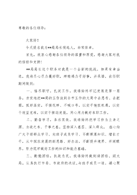 尊敬的各位领导:大家好!今天提名我为**局局长候选人,非常荣幸。首先,我衷心感谢各位领导的器重和厚爱,感谢大家对我的信任和支持!**局局长这个职务对我是一个全新的挑战,如果有幸当选,我将尽心尽力履好职,殚精竭力干好事,并承诺,在任职期间做到:一、恪尽职守,扎实工作。我将始终牢记发展是第一要务,自觉地把**局的工作放到全市工作的大局中去思考、去把握,抓好落实,不搞花样、不喊口号,以实干抢抓机遇,以实干攻坚克难,以实干推动发展,用心用力做好本职工作。二、勤奋学习,务求实效。我将始终把学习作为立身之源、为政之本、干事之基,坚持深入基层、深入群众, 虚心向广大干部群众学习、向班子成员学习、不断积累知识、增长才干,从中探求发展的新思路、好办法,不断提升境界、开阔眼界,努力筑牢做好工作的知识和能力基础。三、勤勉团结,执政为民。我将始终做到讲团结、顾大局,认真执行市委、市政府的决议,与班子成员一道,凝心聚力,形成合力,营造精诚团结、相互补位、和谐舒畅的工作局面。无论面对何种困难,我都将矢志不渝,勇往直前,为我市经济社会的稳定发展竭力奉献,用自己的忠诚、汗水和良好业绩回报全市人民。四、廉洁自律,勇于奉献。我将恪守廉政准则,履行一岗双责,牢记宗旨,始终以对组织负责、对自己负责、对家人负责的态度,自觉遵守民主集中制原则,依法行政,自觉接受社会各界和广大干部群众的监督,始终经得起诱惑、守得住气节,做到躬身为民、一身正气。 谢谢大家!文可居文库——海量学习资料,手机电脑均可下载www.wenkeju.com