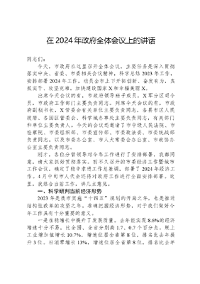 在2024年政府全体会议上的讲话同志们:今天,市政府在这里召开全体会议,主要任务是深入贯彻落实中央、省委、市委相关会议精神,科学总结2023年工作,安排部署2024年工作,动员全市上下开拓创新、奋发有为,真抓实干、攻坚克难,加快建设国家X和幸福美丽X。出席今天会议的有,市政府领导班子成员,X军分区司令员,市政府工作部门主要负责同志。列席今天会议的有,市政府副秘书长,X管委会有关单位主要负责同志,各县市区人民政府、各园区管委会、科学城办事处主要负责同志,有关部门和单位主要负责人。今天的会议还邀请了市中级人民法院、市检察院、市委组织部、市委宣传部、市委政法委、市委统战部负责同志,以及市委办公室、市人大常委会办公室、市政协办公室主要负责同志。刚才,各位分管领导对今年工作进行了安排部署,我都同意,请大家抓好贯彻落实。前不久召开的市委经济工作暨城市工作会议,确定了稳中求进工作总基调,部署了2024年经济工作。4月中旬市人代会还将对政府工作进行全面安排部署。这里,我结合当前工作,讲几点意见。一、科学研判当前经济形势2023年是我市实施十四五规划的开局之年,也是推进结构性改革的攻坚之年。准确把握经济形势,对于我们做好今年工作具有十分重要的意义。一是在稳增长中提升了发展质量。去年能实现8.6%的经济增速十分不易,比全国、全省分别高1.7、0.7个百分点。规上工业增加值增长10.7%,增速位居全省第8位,排名比去年提升3位。社消零增长13%,增速位居全省第8位,排名比去年提升2位。居民消费价格指数(CPI)上涨1.5%,发展效益稳步提高。二是在抓投资中夯实了项目基础。去年实现全社会固定资产投资X亿元、增长6.8%,民间投资占比61.3%、增长1.2个百分点。新签约天津力神动力锂电池等项目330个,计划投资X亿元。形成2023年省市重点项目202个,其中列入省重点项目前100位的达到X个,同比增加6个,储备了一批打基础、利长远、增后劲的重大项目。三是在谋长远中健全了工作机制。编制完成了工业、服务业产业发展布局方案,创新设立产业投资发展引导基金等5支基金,制定完善重点企业重大项目领导联系制度、重点项目推进例会制度等工作机制,这些都为我们做好今年工作提供了有力的制度保障。(二)困难不可低估,对经济面临挑战要有清醒认识。X与全国、全省一样,当前既要面对经济下行的严峻挑战,也要应对长期积累的结构性矛盾,诸多问题亟待解决。一是工业形势较为严峻。从2023年2月开始,全市PPI连续负增长,工业生产领域的通缩风险增加。规上工业产能利用率低于80%正常水平。工业产销率97.5%,与去年持平。二是财政金融风险上升。去年全市一般公共预算收入增速低于GDP增速6.3个百分点,同比回落10.2个百分点。银行业金融机构不良贷款率、不良贷款余额双双上升,其中不良贷款率达3.54%。同时,实体经济企业融资难、融资贵问题未得到有效解决。全市地方政府性债务305.83亿元,低于警戒线,风险可控但不容忽视。三是县域发展极不平衡。全市GDP总量最大的县比靠后的6个县总和还多。县域工业发展差距较大,工业占三次产业比重超过35%的仅4个县。大部分县级投融资平台不健全,没有形成完善的投融资体系。5个县城镇化率在40%以下,与全市平均水平差距较大。这些都需要我们在以后工作中,采取有力措施,切实加以解决。(三)信心不能动摇,X未来发展具有诸多机遇。一是国家X加快建设的独特机遇。李强总理对X建设提出了更高要求,文可居文库——海量学习资料,手机电脑均可下载www.wenkeju.com国家自主创新示范区4项先行先试政策落地实施,X集中发展区加快建设,创新创业活力进一步释放。二是全面创新改革启动实施的战略机遇。随着系统推进全面创新改革试验全面实施,省X研究院成功设立,核医学中心、X产业创新联盟加快筹建,一批X特色产业园区建设有力推进,必将为我市经济发展增添新动能。三是产业结构不断优化的现实机遇。我市优势产业以电子信息、新材料为主,高新技术和战略性新兴产业占工业总产值比重分别达45.6%、34%,钢铁、水泥等高耗能产业产值占比较低。只要我们主动作为、敢于担当,不仅能够闯过难关,还可以实现后来居上。二、全力抓好今年重点工作牢牢把握稳中求进工作总基调,坚持科学发展、加快发展突出全面创新改革牵引,着力推进供给侧结构性改革,提高经济增长质量和效率,统筹抓好稳增长、调结构、惠民生、防风险,努力实现十四五发展良好开局(一)始终突出规划引领、项目投资这个主攻方向。强化十四五规划引领作用,坚持以项目为中心组织经济工作,大力开展项目年行动。要积极谋划储备项目。最近,中央、省上在水利、交通、新兴产业培育、旧城棚户区改造等领域出台了许多含金量很高的政策措施,匹配了相应的项目和资金。各地各部门要围