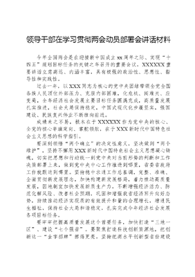 领导干部在学习贯彻两会动员部署会讲话材料今年全国两会是在迎接新中国成立xx周年之际、实现十四五规划目标任务的关键之年召开的重要会议。XXXXXX重要讲话立意高远、内涵丰富,具有极强的政治性、思想性、指导性和实践性。过去一年,以XXX同志为核心的党中央团结带领全党全国各族人民顶住外部压力、克服内部困难,化危机、闯难关、应变局,全年经济社会发展主要目标任务圆满完成,高质量发展扎实推进,社会大局保持稳定,中国式现代化步履坚实,强国建设、民族复兴伟业不断推向前进。成绩来之不易,根本在于XXXXXX作为党中央的核心、全党的核心举旗定向、掌舵领航,在于XXX新时代中国特色社会主义思想的科学指引。要深刻领悟两个确立的决定性意义,坚决做到两个维护,坚持不懈用XXX新时代中国特色社会主义思想凝心铸魂,切实把思想和行动统一到党中央对当前形势的判断和工作决策部署上来,做到党中央中心工作推进到哪里,省委省政府工作就跟进到哪里。坚持稳中求进工作总基调,完整、准确、全面贯彻新发展理念,加快构建新发展格局,着力推动高质量发展,因地制宜加快发展新质生产力,不断增强经济活力、防范化解风险、改善社会预期,巩固和增强我省经济回升向好态势,持续推动经济实现质的有效提升和量的合理增长,增进民生福祉,保持社会大局和谐稳定,扎实完成今年经济社会发展各项目标任务。要牢牢把握高质量发展这个首要任务,加快打造三地一区、建设七个强省。要聚焦打造科技创新策源地,把创新这一金字招牌擦得更亮。坚持把高水平创新型省份建设作为旗帜性抓手,全力服务保障推进国家实验室等国之重器建设,聚力打造量子信息、聚变能源、深空探测三大科创引领高地,坚定不移走科创+产业的路子,加快完善以企业为主体的技术创新体系,大力实施人才兴皖工程,强化一把手抓第一资源责任,全力营造近悦远来的更好人才生态,加强高质量教育体系建设,在科技强省建设上取得更多标志性成果。要聚焦打造新兴产业聚集地,把发展壮大新质生产力这篇大文章做得更好。坚持把高质量发展的要求贯穿新型工业化全过程,加快推进传统产业转型升级,大力发展壮大新三样和集成电路、新材料、新型显示、高端装备制造、医药健康等战略性新兴产业,乘势而上做大做强汽车首位产业,加快打造具有国际竞争力的新能源汽车产业集群,全力打造低空经济、生物制造、商业航空等新增长引擎,前瞻布局量子科技、聚变能源、通用人工智能等未来产业,构建以先进制造业为骨干的现代化产业体系。坚决扛稳粮食安全责任,深入推进千亿斤江淮粮仓建设工程,实施种业振兴行动、秸秆变肉暨肉牛振兴行动,做好粮头食尾畜头肉尾农头工尾增值大文章,扎实推进千村引领、万村升级工程。深入推进文物保护重点工程,实施传统村落保护利用工程,高质量抓好考古遗址发掘,抢占数字文化产业制高点,打造xx世界级休闲度假康养旅游目的地。要聚焦打造改革开放新高地,把全面深化改革、扩大高水平对外开放这个关键一招做得更深更实。以市场化改革为重点,统筹推进国资国企、财税金融、农业农村等各领域改革,落实好定期召开民营企业家恳谈会制度,全力打造更为便捷高效的政务环境、保障有力的要素环境、竞争有序的市场环境、公平公正的法治环境、践诺守信的社会环境,让好的营商环境成为xx的金字招牌。深入实施重大国家战略,努力在全省全面融入长三角一体化发展中取得更多标志性成果。要聚焦打造经济社会发展全面绿色转型区,把江淮大地这文可居文库——海量学习资料,手机电脑均可下载www.wenkeju.com片好山好水保护得更好。协同推进降碳、减污、扩绿、增长,持续打好蓝天、碧水、净土保卫战标志性战役,扎实开展绿美江淮行动,积极稳妥推进碳达峰碳中和,加快打造绿色低碳产业生态。要牢牢把握人大、政协在推进中国式现代化中的职责定位扎实发展全过程人民民主。人大及其常委会要坚持党的领导、人民当家作主、依法治国有机统一,践行全过程人民民主,充分发挥人大代表作用,围绕发展新质生产力、长三角一体化发展、创建一流营商环境、乡村全面振兴、生态保护等扎实开展立法、监督等工作。人民政协要把旗帜鲜明讲政治贯穿政协履职全过程,紧扣事关现代化美好xx建设的重要问题开展协商议政、民主监督和重大课题研究,更好为xx改革发展强信心、聚人心、筑同心。法检两院要深入学习贯彻XXX法治思想,忠实履行宪法法律赋予的职责,加强法治化营商环境建设,严格公正司法,高质效办好每一个案件,让人民群众在每一个司法案件中感受到公平正义。要着力提振党员干部干事创业的精气神,不折不扣、雷厉风行、求真务实、敢作善为抓落实,把全国两会精神转化为xx高质量发展的生动实践。要营造敢为敢闯敢干的浓厚氛围,巩固拓展主题教育成果,持续开展思想大解放、环境大优化、能力大提升、作风大转变、