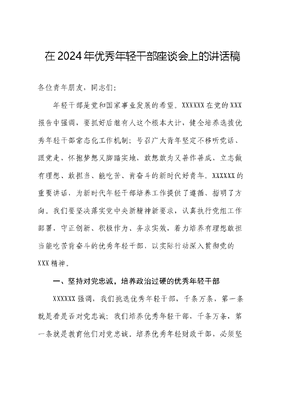 在2024年优秀年轻干部座谈会上的讲话稿各位青年朋友,同志们:年轻干部是党和国家事业发展的希望。XXXXXX在党的XXX报告中强调,要抓好后继有人这个根本大计,健全培养选拔优秀年轻干部常态化工作机制;号召广大青年坚定不移听党话、跟党走,怀抱梦想又脚踏实地,敢想敢为又善作善成,立志做有理想、敢担当、能吃苦、肯奋斗的新时代好青年。XXXXXX的重要讲话,为新时代年轻干部培养工作提供了遵循、指明了方向。我们要坚决落实党中央新精神新要求,认真执行党组工作部署,守正创新、积极作为、务求实效,着力培养有理想敢担当能吃苦肯奋斗的优秀年轻干部,以实际行动深入贯彻党的XXX精神。一、坚持对党忠诚,培养政治过硬的优秀年轻干部XXXXXX强调,我们挑选优秀年轻干部,千条万条,第一条就是看是否对党忠诚;我们培养优秀年轻干部,千条万条,第一条就是教育他们对党忠诚。培养优秀年轻财政干部,必须坚持把政治标准放在首位,把严把紧政治关这个首要之关,考准考实对党忠诚这个关键大德,教育引导干部坚定理想信念、筑牢政治根基、强化组织观念,确保党和国家财政事业的接班人政治上信得过、靠得住、能放心。一是坚定理想信念。理想信念是共产党人精神上的钙,共产党人如果没有理想信念,精神上就会缺钙,就会得软骨病,导致政治上变质、经济上贪婪、道德上堕落、生活上腐化。要加强理想信念教育,引导年轻干部牢记党的宗旨,解决好世界观、人生观、价值观这个总开关问题,自觉做共产主义远大理想和中国特色社会主义共同理想的坚定信仰者和忠实实践者。要深化思想理论武装,坚持不懈用XXX新时代中国特色社会主义思想凝心铸魂,引导年轻干部深刻理解马克思主义的真理性,深刻把握历史规律的必然性,以思想理论的坚定确保理想信念的坚定,以坚定的信仰、信念、信心走好新时代的长征路。二是筑牢政治根基。培养优秀年轻财政干部,最重要、最紧迫的任务就是增强政治意识,坚持想问题、办事情首先从政治上看,从政治上把握,不断提高政治判断力、政治领悟力、政治执行力。要把文可居文库——海量学习资料,手机电脑均可下载www.wenkeju.com坚定拥护两个确立、坚决做到两个维护作为最高政治原则和根本政治责任,落实到实际工作中,体现到一言一行上,教育引导年轻干部坚定不移听党话、跟党走。三是强化组织观念。严密的组织体系是党的优势所在、力量所在。对党忠诚的一个重要方面就是忠诚于党的组织,正确处理个人与组织的关系,把党的利益放在第一位,完成组织交办的任务,经得起组织的考验。要教育引导年轻干部敬畏组织,守住权力关,始终牢记权力就是责任,坚持公正用权、依法用权、为民用权、廉洁用权。要教育引导年轻干部服从组织,正确看待组织、正确看待自己,服从大局、服务组织、服从安排,振奋起共产党人应有的精气神,把全部精力用到干事创业上。要教育引导年轻干部维护组织,严守政治纪律和政治规矩,不折不扣执行党的路线方针政策,决不搞上有政策、下有对策,阳奉阴违。二、坚持敢于担当,培养本领高强的优秀年轻干部XXXXXX强调,要加强干部斗争精神和斗争本领养成,着力增强防风险、迎挑战、抗打压能力,带头担当作为,做到平常文可居文库——海量学习资料,手机电脑均可下载www.wenkeju.com时候看得出来、关键时刻站得出来、危难关头豁得出来。进入新阶段新征程,培养优秀年轻财政干部,必须紧紧围绕事业发展需要,在坚持政治标准的前提下,更加重视干部的素质能力,大力培养选拔想干事、能干事、干成事的干部。一是端正工作态度。干部干部,要干字当头,这既是职责要求,也是从政本分。反对高谈阔论,强调真抓实干,始终是中国共产党人的优良传统。要树立正确用人导向,教育引导年轻干部以辛勤劳动、勤政务实为荣,以好逸恶劳、懒政怠政为耻,工作中坚决杜绝躺平思维、佛系思想,不怕辛苦、甘于奉献,坚守为民初心,勇于担当尽责。要教育引导年轻干部树立不干则已,干就干到最好的品牌思维和文经我手无差错,事交我办请放心的精品意识,遏制敷衍交差、凑合应付的粗放思想,革除稍进就满、小成即止的保守意识,始终做到一丝不苟、精益求精。要教育引导年轻干部养成敢于斗争、善于斗争的鲜明品格,敢于坚持真理、修正错误,勇于从大局出发建言献策。二是学习工作方法。学习掌握科学的思想方法和工作方法,是干部干事创业、成长进步的关键。只有坚文可居文库——海量学习资料,手机电脑均可下载www.wenkeju.com持科学的思想方法和工作方法,严格按照客观规律办事,才能真正抓住机遇,办成一些事情,不断把党和人民的事业推向前进。要围绕坚持人民至上、自信自立、守正创新、问题导向、系统观念、胸怀天下这六个方面,教育引导年轻干部认真学习领会XXX新时代中国特色社会主义思想的世界观和方法论,坚持好