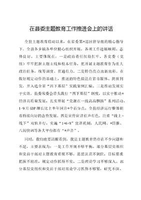 在县委主题教育工作推进会上的讲话全县主题教育启动以来,在省委第*巡回督导组的精心指导下,全县各乡镇各单位精心组织开展,各项工作进展顺利、态势良好。主要体现在:一是政治责任扛稳扛牢。各党委(党组)牢牢把握主题主线和根本任务,把开展主题教育作为重大政治任务,统筹调度、贯通有力。二是特色亮点出新出彩。在做好规定动作的基础上,推送的特色做法在省市媒体、简报刊发,并入选全省四下基层实践案例汇编。三是推动发展实干实效。县委常委会带头践行四下基层制度,以实干推动*经济高质量发展,扎实开展党旗在一线高高飘扬系列活动,1-9月GDP增长比上半年回升*个百分点,全县经济运行整体朝着持续向好的态势发展。四是宣传宣讲有声有色。注重线上+线下双轨并行,实施1+6+N宣讲机制,人民网、*日报、八闽快讯等各大平台都有*声音。 同时,我们也要清醒看到,我县主题教育仍存在不少问题和不足,主要表现为:一是工作开展不够平衡。部分基层党组织和党员干部对主题教育重视不够,思想认识不到位,目标要求把握不精准,规定动作抓得不实。二是理论学习不够深入。部分基层党组织和党员干部对理论学习抓得不够紧,研究不深、浮于表面。三是结合实际不够紧密。部分基层党组织和党员干部从党的创新理念中找方法、找答案做得不够,不能很好地结合本地本单位实际,以学促干成效不足。针对这些问题,各乡镇各单位要采取有效措施,认真加以解决。当前,第二批主题教育时间已将近过半,进入深入推进、全面深化的关键阶段,各乡镇各单位要始终保持饱满精神状态、实干争先姿态,不断推动主题教育走深走实、见行见效。这里,我再讲三点意见: 一、坚持对标对表,压紧压实政治责任9月20日至21日,XXXXXX到浙江考察时强调,各级党组织要加强对第二批主题教育的组织领导和工作指导,把握不同层级、不同领域、不同对象的特点,结合实际、分类指导,上下联动抓整改,让群众看到实效;10月10日至13日,XXXXXX到江西考察时强调,要把实的要求贯穿主题教育全过程,坚决防止和克服形式主义、官僚主义,实实在在地抓好理论学习和调查研究,实实在在检视整改突出问题,实实在在办好惠民利民实事,用实干推动发展、取信于民。特别是近期,XXXXXX还就学习推广四下基层作出重要批示。XXX的重要讲话重要指示批示,为我们开展好第二批主题教育进一步指明了方向、提供了遵循。第二批主题教育直接面对基层和群众,参加单位和人员范围广、类型多、数量大,和群众联系更紧密,面临的情况也更具体。当前,又逢冲刺全年目标任务和谋划新一年工作的关键阶段,必须更加深刻认识开展好主题教育的重大意义,坚决贯彻中央部署和省委、市委、县委要求,认真研判解决存在问题,拧紧发条、把握节奏、力戒虚功,切实抓好统筹推进、层层压实责任,不辜负中央和省委、市委的重托,不辜负党员和群众的期待。二、践行四下基层,推动主题教育落地落实各乡镇各单位要把学习推广四下基层作为第二批主题教育的重要抓手,贯通落实到各项重点措施之中,确保主题教育取得更大实效。一要持续学思践悟,推动知行合一。按照学习内容全涵盖、学习对象全覆盖、学习责任全链条的要求,持续在深化、内化、转化上下功夫。全面系统、及时跟进。坚持读原著、学原文、悟原理,系统学习XXXXXX关于主题教育的系列重要讲话和重要指示批示精神,不断在深学细照笃行中提高理论素养、坚定理想信念、升华觉悟境界、增强能力本领。各级党员领导干部要带头上党课,推动党的创新理论飞入寻常百姓家。全面覆盖、突出重点。要结合本乡镇本单位实际,科学合理安排学习计划,从严把关审核发言材料,高质量研讨交流。结合实际,认真落实非公、团员青年、学校、医院等*个领域主题教育工作方案,确保特殊群体党员不漏学、不掉队。二要主动担当作为,奋力推动发展。深化党旗在一线高高飘扬系列活动,推动党员干部深入一线解难题、促发展。在发展高质量上聚力用劲。要坚持把开展主题教育同做好中心工作贯通起来,全面落实县委三季度工作会议精神,进一步找差距、补短板、强弱项、扬优势,统筹抓好各项重点工作,尽最大努力争取更好结果,交出*高质量发展的优异答卷。在生活高品质上聚力用劲。要深化我为群众办实事我为企业解难题等活动,深化微改造大提升共建活动,加快推进为民办实事项目,用心用情解决群众急难愁盼问题。在干部高斗志上聚力用劲。要大力传承弘扬革命老区苏区的好传统、好作风、好品格,引导党员干部把学思践悟新思想焕发出来的昂扬斗志,转化为攻坚克难、干事创业的强大动力,加快推动*革命老区高质量发展示范区建设。三要突出问题导向,全面检视整改。要坚持边学习、边对照、边检视、边整改,把问题整改整治贯穿始终,解决真问题、真解决问题。坚持边查边改。要建好问题清单,逐条逐项抓好问题整改,动态更新、及时增减问题清单。需要强