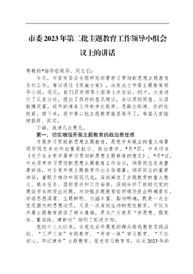 市委2023年第二批主题教育工作领导小组会议上的讲话尊敬的*指导组领导、同志们:今天,市委常委会专题研究部署学习贯彻新思想主题教育系列工作,审议通过《实施方案》,决定成立市委主题教育领导小组。现在,我们召开领导小组第1次会议。刚才,大家进行了认真讨论,提出了很好的意见建议,会议原则同意。从目前情况看,我市的准备工作起步比较早、思路比较清、抓的比较紧。接下来,我市第二批主题教育就要展开了,希望大家继续抓好、抓实。下面,我讲几点意见。第一,切实增强开展主题教育的政治责任感开展学习贯彻新思想主题教育,是党中央做出的重大部署领导同志多次作出重要批示、提出要求。*月*日,中央印发《关于在全党开展学习贯彻新思想主题教育的意见》,*月*日,中央召开学习贯彻新思想主题教育工作会议,领导同志发表重要讲话,对全党开展主题教育作出全面部署。领导同志的重要讲话,着眼于推动中国现代化,深刻阐述了主题教育的重大意义、根本任务、目标要求和工作安排,深刻分析了新时代党的建设存在的突出问题,对加强主题教育组织领导提出明确要求。讲话思想深邃、主题鲜明、内涵丰富、指向明确,既是一次全党范围内的思想动员,又是一次深刻生动的党性教育,不仅为开展主题教育提供了根本遵循,更为广大党员学思想、强党性、重实践、建新功指明了前进方向。党的十八大以来,全党先后开展党的群众路线教育实践活动、三严三实专题教育、两学一做学习教育、不忘初心、牢记使命主题教育、党史学习教育等,这次2023年的主题教育的特殊意义在哪里?现实针对性是什么?当今,国际国内环境错综复杂,越到关键时刻,越需要新思想的引领,越需要凝聚全党共识、汇聚全党力量。搞好这次主题教育,意义十分重大。作为全*主题教育的领导者、组织者,我们要对主题教育重大意义的认识更加深刻,对中央和*委精神的领会更加透彻,对贯彻党的XX大和*委决策部署的行动更加坚决,扎实组织开展好主题教育,为推动经济社会发展注入思想动力、提供组织保障。第二,切实推动主题教育有力有序有效开展市委主题教育领导小组,在市委常委会领导下开展工作。重大事项须经市委常委会研究决定,具体工作由领导小组成员单位共同商定。刚才审议通过的《工作规则》,明确了领导小组的职责,是我们开展工作的基本遵循,要重点把握以下几个方面。一是把握目标要求。要在吃透重要讲话精神和*要求的基础上,结合实际进一步细化、完善我*工作安排。整个主题教育,要认真贯彻学思想、强党性、重实践、建新功的总要求,把*确定的聚焦点、规定动作、重要方法等不折不扣落实到位,切实达到总体目标。这次主题教育总共*个月的时间,具体到每个单位只有*个月,安排紧凑、任务繁重。这就更加需要我们加强全*主题教育整体谋划,对相关对策措施要早研究、早部署、早推动,做到心中有数、手中有招、忙而不乱。二是加强指导督促。这次主题教育分两批进行,同一批进行的单位各自情况不一样,工作进度也不完全一样,指导难度较大。这就需要根据参加主体的不同特点,具体问题具体分析,因地制宜、分类指导,提出有针对性的工作要求,采取灵活管用的方法举措,不搞齐步走一锅煮。这次主题教育不划阶段、不分环节,这就需要指导各地区各部门各单位紧密结合自身实际,规定动作做到位,自选动作创特色。要建立务实管用的督查制度,充分发挥*委主题教育巡回指导组的作用,掌握、反馈主题教育开展过程中出现的新情况、新问题,注意研究和掌握政策,及时提出解决办法。三是坚持统筹兼顾。紧紧围绕中心,服务大局,抓住开展主题教育这一重大机遇,引导各级党员干部把开展主题教育与贯彻落实党中央和*委各项决策部署紧密结合起来,与本地区本部门本单位的中心任务紧密结合起来,与保障改善民生紧密结合起来,与党员干部履职尽责紧密结合起来,把党员干部在主题教育中激发出来的工作热情和进取精神,转化为推动*高质量发展走在前列的强大动力。第三,坚持从严确保主题教育高质量市委主题教育领导小组是专门指导、谋划、协调和统筹全*主题教育的领导机构,也可以说是全*开展主题教育的指挥中枢。接下来,领导小组要按照确定的工作职责和工作要求,切实负起责任、履行职责,充分发挥确保正确方向、加强指导协调、抓好督促落实等方面的作用。领导小组成员既要密切配合、通力合作,又要一马当先、率先垂范,带头参加主题教育,带头抓好本部门本单位的教育,努力坐在先、走在前。办公室是领导小组的办事机构,要始终坚持高标准、严要求,加强组织协调,加强联络沟通,加强服务保障,全面准确掌握各地各单位主题教育进展情况,真正当好领导小组参谋助手。从今天开始,领导小组就正式开展工作了,希望大家以高度的政治责任感、良好的精神状态和扎实的工作作风,把主题教育领导好、组织好,为主题教育顺利开展作出应有贡献、交出过硬答卷。