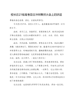 校长在21级高考百日冲刺誓师大会上的讲话尊敬的各位老师、家长,亲爱的同学们:今天是2月27日,农历正月十八,也是距离2024年高考一百天的日子。此时,春天已立,惊蛰将至,春雨润物无声,桃李含苞待放万物生机勃勃,这是生命最好的样子:山在,水在,你在,我在珠玉在侧,无限山河在眼前!此刻,天风浩荡,龙啸隐隐,梦想在远方召唤,热血在胸中沸腾:X高的师生们,聚集在时间广场,隆重举行2024年高考百日冲刺誓师大会,吹响奋进的号角,擂响拼搏的战鼓,为21级学子迈入新的征程呐喊助威!这是青春恰逢其时的出征:龙年,龙乡天时,地利,龙乡学子,一跃龙门待冲天!这次出征,是高三学子青春的奔赴:奔向高考的考场,奔向梦想的诗与远方。十年寒窗,八千里路云和月,学海书山苦与艰为的就是能在高考战场上扬眉出鞘、一试锋芒,过五关斩六将,勇夺桂冠;三年磨剑,千锤百炼水与火,千磨万击还坚劲,为的就是一百天后的龙门梦圆、志达云间,在2024年6月的青春坐标上刻下梦想的高度!这次出征,也是X高与莘莘学子的双向奔赴:奔向一流名校,奔向一高师生共同的星辰大海!正如2126班1月28日早读大屏幕上的激励语:我的成绩=班级成绩,班级成绩=级部成绩,级部成绩=年级成绩=学校成绩!高考,不仅是每个高三学子一个人的战争,更是全体一高人的荣誉之战!这不仅是一场信念与意志的拼搏、肉体与精神的战斗,还是一场关乎人生走向、连接过去与未来的人生奔赴,更是一场对生命意义与教育价值的追求与开创三年疫情的严峻考验,三五教育的全面推进,大五观建设的精神引领,疑探高效课堂的课改力量,激情与专注的核心竞争力,制度和信念的生产力,班主任日日夜夜的陪伴,全体师生的奋斗与梦想,无数家庭的未来与希望,一高人的尊严与光荣,都将在这一战中得到回响。唯有迎战,才能不负龙年龙时代;唯有奋斗,才能不负龙乡少年头!同学们!少年情怀总是诗,多少浪漫待今日!勇士出征,无惧、无泪也无酒,但一定有诗、有歌有豪情!《易经》有言:天行健,君子以自强不息;地势坤,君子以厚德载物。在这新征程的起点,我代表X高的全体教师,以一个预言、两种龙气,为即将奔赴百日征程的21级龙乡学子,加油助威,以志壮行!一个预言是:2024年,是X高龙行神州的本命年、登顶年,是龙乡学子鱼跃龙门的高光年、开创年,希望全体一高人秉龙气、顺天时、乘地利、聚人和,从精神的高峰登临高考和人生的高峰奋发龙精神,开创龙时代,立志第一流,登临犄角尖!两种龙气,既是龙精神的具体表现,也是阴阳相生的龙乡文化,代表了一高人的文化精神和个性气质,是我们开创龙时代的精神支点和杠杆!第一种龙气是乾龙之气,是自强不息的阳刚之气,是飞龙冲天的志气、豪气,是龙战四野的勇气、锐气,是由内到外的龙马精神:龙腾虎跃、龙精虎猛、生龙活虎,一个硬核就是激情,用三个关键词概括就是:信念、突破、拼搏,用100天再造三个自我自信、自强、自律!首先是信念坚定,明白奋斗的意义,不做被人挟裹而行的迷茫者、犹豫者、等待者、旁观者,要做把握人生脉搏的清醒者、奋进者、开拓者、领跑者!以三个不相信、三个相信为备考信念我不相信有完不成的任务,我不相信有克服不了的困难,我不相信有战胜不了的敌人!我相信我是不一样的我!我相信自己生来就是高山而非溪流,欲于群峰之巅俯视平庸的沟壑!我相信自己生来就是人杰而非草芥,站在伟人之肩藐视卑微的懦夫!其次是敢想敢为,敢于突破不可能的思维定势,敢于挑战自己平庸、平凡的价值设定,敢于确立一个激情追求的奋斗目标,以目标激发斗志,以激情引爆核能!我们敢不敢突破昔日的辉煌,再次登顶省市高考的金顶?我们敢不敢想,清北班的孩子都能考上清北?像桃源一中、长郡中学、巴蜀中学那样,每年考上十几、几十个,甚至97个清北?我们敢不敢想,名校班的孩子都能考上重点大学、甚至有人考上清北?一本班的孩子都能考上一本、211甚至985?X高的孩子,敢不敢像韩国前总统金泳三中学时代就在宿舍床铺上贴上未来大总统金泳三的标签,把自己的人生设定为中国未来伟大的科学家(医学家、文学家)某某某?最后是高度自律,拼搏到底。最强悍的竞争力是行动,是坚持!正如美国总统罗斯福所言:有一种品质,可以使一个人从碌碌无为的平庸之辈中脱颖而出。这个品质不是天资,不是教育也不是智商,而是自律。正如罗素所说:人的放纵是本能,自律才是修行。一天坚持不足为奇,一月坚持说明你尚可以,一百天的坚持才证明你是勇者智者!正如1月31日高三学子写在励志小黑板上的两句话:决心成功的人,已经成功了一半。其实成功是什么?无非就是你站起来比倒下去又多了一次!也正如2131班1月16日早读的励志语段:与天斗,有志不惧寒冬;与己斗,勤学不贪安逸!我们要响彻南阳、撬动河南,为自己代言,为X高代言!正如大家熟悉的贾玲,当《你好,李焕英》一举成功时,她说下