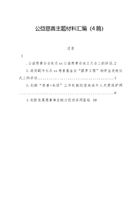 公益慈善主题材料汇编(4篇)目录1.公益慈善会会长在xx公益慈善会成立大会上的讲话.22.政府副市长在xx慈善基金会圆梦工程助学金发放仪式上的讲话.43.创新慈善+未保工作机制织密未成年人关爱保护网..64.创新发展慈善事业助力促进共同富裕10公益慈善会会长在xx公益慈善会成立大会上的讲话尊敬的xx主席,各位领导、各位来宾、各位乡亲大家好!今日云景好,水绿秋山明。在重阳节来临之际,我们在这里隆重举行xx市xx公益慈善会成立大会,共襄xx敬老公益慈善盛举。首先,我代表xx市xx公益慈善会向莅临今天大会的各位领导、各位嘉宾、各位乡亲表示热烈欢迎,并向长期以来关心支持xx敬老慈善事业的各位领导、各位嘉宾、各位乡亲致以崇高敬意和衷心感谢!承蒙理事会信任,委以重托,推选担任首届会长,我深感荣幸,也深感任重道远。有了大家的支持,我对做好xx公益慈善会的工作充满信心,我将与各位同仁一起,尽心尽力、尽职尽责,不负众望,全力做好慈善会各项工作。xx历史悠久、人杰地灵、民风淳朴。xx人历来热心公益、尊老敬老,崇尚献爱心、讲孝德。多年来,在xx镇党委政府、xx一村、二村、三村党支部村委会和老年协会的关心支持下,在社会各界人士广泛参与下,xx村的慈善事业一直蓬勃发展,并取得了一定的成绩。xx市xx公益慈善会将延续xx先生生前敬老济困的义举,以弘扬中华孝道文化,践行敬老爱老优良传统为宗旨,倡导奉献爱心,敬老行善,搭建爱心人士与老年朋友爱心桥梁,为关爱家乡,支持家乡敬老慈善的社会有识之士提供捐助平台,完成他们的捐助意愿,汇聚社会资源,开展敬老济贫等公益项目,行慈善之道,扬中华美德,促进社会和谐。尊老敬老是中华民族的传统美德。老吾老,以及人之老。我们倡议移风易俗,简办婚丧喜庆,节约资金,奉献爱心;我们倡议百元公益,敬老行善,人人可为,日日可行。现在平台已经搭建,希望每一位乡亲共同参与,共同关注xx老年群体,让我们的爱心汇成一股强大的力量,营造一个尊老、敬老、孝老、助老的社会氛围,共同建设一个更加美好和谐的xx。本着对事业、对社会高度负责的态度,慈善会将秉承公开、公正、高效、规范的原则,将每一分善款用在最需要的地方,确保每一份爱心都能够真正温暖每一个需要帮助的人,努力把好事办实,把实事办好。最后,祝与会的各位领导、各位嘉宾、各位会员、各位乡贤身体健康、心想事成,祝xx的明天更美好!政府副市长在xx慈善基金会圆梦工程助学金发放仪式上的讲话各位领导,同志们:很荣幸参加2023年圆梦工程助学金发放仪式,在此,我代表市委、市政府向xx慈善基金会多年来捐资助学的义举致以崇高的敬意,向关心支持我市教育事业发展的社会各界人士表示衷心的感谢。xx集团积极履行社会责任,致力我市慈善事业发展,成立了慈善基金会,为做实做好慈善与社会公益事业建立了规范持久的机制和平台,赢得了社会各界的广泛赞誉。xx集团致富不忘家乡的桑梓情怀,达则兼济公益的仁爱之心,功成回报社会的善行义举,令人敬仰,让人感动,是全社会学习的楷模和榜样。借此机会,讲三层意思。一是表示感谢。桃李不言,下自成溪。一个县级市,能持续数十年开展慈善公益活动的企业不多,能成立慈善基金会企业就少之又少。xx集团多年来慷慨解囊,近五年已累计发放助学金1865.01万元,今年已捐赠助学资金400多万元。在此,我代表市委、市政府向xx集团常怀仁爱之心、恪尽慈善之责、广行济困之举的这份情怀、这份担当、这份爱心,致以崇高的敬意,表示衷心的感谢!二是谈下希望。十年树木,百年树人。慈善事业是社会公益事业,是全社会的共同责任,帮助贫困学生实现大学梦更是关心关爱困难群众的一项大实事,大好事,功在当代,利在千秋。衷心希望社会各界都能向xx集团学习,积极为慈善公益事业增砖添瓦、奉献爱心。三是提点要求。奋楫笃行,众擎易举。各部门要加大对xx集团这种企业善行义举的宣传力度,制定更多的激励措施,引导动员更多的社会力量积极参与、支持慈善事业,形成示范引领,带动更多企业、更多爱心人士积极参与公益事业,让社会关爱的阳光照亮每一个弱势群体的心灵。谢谢大家!创新慈善+未保工作机制织密未成年人关爱保护网未成年人是祖国的未来、民族的希望。扎实做好未成年人保护工作不仅需要政府主导、政策支持,更需要社会慈善力量参与。为推动未保与慈善工作深度融合,xx省xx市xx区以党建为引领、以政策为导向、以社区为平台、以区级未成年人保护中心为阵地,联合慈善机构、社会组织、街道社区,探索慈善+未保有机融合方法及工作机制,实现未成年人保护工作新突破。在调研中破题问计推动政策