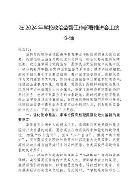 在2024年学校政治监督工作部署推进会上的讲话同志们:坚持党的领导是我国高等教育事业不断前进的最大政治优势,而强化政治监督是高校充分发挥这一政治优势的重要保障机制。政治监督属于党内监督,是督促全党坚持党中央集中统一领导的有力举措,在党和国家监督体系中居于根本和统领地位。高校党组织属于党的基层组织,履行日常监督职责。高校纪委作为党内监督专责机构,如何将政治监督和日常监督贯通协同,推进政治监督具体化、精准化、常态化?高校鲜明的政治属性以及特有的价值属性和社会属性,决定了高校没有脱离政治的单纯业务,也没有脱离业务的抽象政治。新时代高校纪委强化政治监督要透过业务看政治,围绕当前高校面临的形势与任务,找准政治监督和高校业务工作相结合的切入点,创新政治监督的方式方法。下面,我讲几点要求。一、强化使命担当。牢牢把握高校纪委强化政治监督的重要意义高等教育立德树人的根本任务、意识形态阵地建设和服务经济社会发展的功能,要求高校在教育实践中加强党的政治建设,增强四个意识、坚定四个自信、做到两个维护,贯彻落实党的理论和教育方针以及重大决策部署。这是高校成功应对当前形势任务的必然要求,也是高校纪委政治监督的使命所在。(一)政治监督是高校加强两个坚强阵地建设的重要保障。高校需要汇聚海内外优秀人才、营造学术自由的氛围、鼓励探索创新的精神,以承担思想传承、科技创新之使命,发挥服务经济社会发展之功能。与此同时,学校是意识形态工作的前沿阵地,可不是一个象牙之塔,也不是一个桃花源。每个国家都是按照自己的政治要求来培养人才的,高校是坚持党的领导的坚强阵地与培养社会主义建设者和接班人的坚强阵地。而高校学生正处在思想最为活跃的时期,知识体系搭建尚未完成,价值观塑造尚未成型,情感心理尚未成熟。高校纪委强化政治监督,加强对党的教育方针及重大决策部署贯彻落实的监督,是推进高校两个坚强阵地建设、培养四个服务优秀人才的根本政治保障。(二)政治监督是高校始终坚持社会主义办学方向的重要保障。高校不仅是思想的存放地,还是思想的生产地,尤其是创新思想的策源地。随着对外开放的深入推进,一些错误思潮纷纷涌入大学校园,利用各种方式进行思想渗透。伴随着学术研究走向国际前沿,在标榜学术自由的外衣下,诸多蕴含西方价值判断的学术评价标准和教育评价体系,削弱了马克思主义指导思想的地位。党对教育领域的领导和党的建设、思想政治工作亟待加强。《中共中央关于加强党的政治建设的意见》明确指出,加强党的政治建设必须严明政治纪律和政治规矩,决不允许在重大政治原则问题上、大是大非问题上同党中央唱反调,搞自由主义。高校纪委强化政治监督,加强对坚定理想信念宗旨、践行牢记初心使命的监督,督促党员领导干部强化理论武装、增强党性修养,是高校警惕和防止各种错误思潮以各种形式同我们争夺阵地、争夺师生、争夺人心,牢牢掌握意识形态工作领导权和思想政治工作主导权的内在需要。(三)政治监督是高校始终服务于中华民族伟大复兴的重要保障。XXXXXX指出:世界一流大学都是在服务自己国家发展中成长起来的。加强党的政治建设是建设社会主义现代化强国和实现中华民族伟大复兴的政治保障。党的XXX把教育、科技和人才作为全面建设社会主义现代化国家的基础性、战略性支撑,对加快建设教育强国、科技强国、人才强国作出系统安排。加强党的政治建设是高校在基础研究、关键核心技术上攻坚克难的组织优势和政治保障。《意见》指出,基层党组织要着力提升组织力,党支部要发挥好战斗堡垒作用,党员干部要自觉在党和国家工作大局下想问题、做工作。高校纪委强化政治监督,以有力有效的日常监督促进党的教育方针和党中央决策部署落实落地,是高校以国家战略需求为导向,进行原创性、引领性科技攻关,加快建设中国特色、世界一流大学和优势学科的组织保障。政治方向决定着办学道路,高校在全面建设社会主义现代化国家中的突出作用,要求高校推进政治监督常态化,将政治监督贯穿办学治校的全过程、各方面。新征程上,高校纪委强化政治监督要透过业务看政治,回答好监督什么的问题,进而解决好怎么监督的问题。二、强化工作担当,落实落细高校纪委强化政治监督的重点任务高校纪委怎样通过强化政治监督推动解决高等教育改革发展中遇到的具体问题?《中国共产党纪律检查委员会工作条例》明确纪委日常监督方式主要包括:座谈,召集、参加或者列席会议,了解党内同志和社会群众反映;查阅查询相关资料和信息数据;现场调查,驻点监督;督促巡视巡察整改;谈心谈话,听取工作汇报,听取述责述廉;建立健全党员领导干部廉政档案,开展党风廉政意见回复等工作。开展专项监督,针对落实党中央决策部署中的突出问题,行业性、系统性、区域性的管党治党重点问题,形式主义、官僚主义、享乐主义和奢靡之风问题,群众反映强烈、损害群众利益的突出问题加强监督检查