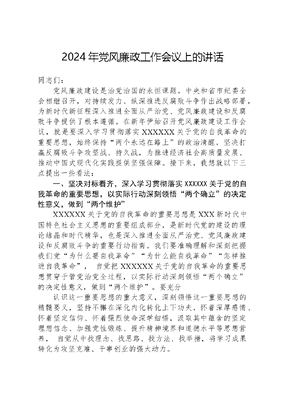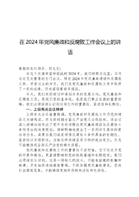 2024年党风廉政工作会议上的讲话同志们:党风廉政建设是治党治国的永恒课题。中央和省市纪委全会相继召开,对持续发力、纵深推进反腐败斗争作出战略部署,为新时代新征程深入推进全面从严治党、党风廉政建设和反腐败斗争提供了根本遵循。在新年伊始召开党风廉政建设工作会议,就是要深入学习贯彻落实XXXXXX关于党的自我革命的重要思想,始终保持两个永远在路上的政治清醒,坚决打赢反腐败斗争攻坚战、持久战,为推进经济社会高质量发展、推动中国式现代化实践提供坚强保障。接下来,我想就以下三点提出一些看法:一、坚决对标看齐,深入学习贯彻落实XXXXXX关于党的自我革命的重要思想,以实际行动深刻领悟两个确立的决定性意义,做到两个维护XXXXXX关于党的自我革命的重要思想是XXX新时代中国特色社会主义思想的重要组成部分,是新时代党的建设的理论结晶和时代精华,也是深入推进全面从严治党、党风廉政建设和反腐败斗争的重要行动指南。我们要准确理解和深刻把握我们党为什么要自我革命为什么能自我革命怎样推进自我革命, 自觉把XXXXXX关于党的自我革命的重要思想贯穿于管党治党全过程,以实际行动深刻领悟两个确立的决定性意义,做到两个维护。要充分认识这一重要思想的重大意义,深刻领悟这一重要思想的精髓要义,坚持不懈在深化内化转化上下功夫,怀着深厚感情、怀着坚定信仰、怀着强烈使命深学细悟,汲取其中蕴含的坚定理想信念、加强党性锻炼、提升精神境界和道德水平等思想营养, 自觉从中找理念、找思路、找方法、找举措,将学习成果转化为攻坚克难、干事创业的强大动力。第一,深刻理解坚强的领导核心是党的自我革命不断从胜利走向胜利的根本保障。党的创新理论是党的自我革命的制胜法宝,XXXXXX就推进党的自我革命提出一系列新理念新思想新战略,为反腐败斗争取得压倒性胜利并全面巩固提供了强大思想武器,为坚决打赢反腐败斗争攻坚战持久战提供了科学行动指南。党风廉政建设工作必须坚持以XXX新时代中国特色社会主义思想为指导,以XXXXXX提出的一系列关于党的自我革命的新理念新思想新战略统领各项工作,回答和解决新时代新征程上党风廉政建设和反腐败斗争面临的重大问题。深刻领悟两个确立的决定性意义,增强四个意识、坚定四个自信、做到两个维护,使之转化为深入推进新时代新征程党风廉政建设和反腐败斗争工作高质量发展的强大奋进力量,转化为坚定不移正风肃纪反腐的具体行动,转化为坚定维护党的先进纯洁、永葆党的生机活力的实际成效,不断开创自我革命的新境界。第二,深刻把握XXXXXX关于党的自我革命的重要思想的重大意义。中国共产党作为长期执政的马克思主义政党,同时也是世界最大的执政党,必须回答好、解决好的根本性问题就是如何永葆先进性和纯洁性、永葆青春活力,如何永远得到人民拥护和支持,如何实现长期执政。XXXXXX关于党的自我革命的重要思想,深刻阐述了党的自我革命的重要思想的丰富内涵,明确回答了我们党为什么要自我革命、为什么能自我革命、怎样推进自我革命等重大问题,系统提出深入推进党的自我革命实践需要把握好的九个间题。这些重要论断是围绕建设长期执政的马克思主义政党这一重大时代课题所提出的,着眼于破解大党独有难题,源于实践更引领实践,彰显了新时代中国共产党人推进党的建设新的伟大工程的历史主动,标志着我们党对马克思主义执政党建设规律的认识达到了新高度。第三,深入学习贯彻落实XXXXXX关于党的自我革命的重要思想。XXXXXX明确强调,不断深化对党的自我革命的规律性认识,把党的自我革命的思路举措搞得更加严密,把每条战线、每个环节的自我革命抓具体、抓深入。这既是推动党的自我革命的重要原则,也是始终坚持党的自我革命的目标要求。深入学习贯彻落实XXXXXX关于党的自我革命的重要思想,是新时代新征程纵深推进全面从严治党、党的自我革命的必然要求,是坚决打赢反腐败斗争攻坚战持久战的根本保障。学习贯彻落实这一重要思想,不仅要在理论层面上悟透其思想内涵,更要在实践中把握遵循。二、坚持全面从严,始终保持两个永远在路上的政治清醒,永远吹冲锋号,把严的基调、严的措施、严的氛围长期坚持下去。过去一年,我们坚持以XXX新时代中国特色社会主义思想为指导,贯彻落实全面从严治党决策部署,深入开展第二批主题教育,扎实开展纪检监察干部队伍教育整顿,坚定不移推进党风廉政建设和反腐败斗争,政治生态持续向好,清廉建设持续深化,干部作风持续优化,反腐力度持续加大。我们党要始终保持党的先进性和纯洁性,始终赢得人民拥护和巩固长期执政地位,就必须时刻牢记两个永远在路上,时刻保持解决大党独有难题的清醒和坚定。要常态长效抓好党性教育,严格党员教育管理,引导党员干部担当作为,落实组织生活制度,深化学习活动,推动学用结合。加强党员党性修养是这一系统工