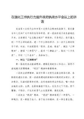 在强化工作执行力提升政府执政水平会议上的讲话在省第×次党代会和市第×次党代会精神的鼓舞下,寄托着全市人民和广大干部的信任和希望,新一届政府班子肩负着继往开来、全面建设生态魅力城市的使命,任务艰巨,责任重大树一个什么样的政府,建一个什么样的班子,当一名什么样的领导干部,对此,市政府围绕责任、忠诚、敬业,树立三种精神,增强三种勇气,提升三种能力,做到三个负责,作好三个表率,具体如下:一、树立三种精神新一届政府务必振奋精神,增强发展的信心和决心,始终不渝地树立拼搏精神、亮剑精神和奉献精神。一是树立拼搏精神。面对市第×次党代会提出的各时期、各阶段的建设任务,新一届政府遇到的困难和问题将更加艰巨、更加复杂。但面对困难和问题,没有退缩的理由和机会,唯一的办法就是去拼、去搏。在困难面前不低头、在压力之下不脱,用不服输、不怕苦、不低头的勇气去克服困难,推进发展。二是树立亮剑精神。亮剑精神体现了一种勇气,一种魄力,是一种敢于战斗、善于战斗的精神,是一种自重自强、主动出击、锲而不舍的动力,是一种敢于负责、压倒一切的绝地反击。新的伟大事业需要继续勇往直前,需要站在一个更高的平台上,用更加科学的视角去谋划去实施,去解决工作中遇到的各种困难。如果缩手缩脚、左顾右盼、畏难不前,将碌碌无为,丧失发展机会。三是树立奉献精神。无私奉献精神从广义来说就是为国家、为人民办事而不计较报酬、不讲回报,是党和国家一直以来都倡导的高尚行为。学习这种无私奉献的精神,立足岗位,胸怀全局开拓创新,锐意进取,追求卓越,努力开创各项工作的新局面,真正做到在工作的关键时刻能够冲得出来,在工作最需要的时候能够豁得出去。二、增强三种勇气不断增强政治勇气、实践勇气和创新勇气,不为任何风险所惧,不为任何干扰所惑,坚定不移地推进工作,推进事业。一是增强政治勇气。加快发展,不仅是一项重要的经济任务,更是一项重要的政治任务。当前,我市的发展正处于最为关键的后来居上的追赶时期。作为新一届政府,坚持把发展放在首位,举全部之力、集全部之智,一切服务、服从于我市的建设事业,以更加强烈的历史责任感,以更加强烈的政治勇气,忠诚于我市的发展事业,只争朝夕,抓好工作落实。二是增强实践勇气。在我市当前艰苦的建设工作面前,新一届政府面临的挑战和遇到的问题是前所未有的,也是史无前例的如何准确把握历史机遇,形成齐心协力加快发展的合力;如何坚定信心、苦干实干、主动有为、超常工作,有力、有序、有效地推进各项建设工作;如何直面挑战和困难,摒弃落后意识,勇往直前,需要所有政府班子成员在学习中实践,在实践中探索,在探索中挺进。三是增强创新勇气。创新是引领事业不断向前的源泉。因循守旧、固步自封,思想僵化,将给事业发展带来灾难。成就事业必须增强创新的勇气,善于用创新的思路、手段和方法,解决工作中面临的新情况新问题。实践永无止境,创新永无止境。只有勇于变革、勇于创新,永不僵化、永不停滞,才能推动事业顺利向前。三、提升三种能力面对发展中出现的诸多困难、问题和矛盾,必须提升应有的能力和智慧。一是提升勇担责任的能力。当前,在面临园区重建、机场搬迁、枢纽建设、矿区治理等事关全局的重要工作中,有些工作落实不到位,症结是少数干部责任意识不强,能推则推、能拖则拖缺乏主动承担、动真碰硬、一抓到底的精神。有的工作仅停留于简单安排上,而未去深入推动,有的未能及时协调解决工作中遇到的矛盾和问题,导致工作落而不实。抓落实的过程,实质上就是责任传递的过程,责任一传到底,工作才能一抓到底;责任链条有缝隙,工作必然产生梗阻。作为市政府班子成员,应勇于承担风险和责任,为官一任,造福一方。二是提升攻坚破难的能力。当前全省各地、全市各地的经济社会发展你追我赶,处在关键时期。既面对难得的机遇,又面临着严竣的挑战。能不能打好、能不能打赢这场硬仗,关键看有没有决心、有没有信心,敢不敢担当、敢不敢碰硬。市政府班子成员必须加强对所分管、联系部门的管理,着力破解部分单位和部门工作不在状态、服务意识差、决策部署落实难、部门利益至上办事效率低下等问题,真正树立起敢于担当、敢于碰硬的勇气和魄力,做到勤政有为、善政有方。三是提升统筹协调的能力。统筹协调是领导工作的一种综合能力,是一个领导干部素质的基本要求。必须在坚持原则的基础上,把握全局,突出重点,协调各方。面对繁重的工作任务,主动加强上下级之间、部门之间、干部之间的沟通协调,在沟通中寻求了解,在了解中寻求理解,在理解中寻求支持和帮助。四、做到三个负责所有政府班子成员都应履职尽责,对所分管、联系部门敢抓敢管,真抓实管,及时指导好部门工作,及时解决好部门工作中遇到的问题。服从市委的工作安排,对市委分配的中心工作、专项工作积极承担,不推不拖。一是对承担工作负责。有敢于负责的态度