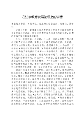 在法学教育发展论坛上的讲话尊敬的X书记、X副书记,在座的各位企业家、老师们、同学们:大家上午好!我很高兴代表教育部法学类专业教学指导委员会参加这次活动,对X法学X华诞表示最热烈的祝贺,向X的老师们致以最诚挚的敬意。今天,我要回答一个问题:什么是一流的法学院?刚才廖书记做了X年的回顾,谢勇主任又做了凝练的概括。我觉得,我们X法学院就是一流的法学院。你们每十年上一个台阶:X年前在X率先创立法学学科,X年前率先获得法学硕士学位授权,20年前又率先获批X省第一个法学博士点。现在,X的法学已经形成了自己的特色。刚才大家都听到了,学科上有特色:多元化纠纷解决研究、知识产权、非洲法、监察法的研究,都是全国领先;办学体制也有特色,一部三院,这种体制是国内其他学校没有的。要给一流的法学院下一个定义很困难,但只要坚持特色办学,就一定会办成中国一流甚至世界一流。我访问过X多所著名法学院。访问X大学时,他的法学院院长告诉我,X法学院是X最好的法学院。我问他根据是什么?他说,X前十名法学院的师资基本上都是哈佛出身,X是培养优秀法学院的大学。我去X大学,耶鲁法学院院长对我说,X法学院是X最好的法学院。我又问他根据,他回答地很干脆。他说法学院要培养政治家。法学和政治学是密切结合在一起的,法学是治国理政之学。最高水平的治国理政,就是看你培养了多少政治领袖。耶鲁大学法学院出了五位X总统,所以耶鲁是最好的法学院。我去XX大学,斯坦福法学院也说,我们是X最好的法学院,我再问他们的根据,他们说,X的法学教育有两大特点:一是精英教育,二是职业教育。最终,法学院的毕业生都要从事法律职业。在X,法律职业的最高代表就是X联邦最高法院的首席大法官和其他大法官。你看,现任九位大法官当中,有三分之一是XX毕业的,远远高于X、高于X,所以,XX法学院就是X最好的法学院。再到X去,X法学院院长说,我们法学院是全美甚至世界最好的法学院。我问他的根据。他说,你看,世界各国到X来留学的法学优秀人才,都集中在我们这儿,我们为世界各国培养了元首、总理、大法官。这个数量是哈佛、耶鲁、斯坦福的总和,所以,我们是最好的法学院。大家可能听出来了,最好的法学院没有固定的标准,只要你能办出特色,就一定是最好的。所以我很欣赏X法学院特色办学的思路。当每一个法学院院长都说自己学院最好的时候,这里面有它的共性。哈佛为什么说是最好的?X大学的法学是X法学的策源地,他们向各个学校输送最优秀的师资。师资代表着理论水平,有什么样的教授就有什么样的大学。X说它是最好的,是因为它培养的人才,它对国家的政治贡献高于其他学校。XX说自己是最好的,因为它把法律当作职业,培养职业的法律家就是它的办学思路。X说它是最好的,是它把文化交流与融合作为自己的办学特色。可以说,只要有自己的特色,就一定会成为最好的法学院这就是我认为的一流法学院的标准。在X、X,大家不说,我们要办一流的法学或者一流的大学。经常挂在他们校长、院长嘴边的是,我们要办受人尊重的法学我们要办受人尊重的大学。受人尊重就是办学的最高标准。一流很难把它量化,但受人尊重是存于世人心中的。这就是西方法学教育给我们的启示。如果用这个标准衡量X法学院,它也是中国一流的法学院,所以,南方法学明珠的称号当之无愧。下午我们会举办法学教育发展论坛。在座的有同学、老师有企业家,也有官员。我想分别向大家讲几句话。X多年前我也是学生。对同学,我想说:今天我们的法学应该培养学生什么样的能力?或者养成怎样的能力?我给同学们提几个建议。法学的本质是批判,批判性是法学最重要的特征。当然,这个学科还有另一个特点,要求守成。批判是指的批判现实,批判制度。守成是指能够守护这个国家的立场,守护这个国家的制度。法科学生要兼具这两种能力。当你离开学校的时候,你可以检验一下是否具有了法治思维,或者叫法学思维。法学思维的一个特点就是,不轻易赞同别人的观点。如果别人的论据非常充分,你实在没有办法反驳了,那么要用另一种方式表达,就是守成。这就是法学思维。当你这种思维养成了,你的批判能力就养成了,你的守成能力也就养成了。法学又是一门实现公正的艺术,将来你从事法律职业的时候,你会面临许多价值冲突。法律职业就是为消除价值冲突而存在的。有几个最典型的冲突,你每天都会遇到:自由与平等的冲突,生存与发展的冲突,公平与效率的冲突,秩序与活力的冲突。在大学这几年,如果你能够学会消除这些价值冲突,具备消除价值冲突的能力,那么你就掌握了实现公正的这门艺术。所以,对于法科学生来说,大学就是要学会消除价值冲突。当然,作为法科学生,我们要汲取一些教训。我们有一所大学的同学去X中级法院实习,三个月后离开了。X的一位企业家就追到他的学校,要求他返还已经拿走的X万元,因为这位同学实习的时候,对企业家说自己是X法院的法官,于是企业家
