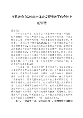 在县政府2024年全体会议暨廉政工作会议上的讲话同志们:一年之计在于春。在全县上下攻坚冲刺一季度开门红的关键时期,今天召开这次会议,主要基于两点考虑,一是总结过去工作,分析研判形势,对全年重点任务进行再安排、再部署;二是深入学习贯彻XXXXXX在二十届中央纪委三次全会上的重要讲话,以及国务院第二次廉政工作会议、省政府第二次廉政工作会议和市政府廉政工作会议精神,纵深推进县政府系统廉政建设,全力护航县域经济高质量发展。刚才,县发改局通报了元至二月经济运行及重点项目建设情况,县纪委监委、县委组织部分别通报了有关情况。希望大家自觉对标找差,固强补弱,以全省争一流、全市走前列的志向和气魄,推动各项工作再上新台阶。全省争一流、全市走前列是市五届人大五次会议期间市委书记武文罡在参加石泉代表团审议时,赋予石泉新的使命。他指出,石泉历来是出成绩、出经验、出亮点的地方,要始终保持全省争一流、全市走前列的进取精神,奋力推动各项工作争先进位。要求我县在培优支柱产业上当标杆作示范、在推进乡村振兴上当标杆作示范、在加快开放发展上当标杆作示范、在生态文明建设上当标杆作示范、在构建良好政治生态上当标杆作示范。文罡书记的讲话充分体现了市委对石泉发展的殷切期望和关怀厚爱,对我们来讲既是鼓舞、更是鞭策。我们要深入学习领会,认真抓好落实,努力把文罡书记为石泉擘画的宏伟蓝图变成美好现实。下面,我讲三点意见:第一,全省争一流、全市走前列,要始终保持清醒知大势过去一年,全县政府系统紧扣高质量发展主题,坚持以廉洁自律、勤政为民为基准,强化抓实干、重实绩、强实效的鲜明导向,推动经济社会发展和党风廉政建设取得了新成效。一是政治引领强基铸魂。结合学习贯彻XXX新时代中国特色社会主义思想主题教育,深入学习必读、选读书目和重点篇目,跟进学习XXXXXX重要讲话和重要指示批示,县政府领导牵头完成调研课题16个,转化工作措施44个,解决突出问题57件,政府系统学思用贯通、知信行合一的能力水平持续提升。坚持旗帜鲜明讲政治,高质量完成省委巡视反馈意见整改、秦岭生态环保及耕地流出问题整改、违规坟墓整治、企业清欠等重大任务。二是直面挑战攻坚克难。面对经济运行深度承压、矛盾风险交织叠加的复杂严峻考验,以三个年活动为抓手,着力调稳并进提升质效、优化结构转换动能、正向发力催生增量,全县生产总值增长1.8%(全市第4位),固定资产投资增长10%(全省第15位、全市第1位),社会消费品零售总额增长4.2%(全市第1位)。石泉预制菜产业跻身全国百强榜单(全国第80位、全省第1位),入选省级中小企业特色产业集群,园区特色化发展得到赵刚省长的充分肯定;文旅消费加快恢复,全年游客接待人次、旅游综合收入按可比口径分别增长13.4%、5.52%。三是转变职能优化服务。深入实施营商环境突破年活动,创新建立招商引资与重点项目审批协同联动、亲商助企日暨政企晚餐交流会等制度,大力推广审前服务+项目管家陕企通平台,全面推行县长营商环境三本账、企业帮扶六个一等制度,狠抓惠企纾困解难,政务服务、政策环境不断优化。去年一季度高质量项目推进成效获全省通报表扬,二季度营商环境突破年考核排名全市第一。四是践行宗旨为民造福。10件民生实事项目完成年度任务,民生支出占比达87.1%。新增城镇就业1366人,农村劳动力转移就业4.69万人,城乡居民人均可支配收入分别增长4.8%和文可居文库——海量学习资料,手机电脑均可下载www.wenkeju.com8.1%。教育、医疗、文化、体育事业统筹推进,高考考入双一流大学人数再创新高。安全生产、防汛防滑、信访维稳、社会治安防控有力有效,圆满完成中国-中亚峰会维稳安保任务,荣获全省重大专项活动维稳安保工作先进集体。五是争先创优氛围浓厚。大力弘扬创优精神,积极探索实践创新,先后荣获国务院大督查综合督查激励,三项工作考核位居全省前列,十三项工作获得省级及以上督查激励,四项工作入选省级及以上创建县名单,十个省级及以上现场会在石泉召开,中宣部高质量发展调研行主题采访活动走进石泉,我县在全省新型工业化推进会暨县委书记工作交流会上交流发言,聚力融合发展、推进富民强县做法成效得到省委书记赵一德、市委书记武文罡的批示肯定。六是拉高标杆从严治政。建立周清单、旬报告、月晾晒制度,强化三色预警、三线督办,办结人大代表建议166件、政协提案107件。扎实推进依法行政和法治政府建设,深入开展干部作风能力提升年活动,强化乡村振兴、教育、医疗、住房等重点领域专项整治,政风行风和干部作风持续好转。在肯定成绩的同时必须看到,工作中面临的困难挑战,以及存在的问题和不足:一是经济基础仍然不牢。项目数量少、质量不优,引领支撑全局的旗舰型项目较为缺乏,全