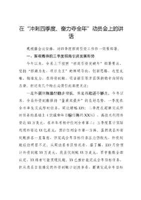 在冲刺四季度、奋力夺全年动员会上的讲话现根据会议安排,对四季度招商引资工作作一简要部署。一、客观看待前三季度招商引资发展形势今年以来,全县上下按照招商引资突破年部署要求,坚持招商为先、项目为王的鲜明导向,创新思路、攻坚克难、精准发力,在外资到账、项目招引等方面保持稳中向好的态势。但还有几个特点必须引起高度关注:一是外到然步增,但是后不足。资账虽稳长劲还够今年以来,全县外资到账保持量质双提升的良好态势,一季度在全市率先完成序时任务,同比增幅XX%;二季度在超额完成序时任务的基础上(完成全年目任的标务XX%),高技术利用外资达XX万美元,在半年考核中位列全市第二;三季度累计实际利用外资达XX亿美元,预计位列全市第一方阵。虽然我县外资到账排名一直靠前,但完成全年目标任务压力仍较大,外资到账后劲明显不足。从周边县市区情况看,据了解,XX9月份预计外资到账XX万美元,我县仅到账XX万美元,若申报数全部认定,XX将有可能实现反超。XX已预计能完成全年目标任务,但从我县目前排定的外资到账计划清单看,距离完成全年目标任务缺口较大。从完成序时情况看,前三季度我县完成序时任务的88.45%,但按照XX市提出的前三季度需完成全年任务90%的要求,我县仅完成序时任务的XX%,距离完成序时任务压力较大。从项目推进情况看,全县3000万美元以上重大外资项目短板明显,新设外资企业较少,并且已签约注册外资项目推进缓慢,X个已注册3000万美元以上外资项目中,目前仅X个项目有外资到账,实际到账低于预期。二是目招引走在项全市前列,但是质量还不够高。今年以来,我县项目招引工作一直位于全市领先位置,一季度签约注册重大项目XX个(5亿元以上内资项目8个,3000万以上外资项目4个),位列全市第三;二季度累计签约注册重大项目30个(5亿元以上内资项目XX个,3000万以上外资项目X个),完成率56.6%,位列全市第三;三季度累计签约注册重大项目53个(5亿元以上内资项目XX个,3000万以上外资项目X个),预计位列全市第X。虽然我县签约注册项目取得一定的成绩,但距离完成市对县下达的任务还有一些差距。比如,大体量的项目相对偏少,目前50-100亿元签约注册项目仅1个(市下任对县达务数为2个),100亿元以上重特大项目还未实现零的突破。比如,项目质态还不够高,XX个新签约注册重大项目中,投资主体为高企、上市企业、专精特新小巨人企文可居文库——海量学习资料,手机电脑均可下载www.wenkeju.com业的共17个,占比不足三分之一。从项目研判情况看,有的项目仍处于价值链低端,科技含量高、产品附加值高、投入产出高的高质量项目还比较少。再比如,各板块间不平衡性较大,有的镇区贡献度较高,XX新签约注册重大项目占全县比重超30%,XX等乡镇都相继落户了5亿元以上重大项目,但仍有小部分镇区距离完成县下达的目标任务有较大差距。三是招商活体有有色,但是成效不著。动总声还够显今年以来,我县以招商引资突破年为总抓手,重点开展百日竞赛和秋季攻坚活动,采取线上和线下相结合的方式,精准发力、定向招商。一季度举办了XX、XX(上海)投促周等活动,在疫情严控的形势下,重点开展四天两云一周两云等云洽谈活动超百余场;二季度召开了泛半导体、新材料等产业专题招商对接会,与百余名客商进行深入交流洽谈,取得了一定成效;三季度举办了XX(杭州)文化旅游招商推介、壳牌集团专场对接等专题招商活动,签约落户了一批项目。虽然全县上下都投入了大量精力,参加和组织了各种交流会和投促活动,但成效还不够显著。一方面,走出去力度还不够大。从全县招商引资争先进位微信群中可以看到,有些镇区主要领导、分管领导一直在积极外出招商、考察项目、洽谈对接,有些镇区仍存在坐等客商上门的错误观念,走出文可居文库——海量学习资料,手机电脑均可下载www.wenkeju.com去开展招商洽谈的频次还不够高。另一方面,项目落地见效还不够快。部分镇区对在手在谈的优质项目,盯不紧、抓不牢、推不快,对于洽谈推进过程中存在的堵点难点,比如审批、用地、政策等问题,未能及时想办法沟通解决,最终没有尽快转化为招商成效。二、深刻把握奋战四季度攻坚重点四季度是冲目标、定全年、保全局的收官阶段,必须吹响冲锋号、发起总攻战,紧盯任务缺口、把握工作重点、集中力量攻坚。同时,四季度又是为明年谋思路、打基础、早发力的关键阶段,必须抢抓机遇、奋力拼搏、开辟新局。一是紧盯一个快字。四季度已过了15天,距离年底收官不足80天,在这样一个特殊时点,要倒排作战工期,确保高效率、高标准、高质量完成招商引资各项任务。一要快马加鞭推外资。当前,我县外资到账仅完成年度指标的66.34%,距离目标任务仍有1.6亿
