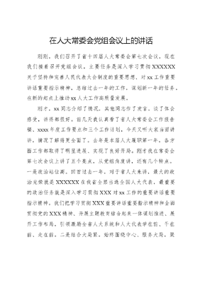 在人大常委会党组会议上的讲话刚刚,我们召开了省十四届人大常委会第七次会议,现在我们接着召开党组会议,主要任务是深入学习贯彻XXXXXX关于坚持和完善人民代表大会制度的重要思想、对xx工作重要讲话重要指示精神,总结过去一年的工作,谋划新一年的任务,在新的起点上推动xx人大工作高质量发展。刚才,xx同志介绍了情况,其他同志作了发言,谈了体会感受,讲得都很好。前几天我认真看了省人大常委会工作报告稿、xxxx年度工作要点和三个工作计划,今天又听大家当面讲讲,情况了解得更全面了。去年是本届人大履职第一年,各方面工作都取得了明显进展、实现了良好开局。刚才我在常委会第七次会议上讲了五个亮点,从党组角度讲,还有几个特点。一是政治站位高。回首过去一年,对于省人大来讲,最大的政治光荣就是XXXXXX在我省全票当选全国人大代表,最重要的政治任务就是深入学习贯彻XXX对xx工作的重要讲话重要指示精神。我们把学习贯彻XXX重要讲话重要指示精神和全面贯彻党的XXX精神、开展主题教育结合起来一体谋划推进、展开工作布局,引领激励全省人大系统和人大代表学在前、干在前、走在前。二是结合大局紧。始终围绕中心、服务大局,聚焦四个走在前、四个新重大要求,谋划安排立法、监督、代表等工作,特别是围绕推动经济运行率先整体好转专门安排了xx个监督项目,围绕民生突出问题组织开展就业、双减、安全生产等立法监督工作,推动中央决策部署及省委工作安排落地落实。按照省委定x年、谋x年、展望xx年工作思路,把抓当下与谋长远结合起来,相应提出了人大工作的阶段性目标,有力保证了人大工作始终与省委中心工作同频共振、同向发力。三是创新举措实。去年有不少首次、首创、创制性工作,比如首次听取并审议省人大常委会任命人员履职情况报告,首次召开开发区人大工作推进会,首次向公民、人大代表、基层立法联系点等颁发立法建议采纳证书,等等,不少举措得到全国人大肯定,赵乐际委员长在讲话中多次予以肯定和鼓励。四是自身建设严。扎实开展牢记嘱托、感恩奋进学习实践活动,出台关于提高人大常委会审议质量、加强人大机关作风建设等规定,人大常委会组成人员、人大代表、机关干部的政治意识、责任意识、履职能力有了新提升。这些成绩来之不易,是省人大常委会党组各位同志齐心协力、共同努力的结果。在此,我对大家一直以来的辛勤付出表示感谢,对省人大机关干部职工表示问候!XXXXXX关于坚持和完善人民代表大会制度的重要思想,文可居文库——海量学习资料,手机电脑均可下载www.wenkeju.com是新时代加强和改进人大工作的根本遵循。前不久,全国人大专门召开交流会,赵乐际委员长对全面系统学习这一重要思想、创造性抓好贯彻落实提出明确要求。全省各级人大都要把学习好宣传好贯彻好这一重要思想作为基本功和必修课,持续在深化、转化上下功夫,以更高站位、更高标准、更高要求扎实做好人大各项工作。这里,我结合学习宣传贯彻这一重要思想、做好今年省人大工作,讲几点意见。第一,坚持党的领导,在拥护两个确立、做到两个维护上不断增强政治自觉。XXX强调,人民代表大会制度是党领导国家政权机关的重要制度载体。我们必须把坚持党的领导具体地、现实地落实到人大工作全过程各环节,无论是行使立法、监督、决定、选举任免等职权,还是开展代表、外事、新闻宣传等工作,都要自觉同XXX新时代中国特色社会主义思想和党中央精神对标对表,严格执行请示报告制度,重大事项、重要工作主动及时向省委请示报告。去年,按照省委部署,省人大牵头开展了加强和改进人大工作《意见》贯彻落实情况的专项督查,指出了一些问题,今年要持续抓好整改落实,推动各地各部门真改、实改、改到位。思想统一是政治统一、行动统一的基础,要建立巩固拓展主题教育成果的长效机制,坚持不懈用XXX思想凝心铸魂,更好用以统揽和指导新时代人大工文可居文库——海量学习资料,手机电脑均可下载www.wenkeju.com作。第二,坚持聚焦中心,在服务高质量发展走在前列上彰显更大作为。XXX强调,地方人大及其常委会要围绕地方党委贯彻落实党中央大政方针的决策部署,创造性地做好立法、监督等工作,更好助力经济社会发展和改革攻坚任务。上个月召开的省委经济工作会议,聚焦经济建设这一中心工作和高质量发展这一首要任务,明确了今年x个方面重点工作,省人大要找准服务中心大局的切入点、发力点。比如,立法工作上,要突出抓好数据条例、产业技术研究院发展促进条例、生态环境保护条例等立法修法工作,发挥好立法对改革发展的引领推动作用。监督工作上,要协同抓好省委x个行动方案和x组若干措施的监督推动,开展好xx流域工业污染防治、服务xx实验室建设、深入推进制造业智改、数转、网联等监督项目,寓支持于监督之中,助力解决经济社会发展中的矛盾和问题。第三,