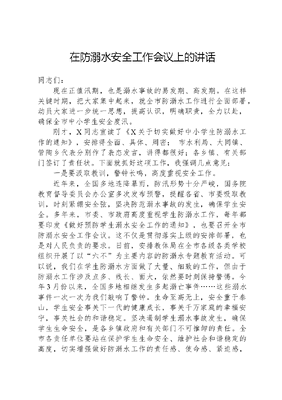 在防溺水安全工作会议上的讲话同志们:现在正值汛期,也是溺水事故的易发期、高发期。在这样关键时期,把大家集中起来,就全市防溺水工作进行全面部署,动员大家进一步统一思想,提高认识,明确职责,全力以赴,确保全市中小学生安全度汛。刚才,X同志宣读了《X关于切实做好中小学生防溺水工作的通知》,安排得全面、具体、周密; 市水利局、大同镇、管陶乡代表分别作了表态发言,讲得都很好;各乡镇、有关部门签订了责任状。下面就抓好这项工作,我强调几点意见:一是要汲取教训,警钟长鸣,高度重视安全工作。近年来,全国多地连降暴雨,防汛形势十分严峻,国务院教育督导委员会办公室多次发布预警,提醒各省、市要吸取教训,时刻紧绷安全弦,坚决防范溺水事故的发生,确保学生安全。多年来,市委、市政府高度重视学生防溺水工作,每年都要印发《做好预防学生溺水安全工作的通知》,也要召开全市防溺水安全工作会议。这不仅是贯彻落实上级的安排部署,也是对人民负责的要求。日前,安排教体局在全市各级各类学校组织开展了以六不为主要内容的防溺水专题教育活动。可以说,我们在学生防溺水方面做了大量、细致的工作,但由于防溺水工作涉及点多、线长、面大,依然要时刻保持警惕。今年3月份以来,全国多地相继发生多起溺亡事件……这些溺水事件一次一次为我们敲响了警钟。生命至高无上,安全重于泰山,学生安全事关下一代的健康成长,事关千万家庭的幸福安宁,事关社会的和谐稳定。坚决遏制学生溺水事故发生,确保学生生命安全,是各乡镇政府和有关部门不可推卸的责任。全市各责任单位要站在保护学生生命安全、维护社会和谐稳定的高度,切实增强做好防溺水工作的责任感、使命感、紧迫感,汲取教训,警钟长鸣,把防溺水安全工作抓紧、抓实、抓细,确保全市广大学生安全度夏、安全度假。二是要全面摸排,迅速整改,坚决消除各类安全隐患。各乡镇政府、村委会要把排查各类安全隐患作为预防学生溺水的重要举措,根据本地自然环境和灾害分布特点及灾害诱发因素,立即对辖区内的溺水安全隐患进行一次全面、彻底、拉网式的严密排查,特别是对河流湖泊、水塘水库、积水坑地等危险区域要全面排查,认真整改。针对排查出来的安全隐患,录入台账,落实整改责任人和整改时限,实行挂账清零整改,真正做到责任明晰无缺位、隐患排查全覆盖、整改清零无遗漏。要对本辖区内所有水域进行责任划分,确定每一片水域管理的主体责任单位,并签订防溺水安全管理责任书。各主体责任单位要将水体管理责任进一步分解,明确到每一个人、每一片区域、每一个时段。要对所管理水域采取防溺水措施,按有关要求设置警示标志、防护栏、隔离带和救生设备,及时消除隐患,保障青少年学生人身安全。三是要加强教育,做好宣传,提高学生安全防范意识学生安全宣传教育是全社会的共同职责。教育行政部门和各级各类学校要在构建安全教育和安全防范长效机制上下功夫,通过给学生家长发放安全提示卡、发送安全教育短信、打电话、编演安全教育情景剧等方式,将安全教育寓教于乐,切实增强安全教育的生动性和吸引力,全面提升安全教育的实效性,真正做到校内与校外、平时上学与课外期间无缝对接,学校与家庭、学期与假期紧密结合,实现安全教育与安全防范在时间和空间上的全覆盖。新闻媒体单位要把握正确舆论导向,在电视、报纸、网络等媒体开设专栏,大力营造远离危险,珍爱生命,安全第一的舆论氛围,把涉及暑期学生安全特别是防溺水的公益广告、宣传片、基本常识和家长的责任义务反复向全社会进行宣传、报道,使防溺水知识家喻户晓、深入人心。移动、联通、电信的短信平台,向全社会发送防溺水公益短信。公交文可居文库——海量学习资料,手机电脑均可下载www.wenkeju.com车和出租车的车载显示屏,滚动播放少年儿童防溺水知识。各村(居)委会要通过广播、宣传栏、标语等途径,宣传学生防溺水知识,切实形成多角度、全方位青少年学生防溺水安全宣传教育氛围。 四是要履职尽责,齐抓共管,杜绝溺水事故发生《省预防中小学生溺水管理办法》确立了以本级政府为主导、各有关部门协作、乡村两级为主的学生溺水预防机制,明确指出了各级各有关部门对预防学生溺水应负的责任。各有关部门要按照《办法》要求,针对暑期季节特点、地质地域特点和学生年龄特点,各司其职、各负其责、齐抓共管,有针对性地做好预防青少年学生溺水等各项安全工作。教育行政部门和学校要针对当前暑期和汛期特点,切实加强学生防溺水教育,增强安全教育的预见性,把防溺水基本知识传达给每一个学生,提醒到每一名家长,宣传到每一户学生家庭,充分发挥学生家长第一监护人的作用。水利、住建、园林、自然资源和规划等负有水域监管职责的部门和主体责任单位要对负责水域开展拉网式隐患排查整治,关口前移,及时整改溺水隐患。要完善水域防溺水三个一设施的设置,在每一段、每一片水域悬挂一幅防溺水宣传标语,明显位置设置一个防溺