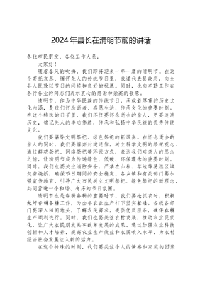 2024年县长在清明节前的讲话各位市民朋友、各位工作人员:大家好!随着春风的吹拂,我们即将迎来一年一度的清明节。在这个寄托哀思、缅怀先人的传统节日里,我谨代表县政府,向全县人民致以节日的问候和良好的祝愿。同时,也向辛勤工作在各行各业的同志们表示衷心的感谢和崇高的敬意。清明节,作为中华民族的传统节日,承载着厚重的历史文化内涵,是我们怀念逝者、感恩生活、传承文化的重要时刻。在这个特殊的日子里,我们不仅要怀念逝去的亲人,更要追溯历史,铭记先人的丰功伟绩,传承和弘扬中华民族的优秀传统文化。我们要倡导文明祭祀、绿色祭祀的新风尚。在怀念逝去的亲人的同时,我们要摒弃封建迷信,树立科学文明的祭祀观念。通过鲜花祭祀、网络祭祀等环保方式,表达我们对亲人的思念之情,让清明节成为传递绿色、低碳、环保理念的重要时刻。同时,我们也要关注消防安全,严禁在山林、草地等易燃区域焚香烧纸,确保节日期间的安全稳定。各乡镇和有关部门要加强宣传教育,引导广大市民树立文明祭祀、绿色祭祀的新理念,共同营造一个和谐、有序的节日氛围。清明节也是春耕备耕的重要时节。我们要抢抓农时,积极做好春耕备耕工作,为全年农业生产打下坚实基础。各级各部门要深入田间地头,了解农民需求,提供优质服务,确保春耕生产顺利进行。同时,我们也要关注农村发展,推动农业现代化,让广大农民朋友共享改革发展的成果。通过加强农业科技创新和人才培养,提高农业生产效益和农民收入水平,为农村经济社会发展注入新的活力。在这个特殊的时刻,我们要关注个人的情感和家庭的团聚更要关注社会的发展和进步。作为中华民族的一份子,我们每个人都有责任和义务为社会的发展做出贡献。让我们以更加积极的态度,投身到工作和学习中,为实现我们共同的中国梦贡献自己的力量。同时,我们也要关注那些为社会做出巨大贡献的英烈们。他们为了国家的独立和民族的解放,英勇奋斗,献出了自己的生命。他们的英勇事迹和崇高精神,是我们永远学习的榜样。在这个清明节,让我们向那些英烈们致以崇高的敬意和深切的缅怀,让他们的精神永远激励着我们前行。我们还要关注社会的弱势群体,特别是那些失去亲人、生活困难的人们。我们要积极伸出援手,给予他们关爱和帮助,让他们感受到社会的温暖和关爱。通过我们的共同努力,让清明节成为传递爱心、传递温暖的重要时刻。同时,我们也要关注青少年的成长和教育。青少年是祖国的未来和希望,我们要加强对他们的思想引领和价值观塑造,让他们树立正确的世界观、人生观和价值观。通过加强学校教育和家庭教育,培养青少年的爱国情怀和社会责任感,为国家的繁荣富强和民族的伟大复兴贡献力量。在清明节期间,我们还要特别关注节日期间的安全生产和消防安全工作。各相关部门要加强监管和检查,确保节日期间的安全稳定。同时,我们也要倡导文明出行、文明旅游,共同营造一个和谐、有序的节日氛围。通过加强交通安全管理、旅游景区安全监管等措施,确保广大市民度过一个平安、祥和的清明节。最后,我再次代表县政府,向全县人民致以节日的问候和祝福。让我们携手共进,传承和弘扬中华民族的优秀传统文化,为实现中华民族伟大复兴的中国梦而努力奋斗!同时,让我们也为自己的人生目标而不懈追求,为实现个人的梦想和价值而努力奋斗。在这个充满敬意与怀念的清明节,让我们共同缅怀逝去的亲人,感恩他们的养育之恩和无私奉献;让我们共同传承和弘扬中华民族优秀传统文化,让孝亲尊贤、慎终追远的传统美德在新的时代里焕发出更加璀璨的光芒;让我们共同关注社会的发展和进步,为实现我们共同的中国梦贡献自己的力量。谢谢大家!