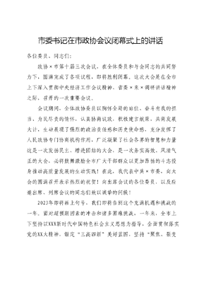 市委书记在市政协会议闭幕式上的讲话各位委员、同志们:政协×市第十届三次会议,在全体委员和与会同志的共同努力下,圆满完成了各项议程,即将胜利闭幕。这次大会是在全市上下深入贯彻中央经济工作会议精神、省委×来×调研讲话精神之际,召开的一次重要会议。会议期间,全体政协委员以胸怀全局的站位、奋斗有我的担当、为民尽责的情怀,认真协商议政,积极建言献策,共商发展大计,生动展现了强烈的政治责任感和历史使命感,充分发挥了人民政协专门协商机构作用,广泛凝聚了社会各界的智慧和力量这是一次发扬民主、增进团结的大会,是一次务实高效、风清气正的大会,必将鼓舞激励全市广大干部群众以更加昂扬的斗志投身推动高质量发展的生动实践!在此,我代表中共×市委,向大会的圆满召开表示热烈的祝贺!向出席会议的各位委员,以及应邀出席、列席会议的同志们致以诚挚的问候!2023年即将画上句号,我们即将告别这个充满机遇和挑战的一年。面对超预期因素的冲击和诸多困难挑战,一年来,全市上下坚持以XXX新时代中国特色社会主义思想为指导,全面贯彻落实党的XX大精神,锚定三高四新美好蓝图,坚持聚焦、裂变创新、升级、品牌工作思路,应对了一系列急事难事,办成了一系列好事实事,交出了一份振奋人心的×答卷。这些成绩的取得,得益于在市委领导下全市广大干部群众的团结拼搏,也凝聚着市政协和广大政协委员的智慧和汗水。在此,我代表中共×市委,向全市各级政协组织、广大政协委员和政协工作者,向各民主党派市委会、市工商联、无党派人士、人民团体和社会各界人士,致以崇高的敬意和衷心的感谢!2024年是新中国和人民政协成立75周年,也是实施十四五规划承上启下关键之年。前不久召开的中央经济工作会议深刻分析当前经济形势,系统部署明年经济工作,为我们做好明年经济工作,更好推动×高质量发展理清了思路、指明了方向。希望全市各级政协组织和广大政协委员坚定不移贯彻落实中央和省委、市委各项决策部署,倾政协之力、尽政协之责、立政协之功携手提升×高质量发展核心竞争力,合力推动七个有新作为落实落地,奋力谱写高质量发展新篇章!一、展现新作为、谱写新篇章,必须筑牢政治之魂,在传承历史中保持政治定力人民政协在协商建国中应运而生,75年来,在新中国的建立建设和改革发展的进程中,发挥着不可替代的重要作用。历史和实践证明,人民政协是中国政治制度上的伟大创造,是实现国家富强、民族振兴、人民幸福的重要力量。一年来,全市各级政协始终与党委政府站在一起、想在一起、干在一起,服务大局积极有为,建言资政精准有方,协商为民务实有力,切实把人民政协制度优势转化为治理效能,为全市经济社会发展作出了重要贡献特别是广大政协委员充分发挥在政协工作中的主体作用、在界别群众中的代表作用、在本职工作中的带头作用,以实际行动交出了服务大局、服务发展、服务人民的委员答卷。历史映照现实、更远观未来,面对新任务新挑战,希望全市各级政协组织和广大政协委员继承和发扬人民政协优良传统,深刻领悟两个确立的决定性意义,创造性推动国之大者省之大计与市之大事同向聚合,聚焦制造名城、幸福×目标,将市委的决策部署落实到政协工作的全过程各方面。二、展现新作为、谱写新篇章,必须服务中心大局,在高质量发展中增强协商效力要持续发挥自身优势,在参政议政上和时代共脉搏、与大局相辉映、同人民共命运,凝聚起团结奋进的智慧和力量。一要把坚持高质量发展作为新时代的硬道理。发展是解决中国所有问题的关键,国家统计局发布的前11个月数据显示,全年发展主要预期目标有望较好完成,中国经济对全球经济增长的贡献将达到三分之一,仍是全球增长最大引擎。中央经济工作会议再次指路引航,明确指出,必须把坚持高质量发展作为新时代的硬道理。这一论断与发展是硬道理一脉相承,深化了新时代做好经济工作的规律性认识。市委这几年引导广大干部树牢正确政绩观,实现价值观理性回归,动真碰硬、攻坚克难,推动高质量发展取得了新成效。今年的政府工作报告,提出了明年工作的主要经济指标和重点攻坚方向,既需要我们跳起来摘桃子,推动量的合理增长,更要关注质的有效提升,在提升政府税收、企业利润、居民收入上下功夫,在提升发展含金量、含新量、含绿量上求突破,以量质齐升唱响中国经济光明论、×发展光明论。二要在落实七个有新作为上勇于担当。今年12月18日,省委×到×调研提出了七个有新作为的指示要求。这是省委对×在全省发展中作出更大贡献的殷切期许,也是我们当前和今后一段时间推动工作的努力方向。我们要以实际行动将省委各项要求落到实处。希望大家主动担当作为,共同抓好落实。积极服务产业发展,紧扣3+3+2现代化产业体系建设升级和13条产业链强链补链延链,深入开展课题研究,以高质量调研成果为市委决策提供有益参考。挖掘区域潜能,真正做到近水楼台先得月