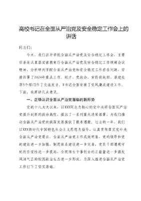 高校书记在全面从严治党及安全稳定工作会上的讲话同志们:今天,我们召开学院全面从严治党及安全稳定工作会,主要任务是认真落实省教育厅全面从严治党及安全稳定工作视频会议精神,分析研判学院全面从严治党和安全稳定工作存在问题,安排部署了2024年重点工作。刚才,党政办、宣传统战部、基建处等5个部门作了交流发言。X书记全面安排了党风廉政建设工作。下面,我再讲几点意见。一、正确认识全面从严治党面临的新形势党的十八大大以来,以XXX同志为核心的党中央将全面从严治党提升到新的政治高度,提出了一系列重大决策部署,为我们推动全面从严治党向纵深发展提供了根本遵循。过去的一年,我们以XXX新时代中国特色社会主义思想为指导,认真贯彻落实党中央全面从严治党要求,全面从严治党工作成效明显,党的领导和党的建设进一步加强,制度体系建设进一步完善,党员干部遵规守纪的自觉性进一步提高,全院师生干事创业的正能量进一步激发风清气正的校园政治生态进一步形成,为深入推进全面从严治党工作打下了坚实基础。但要清醒的认识到,与中央全面从严治党的新要求相比,与新时代职业教育高质量发展的新使命相比,与广大教职工对事业发展的新期盼相比,还存在不少问题和差距:比如管党治党责任传导不够到位,党建工作推进不平衡,对重点领域、关键环节的风险管控力度不够,这都表明全面从严治党面临的形势依然严峻复杂。XXXXXX强调,党和人民事业发展到什么阶段,全面从严治党就要推进到什么阶段。2023年是学院双高建设收官年,学院管理能力提升年,各项工作任务繁重、要求更高。越是形势严峻复杂,越是任务艰巨繁重,越需要我们抓实管党治党,以全面从严治党为统领,保持战略定力、树立必胜信念,全面激发党员干部奋勇当先、干事创业的精气神,以永远在路上的执着把全面从严治党引向深入,为推进学院事业高质量发展保驾护航。二、扎实推动全面从严治党向纵深发展全面从严治党是新时代党的建设的主要特色和要求,主要体现在思想从严、管党从严、执纪从严、治吏从严、作风从严以及反腐从严六个方面。(一)抓思想从严。当前,学院部分领导干部对党的创新理论学习不深不透,对职业教育的最新政策缺乏系统研究、一知半解,思想跟不上新时代职业教育和学院快速发展的新形势新要求对学院发展前景认识不清,看问题过于局限、过于片面,谋划工作思路不明晰、视野不开阔,制约学院事业的发展。我们要始终将深入学习贯彻XXX新时代中国特色社会主义思想作为重要政治任务和长期战略任务牢牢抓紧,通过三级理论学习、干部培训、专题会、党课、专家报告、学术研讨等方式,坚持深入学、系统学联系实际学,切实学懂、弄通、做实,不断提高解决问题的水平和能力。(二)抓管党从严。有的党员干部和部门缺乏政治意识、大局意识,对党委的决策部署执行不坚决,对党委批示的文件不是想着怎么做好,而是想着怎么推卸,尤其是遇到交叉的工作,更是想着一推了之;有的基层党组织党内政治不规范,民主生活会组织生活会、三会一课等质量不高;党建引领作用发挥不够充分,仍然存在两张皮现象。我们要全面坚持和加强党的领导,党员干部要牢固树立政治意识、大局意识,不折不扣执行党中央和上级党委、院党委决策部署。严格执行《关于新形势下党内政治生活的若干准则》,严肃党内政治生活,不断增强党内政治生活的政治性、时代性、原则性、战斗性。全面激发基层党组织活力,重点加强功能性党支部建设,将党支部建在专业群上、建在重大项目,让党建赋能发展。(三)抓执纪从严。党的XX大报告指出,全面加强党的纪律建设,对违反党纪的问题,发现一起坚决查处一起。当前,学院有的基层党组织对党员干部的政治纪律和政治规矩教育抓得不够到位,有的党员干部对政治纪律内涵认识不清、把握不准,对党的政治纪律和政治规矩缺乏敬畏之心,当面一套背后一套,嘴上一套行动一套;执行纪律规矩严不实,不同程度地存在七个有之的情况,比如匿名诬告、制造谣言。我们要严格遵守党章党规、党的纪律、国家法律,牢记五个必须、防止七个有之。必须如实向党组织反映和报告情况,严格执行重大问题请示报告制度,坚决反对搞两面派、做两面人,坚决反对虚报浮夸、报喜不报忧,坚决反对搞小圈子。教育教学活动中,不得出现违背党和国家大政方针、违反宪法法律、危害国家主权安全、破坏民族团结的行为。坚持纪律面前一律平等,对违反政治纪律和政治规矩的行为要坚决查处,用铁的纪律从严治党使各项纪律规矩真正成为带电的高压线。(四)抓治吏从严。当前,我院干部队伍基数庞大,正科级干部超编100多名,在市上没有备案,存在很大隐患。干部成长路线不清晰,没有形成梯队。干部综合素质不均衡,有的干部有学历缺能力,有的干部能力缺学历,专家型干部缺乏。我们要坚持正确的选人用人导向,从事业发展出发,把敢不敢抓落实、善不善于抓落实作为评价干部的重要标准,大胆使用那些