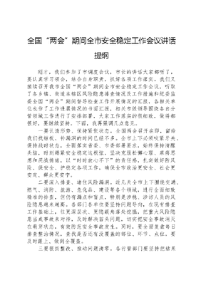 全国两会期间全市安全稳定工作会议讲话提纲刚才,我们参加了市调度会议,市长的讲话大家都听了,要认真学习领会,结合自身职责,抓好各项工作落实。我们又接续召开我市全国两会期间全市安全稳定工作会议,听取了各乡镇、街道本辖区风险隐患排查情况及工作措施和纪委监委全国两会期间督导检查工作开展情况的汇报,各相关单位也作了工作进展情况的书面汇报,相关市级领导围绕各自分管领域工作进行了安排部署,大家工作落实的很细致,做得都很好,要继续坚持。下面,我再强调几点意见。一要认清形势、保持紧张状态。全国两会召开在即,留给我们找短板、补漏洞的时间已经不多。全市上下必须咬紧牙关、保持战时状态,全面落实省委、市委部署要求,始终保持清醒头脑,时刻绷紧安全稳定这根弦,坚决克服松懈心理、麻痹思想和厌战情绪,以时时放心不下的责任感,扎实做好防风险、保安全、护稳定各项工作,确保全市政治更安全、社会更安定、群众更安宁。二要深入排查、堵住风险漏洞。近几天全市上下围绕交通、燃气、消防、旅游、危化品、建设等各个领域,进行全面细致精准的排查,但仍有漏点和盲点,特别是涉稳、涉访人员的风险隐患越来越高。各部门各单位要坚持问题导向,在现有排查工作基础上,往更深层次、更隐蔽角落处挖掘,把重大风险隐患当成事故来对待,及时解决苗头问题,切实把安全事故消灭在萌芽状态,有效防范安全事故发生。同时,要全面复盘每日排查整治情况,查找是否还有没覆盖的部位、环节、点位,要及时跟上、做到全覆盖。三要狠抓整改、推动问题清零。各行管部门要坚持把结果导向贯穿问题整改全过程,重点关注未解决难题,整改有难度的要及时向分管领导沟通,解决不了的要向我和市长汇报,大家合力攻坚整改,加快消除风险隐患。同时,要通过找准定位、分析机理、制定举措、复盘验证、整章流程五步法,解决共性问题,建立长效机制,达到排查整改一处隐患、消除一批同类型隐患的目的,坚决避免出现同类风险隐患反复排查、反复整改、反复出现的问题。四要严实纪律、强化值班值守。去年全国两会期间,我市多次因为值班值守出现问题被上级通报。昨天,各乡镇街道全国两会期间值班表已经汇总上报到X市了,大家不要心存侥幸,要严格按照值班安排,认真落实三级值班带班、两级值班带班和值班员在岗值班等值班带班分类要求,遵守工作纪律,坚决不允许出现空岗漏岗现象。同时,要强化信息报告工作,严格执行重大事项请示报告和日报告零报告制度,遇有重要紧急情况,特别是涉及安全生产、信访稳定等情况要第一时间报告,并及时采取应对处置措施,坚决杜绝迟报、漏报、谎报、瞒报。这里需要特别强调的是,值班电话不允许设置呼叫转移,一经发现,视为脱岗。五要高效统筹、抓实经济发展。当前,正处于冲刺开门红的关键时期,发改、工信等经济部门要高度重视,在抓好安全稳定工作的同时,坚决扛起经济发展责任,围绕全市经济发展大局,主动担当、积极作为,统筹抓好项目建设、工业运行、消费促进、备春耕生产等各项工作,特别是要加紧协调、靶向推进一号项目,将资源、资金、政策向一号项目倾斜,在要素保障方面给予全力支持,在坚守社会大局和谐稳定底线基础上,奋力夺取一季度开门红。六要强化督检、严实工作作风。各位市级领导要按照新调整的包保责任和工作分工,深入包保属地、分管行业领域,对安全责任落实、风险隐患排查、值班值守等情况认真开展督导检查,及时发现问题、解决问题。监督检查工作专班要对各部门各单位值班值守情况进行抽查检查,对于带班值班期间擅离职守以及迟报、漏报、瞒报重要情况信息和出现其他履职不力等情形的干部,要视情形予以处理,造成不良影响或导致重大事故发生的一律从重处理。总之,特殊时段及节点,安全稳定工作任务重、压力大,不容丝毫侥幸和懈怠,必须打起精气神、压实责任、夯实举措,以高度的责任感和紧迫感,从严从实、从紧从细抓好每项任务落实,确保两会期间持续安全稳定,实现安全与发展两手抓、两手硬、两手赢。