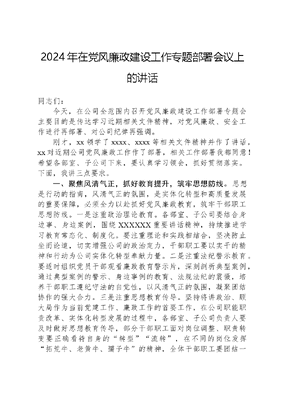 2024年在党风廉政建设工作专题部署会议上的讲话同志们:今天,在公司全范围内召开党风廉政建设工作部署专题会主要目的是传达学习近期相关文件精神,对党风廉政、安全工作进行再部署、对公司纪律再强调。刚才,xx领学了xxxx、xxxx等相关文件精神并作了讲话,xx对近期公司党风廉政工作作了部署,相关工作部署我都同意!希望各部室、子公司下来,要认真学习领会,抓好贯彻落实。下面,我讲三点要求。一、聚焦风清气正,抓好教育提升,筑牢思想防线。思想是行动的指南,风清气正的氛围,是实体化转型和高质量发展的重要保障,必须全力以赴抓好党风廉政教育,筑牢干部职工思想防线。一是注重政治理论教育。各部室、子公司要结合身边事、身边案例,围绕XXXXXX重要讲话精神,持续推进学习教育常态化、制度化。要注重理论和实践相结合,坚决防止坐而论道,切实增强公司的政治定力,干部职工要以实干的精神和行动为公司实体化转型奉献力量。二是注重法纪警示教育。要适时组织党员干部观看廉政教育警示片,深刻剖析典型案例,通过典型案例的警示、身边事例的教育、法规法纪的震慑,培养干部职工遵纪守法的自觉性,以风清气正的氛围,凝聚团结协作的强大合力。三是注重思想教育传导。坚持将讲政治、顾大局作为当前党建工作、廉政工作的首要工作,在公司职能职责改革、实体化转型发展的过程中,各部室、子公司负责人要及时做好思想教育传导,部分干部职工面对岗位调整、职责转变要正确看待自身的转型流转,在不同的岗位发挥拓荒牛、老黄牛、孺子牛的精神,全体干部职工要团结一致,为公司发展添砖加瓦。二、聚焦公道正派,抓好监管管理,推动遵规守纪。坚持把纪律规矩挺在前面,严格落实国纪党规、公司各项规章制度。一是强化内控管理。各部室、子公司要严格落实考勤、请假、会议、财务管理等各类日常管理制度,要定期分析研判队伍建设,要对发现的问题,及时批评教育,坚持讲政治、顾大局是第一原则,让做老好人、好人主义的思想推出历史舞台,让守纪律、讲规矩成为干部职工的自觉行为。二是强化执纪前移。要及时建立健全提醒谈话、任前谈话、诫勉谈话、党风廉政建设责任制约谈等制度,对苗头性、倾向性问题及时咬耳扯袖,提出告诫、提醒和引导,尽量把问题解决在萌芽状态,防止小错铸大错。三是强化监督检查。各部室、子公司要严格落实各项监督制度,完善监督检查工作机制,强化执行党纪党规的日常监督,把党委、董事会交办的任务,作为第一项政治任务,对党委、动董事会安排部署的工作不留余力的落实、执行,不搞变通、不打折扣。三、聚焦高度履职,抓好工作落实,深化作风建设。2024年,各部室、子公司负责人要以高度履职的态度,深化作风建设,抓好工作落实。一是勇于担责,高度负责。各部室、子公司要真正把党风廉政建设当作分内之事、应尽之责,常研究、常部署。各部室、子公司要严格落实、履行一岗双责,负责人要履行好第一责任人职责,既要抓好工作,又要带好队伍,既要担责任又要承担相应权责以及管理、运营,主动协调解决重大问题,适时督查督办重点工作。二是层层压责,履责尽责。大力推行和落实党风廉政建设责任清单制度,强化经常性监督检查,将党风廉政建设的责任压力延伸到每一个部室、子公司、落实到每一个部室、子公司、传递到每一名党员干部。公司干部职工要克服困难,释放正面能量,工作上做到履职尽责。三是从严问责,追究问责。各部室、子公司要坚持在上级xx带领下、公司党委的领导下和xxx指导下,加大执纪监督问责力度,严肃查处在构建亲清企商关系,持续保持惩贪治腐的高压态势,为公司管理和实体化转型发展营造风清气正的政治生态。