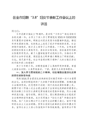 在全市妇联3.8妇女节表彰工作会议上的讲话同志们:今年是新中国成立75周年,是实现十四五规划目标任务的关键一年,全市上下深入学习贯彻党的XXX和XXXXXX系列重要讲话精神,积极应对经济发展中的困难和挑战,增创科学发展新优势,在新起点上实现了经济平稳较快发展、社会持续和谐稳定。刚才王主席作了工作报告,一年来,全市各级妇联组织服务大局有作为、服务妇女有实效、服务基层有创新、女性教育有亮点,做了大量细致富有成效的工作,为推动全市经济社会科学发展、建设蓝色文明幸福之都做出了积极贡献。在此,我代表市委,向全市各级妇联干部和广大妇女致以亲切的问候和衷心的感谢!关于今年的工作,妇联党组做了认真的研究和部署。希望大家结合实际,认真贯彻落实。下面,我提几点希望和要求。一、深入学习贯彻党的二十精神,切实增强全面深化改革的责任感和使命感党的XXX是全面深化改革的攻坚时期召开的一次十分重要的会议,各级妇联组织和广大妇联干部要深刻理解、准确把握全会精神实质,把思想和行动统一到中央的决策和部署上来,按照市委十四届二次全会提出的关于全面深化改革的部署要求,联系妇联工作实际认真研究贯彻落实的思路和举措,用全会精神武装头脑、指导实践、推动工作。要以高度的政治自觉抓好全会精神的宣传教育,充分运用城乡妇女之家和舆论宣传阵地,在广大妇女群众中大力宣传全会的重大意义,宣传中国特色社会主义法治道路,宣传全面深化改革的总目标和重点任务,宣传社会主义核心价值观和中华传统美德,宣传男女平等基本国策和保障妇女儿童权益的相关法律法规,把广大妇女的智慧和力量凝聚到支持、参与、投身全面推进依法治市的实践中来,为加快法治建设筑牢群众基础。二、大力弘扬社会主义核心价值观,以家庭为主阵地夯实妇女思想道德基础法律的权威源自人们的内心拥护和真诚信仰,再好的法律如果没有具备应有素质的人去执行,仍将是一纸空文。因此,引导广大妇女培育和践行社会主义核心价值观,涵养道德底蕴、倡扬良好风尚是深化改革的前提和基础。多年来,市妇联坚持把家庭作为开展妇女思想道德建设的主阵地,不断创新教育载体、丰富时代内涵,实现了春风化雨、以文化人的良好社会效果。特别是今年提出的女性三花精神、推广传唱新女性文明三字经以及寻找最美家庭等活动,不仅赋予了现代女性新的精神高地,更为女性树立了可学可行的时代标杆。当前和今后一个时期,要着重处理好继承和创新发展的关系,统筹利用好妇联组织的阵地、载体和品牌资源优势,以女性三花精神为引领,以新女性文明三字经传播为载体,以家庭为主阵地,把社会主义核心价值观的要求融入各类精神文明创建活动,落实落细落小于家庭和社会生活之中,使核心价值观的影响无处不在、无时不有。要着眼于创新家庭文化内涵、打造家字系列载体、解决家庭领域问题,汲取中华优秀传统文化的思想精华和道德精髓,创新发展和谐家庭创建活动和巾帼志愿服务活动,进一步弘扬家庭美德、培树良好家风,以好家风支撑起好的民风、社风。三、大力提升广大妇女法治素养,推动改革发展成果更多更公平地惠及妇女群众全民普法和守法是全面推进依法治市的长期基础性工作。各级妇联组织要充分发挥优势,坚持以普法教育为重点,大力提升妇女法治素养,为妇女平等依法行使民主权利、平等参与经济社会发展、平等享有改革发展成果提供强有力保障。要加强法治宣传教育,努力适应由经济体制变革、社会结构变动和利益结构调整带来的妇女群众思想观念的深刻变化和多元需求,积极推动普法宣传思路、载体和方式创新,加强男女平等基本国策和相关法律法规的宣传普及,引导广大妇女做社会主义法治的忠实崇尚者、自觉遵守者、坚定捍卫者。要加强法律服务和援助,健全完善妇女维权网络,推动维权重心下移、关口前移,加强基层妇女维权服务阵地建设,探索妇女维权网格化覆盖,使妇女群众从身边就能找到解决问题、维护权益的渠道。要关注弱势妇女儿童群体对健康、生产、生活等层面的基本需求,多做细致入微的人文关怀工作,理顺情绪、化解矛盾,特别要重视加强对农村妇女群体的反邪教警示教育工作,深化家庭拒绝邪教和防邪知识进家庭等活动,增强妇女防范抵御邪教侵蚀的意识和能力,维护社会大局和谐稳定。四、进一步巩固主题教育实践活动成果,切实提高妇联组织改进作风、依法履职的能力和水平推进依法治市,对妇联组织和妇联干部队伍建设提出了新的更高要求。各级妇联干部和执委在引领妇女参与依法治市、推动妇女工作沿着法治轨道健康发展中肩负着重要使命。要积极学习法律、研究法律,善于运用法治思维和法治方式做好新形势下妇女群众工作,把社会主义法治理念和法治精神融入妇联工作的各领域和全过程。要巩固和扩大主题教育实践活动成果,坚持把融入中心、服务大局作为妇联组织发挥作用的根本遵循,把联系和服务广大妇女作为妇联工作生命线,常态化开展下基层、访妇情、办实事活动,