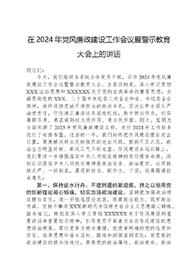 在2024年党风廉政建设工作会议暨警示教育大会上的讲话同志们:今天,我们组织本系统全体党员干部,召开2024年党风廉政建设工作会议暨警示教育大会,主要目的是,深入学习贯彻XXX法治思想和XXXXXX关于党的自我革命的重要思想,全面贯彻党的XXX、二十届中央纪委三次全会和省、市纪委全会精神,始终保持忠诚干净担当的政治本色,坚决扛牢全面从严治党责任,守住清正廉洁这条底线红线,敢于担当作为,切实履职尽责,真正做到权为民所用、责为民所担。刚才,X同志全面回顾了2023年党风廉政建设工作,并对2024年工作任务进行了安排布置。过去的一年,我们始终把作风建设摆在突出位置,聚焦解决群众反映强烈的突出问题,狠刹不正之风,政治生态明显好转、新风正气不断充盈。作风建设永远在路上,我们要进一步增强落实中央八项规定精神的责任感使命感,深刻认识落实中央八项规定精神是政治任务、政治要求,必须持续从严、一抓到底,展现新担当、新作为。下面,我再强调四点意见:第一,保持逆水行舟、不进则退的紧迫感,持之以恒用党的创新理论凝心铸魂,切实加强政治建设。坚持把加强政治建设摆在首位,进一步强化理论武装、提高政治能力、筑牢政治忠诚。坚持不懈用XXX新时代中国特色社会主义思想凝心铸魂、固本培元,特别是深入学习贯彻XXXXXX关于作风建设的重要讲话和重要指示精神,引导党员干部着力夯实作风建设的思想政治根基。要以党章为根本遵循,把党章明确的党的性质和宗旨、指导思想和奋斗目标、路线和纲领落到实处;突显党的政治建设的根本性地位,聚焦党的政治属性、政治使命、政治目标、政治追求持续发力;把政治标准和政治要求贯穿党的思想建设、组织建设、作风建设、纪律建设以及制度建设、反腐败斗争始终,以政治上的加强推动全面从严治党向纵深发展,引领带动党的建设质量全面提高;坚持问题导向,注重靶向治疗,针对政治意识不强、政治立场不稳、政治能力不足、政治行为不端等突出问题强弱项、补短板;把党的政治建设融入党和国家重大决策部署的制定和落实全过程,做到党的政治建设与各项工作特别是中心工作紧密结合、相互促进。第二,保持如履薄冰、如临深渊敬畏感,持之以恒落实全面从严治党主体责任,切实做到守土有责、守土尽责。党组坚决担起全面从严治党的主体责任,一把手充分发挥第一责任人职责,各分管领导和支部书记切实履行好一岗双责责任,努力形成齐抓共管的强大合力。要强化纪律教育,以学习贯彻新修订的《中国共产党纪律处分条例》为契机,开展集中性纪律教育,推动党内法规学习常态化制度化,把纪法教育、警示教育、廉洁教育衔接起来,引导党员干部知敬畏、存戒惧、守底线。强化日常监督,坚持从严要求、从严管理,注重发挥党支部、党小组管到人头优势,对苗头性、倾向性问题,及时批评教育,当好婆婆嘴、念好监督经,真正把作风建设融入日常、抓在经常。强化标本兼治,对享乐主义、奢靡之风露头就打、反复敲打,对形式主义、官僚主义抓节点、强监督、促整改,健全风腐同查同治工作机制,既由风查腐,又由腐纠风。坚持系统施治,加强新时代廉洁文化建设,注重家庭家教家风,坚决铲除作风问题滋生土壤,一体推进不敢腐、不能腐、不想腐。强化制度建设,深入研判重点岗位、关键环节,查找制度漏洞和风险隐患,对易发高发问题找准根源、建章立制。第三,保持淡泊名利、宁静致远的平常心,持之以恒深化正风肃纪反腐,以永远在路上的执着锤炼过硬作风。作风建设是推动经济社会发展和保障民生及促进社会安定祥和的重要一环,对作风问题任何时候都不能掉以轻心。要常态长效纠四风、树新风,狠抓违反中央八项规定精神监督检查、开展党规党纪集中学习教育。要坚持在抓常上下功夫。各部门单位主要负责人要带头抓,深入研究本领域、本单位干部队伍现状,分析解决作风突出问题;重要工作亲自部署、重大事项亲自推动、重点环节亲自协调、落实情况亲自督查,确保工作在一线推进、情况在一线掌握、问题在一线解决。落实好提醒谈话制度,继续强化日常监督,持续加强对干警日常工作纪律和八小时外生活纪律的监督检查,一体推进三不腐,从严加强纪律教育和纪律执行。坚持在抓细上下功夫,从细处研究、往细处谋划、在细处落实,以高度的政治责任感和精细的事业心,把路线图变成施工图,把时间表变成计程表,一个环节一个环节抓,一个步骤一个步骤推,一个问题一个问题解决,确保每一项工作任务完成得有结果、有成色、有质量。坚持在抓长上下功夫,始终保持严格的尺度和坚定的决心,牢记红线不可逾越、底线不可触碰,弄清楚党的纪律界限在哪里,搞明白哪些事能做、哪些事不能做,时刻自重自省、慎独慎微,加强个人修养,注重小事细节,强化自我约束,认真学习党纪国法,严格遵守党纪国法。第四,保持防微杜渐、落细落小的审慎心,持之以恒把权力关进制度的笼子,加强对依法用权的制约监督。新时代新征程,面