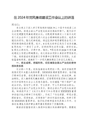 在2024年党风廉政建设工作会议上的讲话同志们:在全党上下深入学习贯彻党的XXX和二十届中央纪委三次全会精神,推进全面从严治党向纵深发展的形势下,我们召开这次党建暨党风廉政建设会议,这既是贯彻落实二十届中央纪委三次全会和十三届省纪委六次全会精神的政治要求,也是加强党的领导,强化纪律规矩,保证区保护利用管理局各项工作顺利推进的现实需要。刚才,4名党支部书记进行了述责述廉,X同志也一一进行了点评,述责的同志述得全面、讲得实在,X同志点得到位、评得中肯。稍后,*同志将对2024年党风廉政建设工作提出明确要求,请大家结合实际认真抓好贯彻落实。下面,我根据省纪委监委工作部署和区管理局工作实际,从派驻监督的角度,就做好下一步党风廉政建设工作谈几点意见。一、肯定成绩,把握形势,切实增强全面从严治党的使命感和责任感过去的一年里,纪检监察组与局党组一同,始终坚持把贯彻落实党中央重大决策部署、XXXXXX最新重要讲话、指示批示精神及省委、省纪委有关要求作为政治责任、政治纪律、政治规矩,深入推进党风廉政建设。区管理局党组坚持以XXX新时代中国特色社会主义思想为指导,切实增强两个维护的政治自觉,强化守土有责、守土担责、守土尽责的政治担当,坚决扛起全面从严治党主体责任,推动全面从严治党向纵深发展,特别是印发了《关于认真学习和办理落实XXXXXX重要讲话指示批示精神工作规程》,形成了传达部署、研究办理、跟踪督办、现场核查、反馈报告的闭环落实机制,把学习贯彻XXXXXX重要讲话、指示批示精神落实到具体工作中,为推动X湖生态保护事业高质量发展提供了坚强保障。随着派驻监督的深入推进和长期以来的调研督导,提醒我们要精准把握、清醒认识全局系统党风廉政建设方面存在的问题。具体表现在:一是学思践悟不够,管党治党压力传导不到位,存在棚架问题。一些基层党组织没有搞清楚在党风廉政建设中该负什么责任,怎样承担责任,满足于开开会、传达传达精神,以文件传达文件、以会议落实会议等一般性的部署要求,缺乏针对性的有效措施。不少同志抓业务有一手,抓廉政建设手短、手软,劲头不足、力度不够。二是在担当尽责上,有的党员干部对工作标准要求不高,只求过得去,不求过得硬;有的领导干部大局意识不强,科学谋划和整体推动不够;有的说得多、干得少,嘴上喊着要担当尽责,实则担当作为不够;有的碰到问题绕道走,遇到矛盾就上交,缺乏攻坚克难的毅力和勇气。大家都知道,2023年省委巡视组对局系统进行了巡视,反馈了4个方面49个问题,去年底省委第三巡视组对局系统开展了巡视回头看,又给局系统反馈了4个方面14个问题,必须引起工作警思!同时,各种信访举报数量不减,从另一方面也说明我们系统党风廉政建设还存在差距、短板,这就要求我们不能讲条件、讲困难、讲客观,必须坚持问题导向,努力担当作为,坚决把问题整改到位,坚定不移把全面从严治党向纵深推进。 二、突出重点,明确任务,推进全面从严治党向纵深发展一要切实强化政治监督。XXXXXX在加强政治监督中着重强调了完整准确全面贯彻新发展理念的问题,特别指出有的领导干部贯彻党中央决策部署不自觉、不坚定,贯彻落实停留在口头上,没批示就不动、不作为,或者不顾实际盲动、乱作为,缺乏攻坚克难的硬招、新招、实招,造成新的政治风险、经济风险、社会风险。十三届省纪委六次全会指出要聚焦两个维护强化政治监督,确保XXXXXX重要讲话指示批示和党中央决策部署在X落地见效。结合省委、省纪委监委部署安排,紧紧围绕XXXXXX重要指示批示和党中央决策部署、六中全会精神贯彻落实、全面从严治党、六稳六保和统筹疫情防控,加强政治监督;紧扣进入新发展阶段、贯彻新发展理念、构建新发展格局、推动高质量发展等重大战略,紧扣碳达峰碳中和、加快推进四地建设和一优两高等重点任务,加强政治监督;紧盯省委巡视反馈问题整改、深入推进木里矿区以及祁连山南麓X片区生态环境综合整治和生态文明建设,紧盯铸牢中华民族共同体意识,维护民族团结进步,紧盯人大代表选举和严明换届纪律风气,严把政治关、廉洁关等重大责任加强政治监督,切实把监督驻在单位党委(党组)政治上的主动,作为扛起政治责任的具体抓手。今年,我们将进一步用准用好纪检监察建议。对监督中发现全面从严治党责任落实不力,巡视巡察整改不到位,选人用人风气不正,拒不执行或违反法律法规,给国家、集体利益和公民合法权益造成损害等突出问题,经组务会研究后,对厅(局)内设机构和直属单位存在的突出问题直接下发纪检监察建议书。同时,跟进纪检监察建议落实情况,对监督单位整改情况进行跟踪监督,防止建议一发了之,帮助监督单位制定扎实有效的整改方案,明确整改时限和效果,做到发现一个问题解决一个问题,确保纪检监察建议落地有声。 二要确保主体责任落实到位。全面从严治党主体责