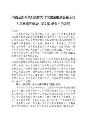 市直公路系统加强能力作风建设推进会暨2023年春季党员集中轮训动员会上的讲话同志们:人勤春来早,风正好扬帆。今天,我们召开市直公路系统加强能力作风建设推进会暨2023年春季党员干部轮训动员会,主要目的是:深入学习贯彻落实党的XXX精神和XXXXXX系列重要讲话重要指示批示精神,明确目标、聚焦重点、紧盯问题、克难奋进,全面掀起市直公路系统能力作风建设热潮,推动形成比学赶超、大抓落实、争先进位浓厚氛围,引导督促广大党员干部全力以赴干事业、一往无前促跨越,奋力开创xx公路事业高质量发展新局面。本次轮训活动我们有幸邀请到经验丰富的市委党校xx教授,稍后她会围绕学习贯彻党的XXX精神,为全体党员干部作专题辅导。同时,中心党组根据工作实际结合干部作风建设实情,安排各业务科室骨干们分头上阵开展专题培训,授课内容包含年度工作目标分析、最新规划纲要解读、养护管理、党风廉政、基层党建工作等方面,覆盖面广、贴近实际,希望大家把握这次学习机会,努力提高自身综合水平。就本次党员干部轮训活动,我讲三个问题:第一个问题是,为什么要开展本次轮训活动学习是一个常说常新的话题,大大小小的会议上我强调过很多次,岗位变换需要学习,形势变化也需要学习,在一个岗位工作时间长了也需要学习,特别是我们公路部门是个业务单位,更应该加强理论和专业学习,做专业的人办专业的事。因此,本次春季党员干部集训活动,是政治任务,更是本领要求。开展轮训活动,是落实全面从严治党的重要抓手。开展春季党员干部轮训,是深入学习贯彻党的XXX精神的具体体现,对于进一步加强党员教育、不断提高广大党员的思想政治素质,增强基层党组织的凝聚力和战斗力具有十分重要的意义。全体党员要通过这次教育培训,进一步树立宗旨意识,强化纪律观念,充分发挥好党员的先锋模范作用,在增强党性上见成效、在改进作风上见成效、在提高能力上见成效,不断推进党的全面领导和从严治党走深走实,为公路高质量发展提供坚强保障。开展轮训活动,是加强能力作风建设具体举措。新年伊始市委发出了加强能力作风建设的号召,动员全市党员干部以能力作风大提升推动xx各项事业大发展,我们积极响应迅速召开了动员部署会。开展本次市直公路系统党员干部集训活动,是加强能力作风建设的举措之一,是落实市委市政府工作要求的具体表现,是推动交通强市成势见效的重要抓手,通过此次培训活动,促干部队伍业务素质和精神风貌提升,为公路事业发展营造风清气正、真抓实干的良好发展环境。开展轮训活动,是推动公路事业高质量发展的现实需要。昨天,我们召开了全市公路工作会议,总结了成绩,分析了当前发展形势,明确了今年工作目标与思路,通过开展本次轮训活动,让党员干部经历一次思想的大洗礼、观念的大更新、状态的大重塑,动员引导广大党员干部面对新形势、新任务、新要求,以思想破冰的魄力、赶超一流的追求、加速进位的姿态,就是从思想上重新思考定位,找准抓落实的方法路径,对今年工作进行谋划和打算,努力交出一份优异成绩单。第二个问题是,本次轮训要重点解决哪些问题在工作千头万绪、任务十分繁忙的情况下,我们依然抽出两天时间开展这次春训,这充分说明了中心党组对本次轮训工作的高度重视,目的就是下功夫整治麻木僵化不思为、懒散疲沓不勤为、能力平庸不善为、粗枝大叶不细为、拈轻怕重不想为等突出问题。通过开展集中轮训活动,进一步提升能力作风建设,促进各项工作任务落实。一是提升旗帜鲜明的讲政治能力。这次培训,我们邀请到了市委宣讲团xx教授就深入学习贯彻党的XXX精神为大家授课,这是当前和今后一个时期全党政治生活中的首要任务,全体党员干部要把本次学习培训作为政治熔铸、政治锻造,铸牢对党绝对忠诚的政治品格,切实把忠诚拥护两个确立转化为坚决做到两个维护的思想自觉、政治自觉和行动自觉,成为一支政治上绝对忠诚、作风上绝对过硬,行动上勇于担当的队伍,确保上级决策部署在市直公路系统条条落实、件件落地、事事见效。二是提升细致高效的抓落实能力。理论学习只有与实际相结合,才能焕发出强大的生命力。本次轮训我们课程丰富,办公室、养护科、工程科、监察室等轮番上阵开展培训,就是为了有针对性开展专业训练,将学习软实力转化为工作硬本领。我们各单位、各科室及每个人要紧紧围绕中心工作任务,结合各自实际,找准结合点和切入点,做好全年工作计划。按照工作安排,今年各科室及个人要签订2023年度目标责任书制定目标责任只是开端,关键在落实。本次集中轮训活动,就是动员大家立即开展行动,把该挑的担子挑起来,把该扛的责任扛起来,把该抓的事情抓起来,养成马上落实的习惯和问题清零的作风,真正做到不见进展不松劲、不出成果不放手、不达目的不罢休。三是提升团结清廉的干事创业能力。前期,我们组织开展了能力作风建设问题大排查,直属各单位、机关各科室认真查摆了在政治标准、履职尽责