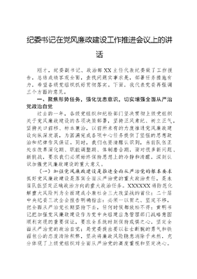 纪委书记在党风廉政建设工作推进会议上的讲话刚才,纪委副书记、政治部XX主任代表纪委做了工作报告,总结成绩客观全面,查找问题实事求是,部署任务措施有力,希望各级党组织抓好贯彻落实。下面,我代表党委再强调三个方面的意见。一、聚焦形势任务,强化忧患意识,切实增强全面从严治党政治自觉过去的一年,各级党组织和纪检部门坚决贯彻上级党组织关于党风廉政建设的各项决策部署,坚持正风肃纪、树立正气,坚持关口前移、标本兼治,以前所未有的力度推进党风廉政建设向纵深发展,为圆满完成各项中心任务提供了坚强的思想政治和纪律作风保证。同时,我们也要清醒认识到,当前队伍正处在改革深化期、职能调整期、体制磨合期,面对很多新问题、新挑战,要求我们必须始终保持思想上的冷静和清醒,深刻认识加强党风廉政建设的重大意义。(一)加强党风廉政建设是推进全面从严治党的根本要求抓好党风廉政建设是落实全面从严治党的重大政治责任,是永葆队伍坚定正确政治方向的重大政治任务。XXXXXX将防范化解重大风险列为全面建成小康社会三大攻坚战的首位;二十届中央纪委三次全会报告明确指出:必须一以贯之、坚定不移,把全面从严治党长期坚持下去,任何时候都放松不得;黄明书记把加强党风廉政建设作为党中央组建应急管理部门战略意图顺利实现的重要保证,要求全系统时刻保持戒惧之心,坚定全面从严治党的政治自觉;局党委提出要以壮士断腕的勇气和铁面包公的态度清除积弊,坚决将廉政风险隐患消除于未然,充分体现了上级党组织对全面从严治党的高度重视和坚定决心。各级党组织必须提高政治站位,以更大的决心和力度,把党风廉政建设抓得更紧、抓得更严、抓出实效。(二)加强党风廉政建设是落实两严两准标准的重要保证。XXXXXX指出改制转隶后的队伍执行严肃的纪律、严密的组织,从严治党仍然是不变的主题。当前,执法问题已经引起了XXX、总理等中央领导的高度关注。(三)加强党风廉政建设是防范化解队伍风险的有效途径XXXXXX在省部级领导干部培训班上,从全局和战略的高度,分析研判了七大领域风险,高度重视风险防范化解工作。要强化风险预测和管控,切实把影响队伍安全稳定的各类明患隐忧消除在萌芽状态。当前,队伍在政治安全、作风建设、执法、后勤领域、作战训练、队伍管理、失密泄密、舆情管控、管酒治酒、预防犯罪、涉赌涉贷、赴京上访等12个方面存在安全风险。另外,去年相继发生来省进京缠访闹访、醉驾、诽谤领导、网络赌博等恶性事件,教训十分惨痛,很多领导干部也被追责问责。各级党组织一定要总结经验教训,建立行之有效的制度体系,切实扎牢拒腐防变的笼子,坚决杜绝各类违纪违法问题的发生。二、提高政治站位,突出标本兼治,着力推动全面从严治党纵深发展今年党风廉政建设工作的总体要求是:坚持以XXX新时代中国特色社会主义思想为指导,全面贯彻落实党的XXX和二十届二中全会精神,认真贯彻二十届中央纪委三次全会精神,坚持党的政治建设与防范化解重大风险为统领,狠抓全面从严治党责任落实,持续改进作风,坚决惩治腐败,全面建设忠诚干净担当的队伍,为新中国成立75周年营造安全稳定的社会环境提供坚强保证。(一)坚持政治统领,永葆忠诚本色。各级党组织和领导干部要坚持把政治标准、政治要求贯穿始终,坚定政治信仰牢记初心使命。一是要严格政治标准。坚持用XXX新时代中国特色社会主义思想武装头脑、指导实践、推动工作。今年,党委将按照部局党委要求,重点抓好学训词、铸忠诚、创新业、立新功主题教育,分级举办学训词理论轮训班,确保广大指战员将XXX训词融入到灵魂血脉、落实在一言一行,树牢四个意识、增强四个自信、践行两个维护,严守政治纪律、政治规矩,坚决确保党中央、上级党组织决策部署在不折不扣的落实到位。二是要强化政治监督。要紧盯关键少数,管住绝大多数,加大对个人重大事项的抽查力度,对隐瞒不报、不如实报告的,严格落实纪律处分和组织处理措施。按照部局部署要求,对四分之一支队级单位开展政治巡察,重点围绕践行两个维护,遵守政治纪律和政治规矩,选人用人,整治形式主义、官僚主义等工作开展巡察,对过去长期积累的廉政积弊进行一次全盘扫描,对出现履行两个责任不力、党组织弱化的单位,严肃追究党组织和领导干部责任。三是要增强政治本领。要把政治能力作为领导干部履行职责的首要能力,融入到的各项工作中。认真学习贯彻近期中央下发的《中共中央关于加强党的政治建设的意见》《中国共产党党组工作条例》《中国共产党支部工作条例》等党内重要制度规定,严肃党内政治生活,强化党性锻炼,加强机关党建,建强基层思想骨干队伍,确保队伍始终听党话、跟党走,永葆对党忠诚的政治本色。三、强化使命担当,层层压实责任,坚决确保全面从严治党责任落实XXXXXX指出,责任担当是干部必备的基本素质,有多大担当,才能干多大事业。各级党组织要把党风廉政建设责任体现到日常、