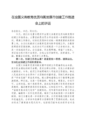 在全国义务教育优质均衡发展市创建工作推进会上的讲话各位校长、书记,同志们:今天,我们在这里专题召开全国义务教育优质均衡发展市创建工作推进会,主要目的是动员全市各校进一步凝聚创建共识、理清工作路径,切实把思想和行动统一到局党委的决策部署上来,全力以赴做好义务教育优质均衡市创建工作,为教育提质提供坚强保障。此次会议可以说既是一个业务培训会,也是一次临战动员会,会议虽短、但主题明确,希望广大校长、书记结合刚才刚才各领导、分线主任仔细研究、抓好落实。下面,根据会议安排,我再讲三点意见。第一点,创建工作怎么看?就是要统一思想、提高站位,坚决扛起创建工作的职责使命。全国义务教育优质均衡发展市创建工作是推进社会共富、提升民生福祉的时代命题,是回应群众所盼、优化公共服务的关键路径。今年,此项工作被明确列入市政府工作报告,事关人民政府对社会各界和广大百姓的郑重承诺,同时又牵涉省政府学有优教等各类考核,极大影响着群众对于教育事业的满意度,所以说,这是一项硬指标、硬任务、硬要求,非创不可、必须攻坚。换个角度思考,其实此项创建工作更是突破发展瓶颈、撬动教育提质的有效载体。比如前些年年,我们结合省教育基本现代化市创建契机,向市委市政府争取了资金、项目、编制等一系列优质资源,确保了各类政策进一步向教育倾斜、部门力量也进一步向教育汇聚,从而使得我们教育在硬件设施优化、办学条件改善等方面都取得了显著的成绩,也成功创成了教育基本现代化市。包括我们前年成功获评省对县(市区)政府履行教育职责评价A等考核的成绩。我举这些例子,其实就是为了向大家传达一个观念,创建工作不仅是挑战、更是机遇,全市教育系统要切实提高政治站位,深刻认识开展创建工作的重要性、必要性,迎难而上、主动作为,做到以评促改、以创提质,用拉弓满弦之势推动各项创建指标达标和整改整治措施到位,不断巩固义务教育优质均衡发展态势,奋力夺取这一项国字号荣誉。第二点:创建工作怎么干?就是要对标对表、问题导向,全面梳理创建工作的短板弱项。县域义务教育优质均衡发展督导评估认定体系共分为资源配置、政府保障程度、教育质量、社会认可度等多个方面内容及各评价指标。今年上半年,教育局专门成立了创建工作专班、制定工作方案,对照创建体系分解任务、明确职责,实施挂图作战挂牌销号,全面营造重自查补短板、迎创建促提升的良好氛围。前阶段,相关科室已和各学校进行了反复对接,针对各相关指标做了汇总与更新,接下来即将开启新的学年,我们也要同步启动新一轮的自查自报工作,希望各校校长、书记务必要高度重视、抓好落实。一是以上率下,层层传导责任压力。创建工作,学校是主战场、各校长书记是主力军,你们要以第一责任人的身份做好标准研究和问题梳理,针对教师结构、教室用房、设备仪器等各类要素进行系统摸底、全面厘清家底,为靶向整改问题、提升办学条件提供精准、有效的数据支撑。今年也是各校校级领导调整较多的一年,很多学校领导干部就任新的岗位、来到新的环境,可能还未真正摸透各自学校的家底,要借创建机会进一步沉下心、俯下身做好梳理和了解,同时要带动校班子成员结合分管工作深入调查研究,群策群力做好任务攻坚。二是认真研读,全面掌握评估标准。会前相关科室已经将《县域义务教育优质均衡省级评估认定实地督导手册》《市创建全国义务教育优质均衡发展市工作资料汇编》印发给大家了,希望在座的各位校长书记仔细研读相关资料,吃透评价工作要求、掌握评估督查重点、了解督导工作流程,进一步厘清创建任务所承担的具体工作职责、工作任务和指标要求,确保创建所需的各项数据整理到位、各项职责落实到位。三是自查自报,主动发现创建问题。各校级领导要牢固树立抓好创建是本职,抓不好创建是失职的工作理念,对照标准一条一条把脉问诊、一项一项找准病灶,不掩盖、不回避、不推脱,进一步找准找实问题症结和矛盾本质所在,为抓好整改提供精准靶向,全面推动各项评估指标齐步走。会后,我们将下发《创建全国义务教育优质均衡发展市学校问题清单》,请大家针对存在的问题进行细致梳理、认真填报,只有把短板指标一五一十地摆出来、亮出来,我们的思考才能更有方向、举措才能有的放矢。第三点:创建工作怎么抓?就是要整合资源、科学施策,积极推动创建工作的精准破题。发现问题是起点,整改落实是关键,不能仅停留在纸上谈兵,更要付诸到实际行动中去。我们要盯紧弱项、补齐短板,按照一事一案一校一案的原则主动研究对策路径,做到对症下药、逐项销号,以最有效、最快捷的方式把问题清单有效转化为成效清单,以项项达标、校校优质为目标圆满完成创建任务。一是向内挖潜力,进一步盘活自身资源。各级各类学校发现问题后,第一时间要立足各自学校角度找出路、找思路,做到向自身要动力、向内部要效益,及时制定具有针对性、可操作性的整改方案,有力