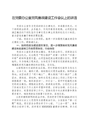 在党委办公室党风廉政建设工作会议上的讲话党委办公室作为党委的综合办事机关、参谋服务机关,对干部的政治素质、业务能力、作风形象要求极高,必须把打造清正廉洁的干部队伍作为事关党办事业发展的长远大计来抓,着力营造清廉干事的浓厚氛围。下面,我结合办公室实际,就进一步加强党风廉政建设和反腐败工作,再强调几点。一、始终把政治建设摆在首位,进一步增强做好党风廉政建设和反腐败工作的思想自觉、行动自觉党委办公室是具有政治属性、肩负政治责任、承担政治工作的政治机关,处在践行两位维护的第一方阵和四最一中枢的特殊重要位置,必须坚持把政治建设摆在首位、贯穿始终,作为铸魂工程来抓,全体党员干部要切实提高政治意识,增强抓好党风廉政建设的自觉性、坚定性。1.锤炼绝对忠诚的政治品格。把对党绝对忠诚作为信念之基、立身之本、履职之要,持续强化对党忠诚教育,鲜明政治导向,在坚决捍卫两个确立、带头做到两个维护上最坚决、最彻底、最纯粹,始终在思想上政治上行动上同党中央保持高度一致,做到表里如一、知行合一。要牢牢把握党办姓党的政治属性,增强政治意识,提高政治觉悟,自觉把办公室工作放在党办工作大局中考量和部署,在综合协调、办文办会、督查督办、机要保密等工作中,坚持向党中央决策部署和具体要求看齐,确保党的各项部署不打折扣、落地见效。2.把牢旗帜鲜明的政治方向。坚持把学习贯彻XXX新时代中国特色社会主义思想作为首要政治任务,全面落实第一议题制度,通过室务会理论学习中心组、三会一课、青年理论小组学习等,深学笃行XXXXXX重要讲话精神,努力武装头脑、锤炼党性、净化灵魂,在大是大非面前保持头脑清醒、旗帜鲜明。要从政治高度认识和把握胸怀两个大局、心怀国之大者,增强通观全局的政治判断力、对标看齐的政治领悟力、坚定自觉的政治执行力,在发挥党委参谋部和外脑职能作用中,在向市委提出贯彻落实上级党委决策部署的对策建议时,在开展的各项调研、督查、考核中,都要考虑政治要求、政治因素、政治效果,及时发现和校正偏差,确保各项工作政治方向不偏离、政治标准不降低,始终沿着正确的方向发展。3.严守令行禁止的政治规矩。政治是方向、是大局,也是根本,作为党办干部,我们必须始终将捍卫两个确立、做到两个维护作为最高政治原则、最根本的政治要求、最重要的政治纪律,贯穿到日常工作全过程各方面,严守政治纪律和政治规矩,严肃党内政治生活,坚决做到五个必须,坚决防止七个有之,党中央提倡的坚决响应、党中央决定的坚决执行、党中央禁止的坚决杜绝。要把政治要求贯穿到做好党办各项工作中,严把政治关口、严格政治标准、严明政治要求,始终做到一心为公、一身正气、一尘不染,切实以政治过硬推动工作过硬。二、聚焦担当主责主业、廉洁干事,推动提升三服务工作质量和水平近年来,办公室深入学习贯彻XXXXXX关于全面从严治党的重要论述,把全面从严治党摆在重要位置、纳入工作全局、持续有力推进,各项工作取得了新进展、新成效。党委办公室工作头绪多、压力大、任务重,全体党员干部要紧紧围绕大局、以敢于担当、严于律己、作风过硬的精神,做深做细做实各项工作,推动提升三服务工作水平。1.突出实干担当,做敢为人先的带头人。主动发扬办公室吃苦耐劳、担当尽责、甘于奉献的优良作风,在助力建设先行区、创建示范区、推动四大提升行动、全面深化改革等重点任务上,紧跟市委节奏不掉队、紧贴领导思路不落伍,努力展现党办干部新作为新形象。要极端负责,牢记天下大事必作于细的道理,严把每道关口,讲究工作效率,对承担的工作任务认真负责,做到文经我手无差错、事交我办请放心,坚决做到以文辅政实、信息服务准、办事办会细、督查落实紧、机要保密严、后勤保障优,切实发挥好身在兵位、胸为帅谋的作用。要正确认识苦与乐、得与失的关系,始终保持干事创业激情,甘坐冷板凳、甘当幕后人,在关键时刻和危急关头豁得出来、顶得上去、经得住考验,对市委作出的决策、部署的工作、定下的事情,雷厉风行、紧抓快办,做到文无积卷、事不过夜,真正当好坚强前哨和巩固后院。2.带头以身作则,做清正廉洁的干净人。清廉是永恒的护身符,清廉清白不只是嘴上喊的口号、也不是一阵子的坚持,而是必须遵循的不二铁律、需要一辈子坚守的底线2014年5月8日,XXXXXX视察中办并同中办干部职工代表座谈时强调,党办岗位特殊、责任重大,在群众眼里是一个神圣的称号。大家在工作在党委身边,如果出了问题,不仅毁了个人,而且会给党的声誉和形象带来影响,必须绷紧廉洁自律这根弦。全体党员干部要始终牢记清廉是福、贪欲是祸,把严守纪律规矩作为终身必修课,经常对照党的理论和路线方针政策、对照党章党规党纪、对照初心使命和自查自省,正确处理公和私、情和法、义和利的关系,严格执
