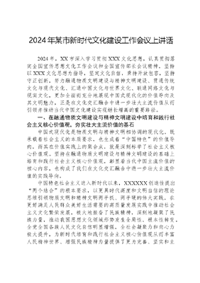 2024年某市新时代文化建设工作会议上讲话2024年,XX市深入学习贯彻XXX文化思想,认真贯彻落实全国宣传思想文化工作会议和全国宣传部长会议精神,坚持以XXX文化思想为指导,坚定文化自信,秉持开放包容,坚持守正创新,努力融通物质文明建设与精神文明建设、贯通传统文化与现代文化、汇通中国文化与世界文化、联通网络文化与现实文化,更加全面而充分地展现中国式现代化的价值导向及其文明魅力,正是在文化交汇融合中进一步壮大主流价值从而引领并推动当代中国文化建设实现继长增高的重要路径。一、在融通物质文明建设与精神文明建设中培育和践行社会主义核心价值观,夯实壮大主流价值的基石中国式现代化是物质文明与精神文明相协调的现代化,既承载着社会主义的本质要求,也生成着中国特色的价值导向,而其在价值实践上的聚合点,就是深刻标举了社会主义核心价值观。坚持在融通物质文明建设与精神文明建设的基础上培育和践行社会主义核心价值观,彰显着当代中国主流价值的核心内容,也构成了我们在文化交汇融合中进一步壮大主流价值的实践导向。中国特色社会主义进入新时代以来,XXXXXX创造性提出两个结合的根本要求,以更具时代高度和文明自信的理论思维引领物质文明和精神文明两手抓、两手硬的伟大实践,在更好满足人民群众美好生活需要的高质量发展实践中推动社会主义文化繁荣发展,极大地振奋了民族精神,深刻地凝聚了民族力量,推动我国思想文化领域形势发生全局性、根本性转变,全党全国各族人民文化自信明显增强,全社会凝聚力和向心力极大提升,为新时代培育和践行社会主义核心价值观从而丰富人民精神世界、增强民族精神力量提供了更为完善、坚实和主动的实践基础。新时代新征程上,坚持在促进物质财富充分涌流的同时又推动精神财富极大丰厚,在两个文明的均衡发展、相互促进中坚定培育和践行社会主义核心价值观,必将为我们在物质文化与精神文化的交汇融合中进一步壮大主流价值提供最牢固基石。二、在贯通传统文化与现代文化中建设中华民族现代文明增强壮大主流价值的自信中国式现代化是我们党领导全国各族人民在长期探索和实践中历经千辛万苦、付出巨大代价开创和拓展的现代化,也是从五千多年中华文明深厚基础上走出来的现代化。这就决定了当代中国的主流价值必然要坚持把马克思主义基本原理同中华优秀传统文化相结合,在既坚守马克思主义魂脉又坚守中华优秀传统文化根脉中努力建设中华民族现代文明。建设中华民族现代文明,以新时代新的文化使命形式贯通了中华优秀传统文化、革命文化和社会主义先进文化,展现了 中国特色的文化建构所拥有的文化自信底气、开放包容大气和正气锐气,正是我们在文化的交汇融合中进一步壮大主流价值的实践自信。中国式现代化是赓续古老文明的现代化而不是消灭古老文明的现代化,是文明更新的结果而不是文明断裂的产物。中华民族从远古走来,之所以能够成就人类文明发展史上从未中断的独特文明形态及其独到的人文传统、精神气质和惠泽天下的历史进程, 一个最根本、最深层的原因就在于,中华文明具有突出的连续性、突出的创新性、突出的统一性、突出的包容性、突出的和平性,从而为中华文明的传承与发展标注了最根本底色,为中国式现代化的开创与拓展赋予了最深厚的底蕴,为当代中国确立并壮大主流价值提供了最磅礴底气。新时代新征程上,充分激活和运用中华优秀传统文化的宝贵资源,坚持推动中华优秀传统文化实现创造性转化、创新性发展,坚持以高度的中华文化主体性赓续历史文脉、谱写当代华章,从而在创造新的历史中延续中华民族的永恒历史,在创造人类文明新形态中礼敬中华文明的博大精深,必将为我们在传统文化与现代文化的交汇融合中进一步壮大主流价值提供气魄宏大且气象万千的文明自信。三、在汇通中国文化与世界文化中弘扬全人类共同价值,拓宽壮大主流价值的空间中国式现代化是既为中国人民谋幸福、谋发展的现代化,又是为世界谋和平、谋大同的现代化。这就决定了当代中国的主流价值必然要坚定站在历史正确的一边、站在人类文明进步的一边。坚持弘扬和平、发展、公平、正义、民主、自由的全人类共同价值,标举了马克思主义为人类求解放的崇高理想,标示了中华民族和中华文明数千年传承的民族精神,标注了人类具有共同性的文明精华,正是我们在文化的交汇融合中进一步壮大主流价值的宏阔实践格局。在全球发展问题上,中国式现代化坚持发展优先,坚持以人民为中心,坚持普惠包容,坚持创新驱动,坚持人与自然和谐共生,从而深刻彰显了中国式现代化在发展观上坚持汇通中国文化与人类文化的根本价值导向;在人类安全问题上,中国式现代化坚持共同、综合、合作、可持续的安全观,坚持尊重各国主权、领土完整,坚持遵守联合国宪章宗旨和原则,坚持重视各国合理安全关切,坚持通过对话协商以和平方式解决国家间的分歧和争端,坚持统筹维护传统领域和非传统领域安全,从而深刻彰显了中国式现代化在安全观上坚持汇通中国