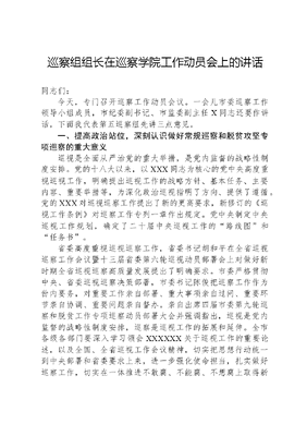 巡察组组长在巡察学院工作动员会上的讲话同志们:今天,专门召开巡察工作动员会议。一会儿市委巡察工作领导小组成员,市纪委副书记、市监委副主任X同志还要作讲话,下面我代表第五巡察组先讲三点意见。一、提高政治站位,深刻认识做好常规巡察和脱贫攻坚专项巡察的重大意义巡视是全面从严治党的重大举措,是党内监督的战略性制度安排。党的十八大以来,以XXX同志为核心的党中央高度重视巡视工作,明确提出巡视工作的战略方针、基本任务、主要内容、重要举措等,为深化政治巡视指明了方向、提供了遵循。党的XXX对巡视巡察工作提出了新的更高要求,新修订的《巡视工作条例》对巡察工作专列一章作出规定。党中央制定中央巡视工作规划,确定了二十届中央巡视工作的路线图和任务书。省委高度重视巡视巡察工作,省委书记胡和平在全省巡视巡察工作会议暨十三届省委第六轮巡视动员部署会上对做好新时期全省巡视巡察高质量发展提出了明确要求。市委严格贯彻中央、省委巡视巡察决策部署,市委书记陈俊把巡察工作作为份内要务,对重要工作亲自部署、重大事项亲自过问、重要环节亲自协调、重要问题亲自督办。亲自出席四届市委第九轮巡察和脱贫工作专项巡察动员部署大会并强调指出,巡视是党内监督的战略性制度安排,巡察是巡视工作的拓展和延伸。全市各级各部门要深入学习领会XXXXXX关于巡视工作的重要论述,以及全国、全省巡视工作会议精神,切实把思想行动统一到中央部署和省委要求上来,进一步强化使命担当,扎实做好巡察工作,切实在一体推进不敢腐、不能腐、不想腐上取得新成效。陈俊书记强调,市县巡察要扭住重点、精准发力,围绕XXX重要指示批示和党的基本路线、基本理论、基本方略,着力检查中央重大决策部署贯彻落实情况,推进政治监督具体化常态化。要建立问题、任务、责任三个清单,督促被巡察党组织逐项整改落实。要加强与纪律、监察、派驻等监督相互贯通,构建科学严密监督网,切实做到权力监督全覆盖。要剑指问题、靶向施策,重点围绕四个落实查找问题,着力增强巡察监督的针对性和实效性。我们要充分认识巡察工作的重大意义,提高政治站位和政治觉悟,进一步增强做好巡视巡察工作的政治责任感和历史使命感,扎实完成好本轮巡察任务。二、聚焦六围绕一加强,坚定不移深化政治巡察根据中央、省委巡视巡察工作要求和市委安排部署,本轮巡察采取常规加专项的方式进行,重点检查六个围绕、一个加强和脱贫攻坚四个落实方面的情况。(一)围绕党的政治建设,重点检查两个维护情况。一是检查维护XXXXXX核心地位、维护党中央权威和集中统一领导情况。了解被巡察党组织和党员领导干部是否牢固树立四个意识,在思想上政治上行动上坚决维护XXXXXX在党中央和全党的核心地位;是否坚决同危害以XXX同志为核心的党中央权威和集中统一领导的行为作斗争;是否在大是大非问题上旗帜鲜明、敢于亮剑,有无立场不明、态度暖昧,心口不一、阳奉阴违等问题;是否完善和落实民主集中制各项制度,做到四个服从,自觉维护党的团结统一,有无重大事项、重大问题不请示报告,擅自决定等问题;是否存在违反五个必须要求搞七个有之的问题;是否存在个人主义、分散主义、自由主义、本位主义、好人主义,宗派主义、圈子文化、码头文化,搞两面派、做两面人,以及破坏党内政治生态等问题。二是检查坚持和加强党的全面领导情况。紧盯政治责任和政治担当,看被巡察党组织领导班子是否坚强有力;是否总揽全局、协调各方,发挥党的领导核心作用;是否对党的全面领导存在模糊和错误认识;是否扛起管党治党政治责任。三是检查彻落实党的XXX精神和中央、省委、市委重大决策部署情况。紧盯党的政治路线执行情况,看是否认真贯彻五位一体总体布局、四个全面战略布局和新发展理念,密切联系实际抓好贯彻落实;是否全面落实XXXXXX对陕西的指示精神,着眼追赶超越定位和五个扎实要求,推动五新战略任务;是否存在贯彻执行党的路线方针政策不坚决不全面不到位、态度不鲜明、立场不坚定问题;是否存在对中央、省委和市委的重大决策部署特别是关于教育、医疗方面决策部署不及时传达研究、重表态轻落实等问题;是否存在上有政策、下有对策,虚伪应付、实不作为,搞选择性执行等问题。(二)围绕党的思想建设,重点检查学习贯彻XXX新时代中国特色社会主义思想情况。一是检查深入学习贯彻XXX新时代中国特色社会主义思想情况。看是否把学习贯彻党的XXX精神作为首要政治任务,深入学习领会XXX新时代中国特色社会主义思想和基本方略;是否存在学习贯彻XXX新时代中国特色社会主义思想不全面、不深入、不坚决、不到位等问题;是否扎实开展主题教育,用党的创新理论武装头脑;是否弘扬理论联系实际的学风,自觉运用科学理论指导实践;是否存在学做两张皮,形式上学习新思想、新方略,具体工作中仍然走老路等问题。二是检查