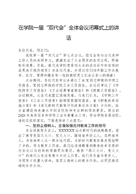 在学院一届双代会全体会议闭幕式上的讲话各位代表,同志们:我院第一届双代会第七次会议,经过全体与会代表和工作人员的共同努力,圆满完成了大会预定的各项议程,即将胜利闭幕。在此,我代表学院党委对大会的成功召开和取得的成果表示热烈祝贺!向各位代表,并通过你们向辛勤工作在教学、医疗、管理和服务等一线的教职员工们表示衷心的感谢!大会期间,各位代表审议并通过了由X同志所做的学院工作报告、X同志所做的学院工会工作报告。会议还审议了《学院财务工作报告》《工会经费审查报告》和《提案工作报告》。会议期间,从各代表团汇报情况看,代表们认为,《学院工作报告》《工会工作报告》能够紧紧围绕国家、省《职教改革实施方案》和《深化新时代教育评价改革总体方案》方向标,结合省建设特色高水平职业院校和专业群的现实要求,提出的2024年具体任务和学院工会年度重点工作,符合学院发展实际,请切实抓好落实,下面我再讲三点意见:一、坚持立德树人,全面加强党对教育工作的领导在全国教育大会上,XXXXXX站在新时代的战略高度,提出了教育是国之大计、党之大计,围绕培养什么人,怎样培养人,为谁培养人这一根本性问题,为新时代教育改革发展指明了方向。作为教育工作者,我们应该清醒看到教育改革发展的任务比以往任何时候都更加艰巨,教育国之大计、党之大计的地位从来没有像今天这么凸显。我们肩负着为党育人、为国育才的重大使命,落实立德树人的根本任务,必须坚持正确的办学方向。一是突出政治引领,持续加强政治建设。坚持把党的政治建设放在首位,把讲政治作为一切工作的生命线。切实加强党对教育工作的全面领导,就是要教育引导广大师生提高政治站位,就是要用四个意识导航,用四个自信强基,用两个维护铸魂,就是要在思想上、政治上、行动上同以XXX同志为核心的党中央保持高度一致。二是深入开展牢记嘱托.奋进商洛党建主题活动。开展牢记嘱托·奋进商洛党建主题活动,既是贯彻XXXXXX来陕考察重要讲话精神的具体行动,也是加强党的建设的现实需要。学院各级党组织和广大党员干部要提高政治站位,自觉把思想和行动统一到市委和院党委的部署上来,推动党建主题活动深入开展。要紧盯重点关键,以争创红旗党组织、争做时代先锋、争当奋进标兵三争创建活动为抓手,抓点示范、强化引领,做细做实创先争优活动。三是抓实基层组织建设,持续提升党建工作质量。要严格落实三会一课、组织生活会、谈话谈心、民主评议党员等制度,加强基层党支部五化建设,开展多样主题党日活动,推动党员服务师生常态化制度化,深化精技匠心育人才示范党建品牌建设,以高质量党建推动学院事业高质量发展。二、坚持三教改革,不断提升教育教学内涵质量一是持续用力,推进三教改革。要结合学院教育教学实际,落实新时代教育评价制度要求和职教20条改革路线图,深入推进教师、教材、教法三教改革。要加强师资队伍建设,抓好青蓝工程名师工程等六大工程的落实,推动师资水平整体提升;要守牢教材意识形态阵地,开展校企双元合作开发职业教育规划教材,支持教师编写校本专业教材、融媒体教材等;要进一步健全诊改常态化工作机制,加大一流专业培育项目和特色专业群建设力度,积极推进教学模式、教学方法改革,驰而不息地抓规范,提质量。二是同向同行,提升课程思政育人实效。XXXXXX在系列重要讲话中都谈到培育时代新人是教育的重要使命和根本任务。时代新人不仅体现在技术、知识等方面与时俱进,还体现在家国情怀、使命担当、价值规范等诸方面,课程思政的核心任务就是培养时代新人。这里的课程既包括各专业所必须的专业课程,也包括各种综合类、通识类课程。同向就是在具体的课程思政实施过程中,始终贯彻培育什么样的人这个根本目标。同行主要侧重课程体系的合理分工、相互配合、有序设计,处理不同课程之间的内在关系。这就要求把育人的整体目标作为学院课程建设的整体价值目标,同时把握不同的课程类别之间的差异性及其内在联系。只有坚持同向同行,才能真正实现以课程为载体,发挥课程思政的育人功效。三是统一思想,深入贯彻职教改革新理念。全院师生要在全面深入学习贯彻职教20条、《深化新时代教育评价改革总体方案》《职业教育提质培优行动计划》等文件精神的基础上,进一步解放思想,厘清办学路径,推动学院各领域改革,把责任担当、善于作为贯穿教育教学全过程;进一步深化产教融合、校企合作,将大学精神和一院一品质量文化融入日常教育教学,真正实现产教协同育人;进一步从追求规模扩张向提高内涵质量转变,不断提升学院高等职业教育现代化水平,为创建省级特色高水平职业院校和专业群建设夯实基础。三、坚持以人为本,全面构建和谐平安校园今年是新中国成立75周年,也是敏感之年。大事多、喜事多、难事也多,保持校园安全稳定至关重要,构建