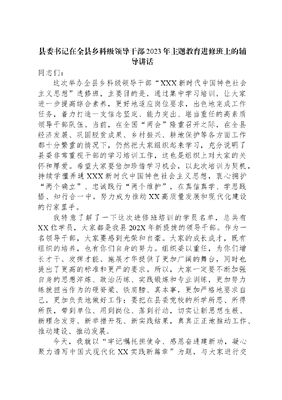 县委书记在全县乡科级领导干部2023年主题教育进修班上的辅导讲话同志们:这次举办全县乡科级领导干部XXX新时代中国特色社会主义思想进修班,主要目的是,通过集中学习培训,让大家进一步提高综合素养,更好地适应岗位要求,出色地完成工作任务,着力打造一支信念坚定、能力突出、堪当重任的高素质领导干部队伍。当前,在全国两会隆重召开之际,在全县经济发展、巩固脱贫成果、乡村振兴、耕地保护等各方面工作都十分繁重的情况下,仍然把大家组织起来学习,充分说明了县委非常重视干部的学习培训工作,这也是组织上对大家的关怀和厚爱。希望大家要倍加珍惜学习机会,以此次培训为契机,持续学懂弄通XXX新时代中国特色社会主义思想,衷心拥护两个确立、忠诚践行两个维护,在真信真学、学思践悟、知行合一中,努力成为推动XX高质量发展和现代化建设的行家里手。我特意了解了一下这次进修班培训的学员名单,总共有XX位学员,大家都是我县202X年新提拔的领导干部。作为一名领导干部,大家要感到光荣和自豪。大家的成长成才,既有组织的培养,也有你们自身的努力。组织委以重任,为你们增长才干、发挥才能、施展才华提供了更加广阔的舞台,同时也提出了更高的标准和更严的要求。所以,大家一定要不断加强自身的思想淬炼、政治历练、实践锻炼和专业训练,更加努力练就担当作为的硬脊梁、铁肩膀、真本事,更加严格地要求自己,更加负责地做好工作;要把在县委党校的所学所思、所得所获,带到单位、用到岗位、落到行动,切实让新思想生根、新理念发芽、新举措开花、新实践结果,真真正正地推动工作、推动建设、推动发展。今天,我就以牢记嘱托担使命、感恩奋进建新功,凝心聚力谱写中国式现代化XX实践新篇章为题,与大家进行交流,希望大家在今后的工作、学习和生活中一定要做好八种人。第一,要做立场坚定的政治明白人XXXXXX强调:作为党的干部,不论在什么地方、在哪个岗位上工作,都要增强党性立场和政治意识,经得起风浪考验,不能在政治方向上走岔了、走偏了。所以,大家作为党和国家的干部,还是领导干部,既然被组织重用,就必须得做个政治上的明白人,明白自己必须要负起什么样的政治责任。一要忠诚践行两个维护。是不是衷心拥护两个确立、忠诚践行两个维护,检验的一个重要标准,就是看XXX重要指示精神和党中央决策部署是不是在本乡镇(街道)、本部门真正落地落实。XXX要求我们守好发展和生态两条底线,如果还不治理污染,还上污染项目,中央环保督察发现问题慢整改、不整改,怎么能说做到了拥护两个确立、践行两个维护呢?XXX要求我们把绿水青山转变为金山银山,如果面对碳汇经济产业风口不积极抢抓,面对风电、光伏等能源项目不加快培育,绿水青山没有转变为金山银山,怎么能说做到了拥护两个确立、践行两个维护呢?XXX要求从政治建设的高度来看待和解决形式主义、官僚主义问题,如果还不作为、慢作为、乱作为甚至弄虚作假、欺上瞒下,怎么能说做到了拥护两个确立、践行两个维护呢?所以,大家要把衷心拥护两个确立、忠诚践行两个维护内化于心、外化于行,自觉同XXXXXX视察贵州重要讲话精神和对贵州工作重要指示批示精神,以及党中央的决策部署对标对表,做到党中央提倡的坚决响应、党中央决定的坚决执行、党中央禁止的坚决不做。二要严守政治纪律规矩。XXXXXX指出:党的纪律是多方面的,但政治纪律是最重要、最根本、最关键的纪律,遵守党的政治纪律是遵守党的全部纪律的重要基础。领导干部要文可居文库——海量学习资料,手机电脑均可下载www.wenkeju.com树牢政治纪律和政治规矩,时刻把严守政治纪律和政治规矩摆在更加重要的位置,始终站在党的立场说话,始终与党同心同德,用政治纪律和政治规矩规范自己的一言一行,真正做到在党言党、在党忧党、在党为党、在党爱党。在这个问题上,有些同志表态多行动少;还有的同志空口说空话,在工作和正式场合,说漂亮的话、表积极的态,但背地里尤其是受到一点委屈就牢骚满腹,失去了一名领导干部应有的政治品格,等等。既然组织把你放在领导这个位置上,就必须要带头观大势、顾大局、识大体,要有作为领导干部该有的样子、该有的境界、该有的担当。所以,大家必须要严格按照党的政治纪律和政治规矩办事,坚持用党章党规规范自己的言行,要始终做到知敬畏、存戒惧、守底线。三要始终做到心怀感恩。不论走多远,都不要忘了来时的路。如今大家能在领导岗位上,除了自己的个人努力,还有时代的搭台、组织的培养和家人的支持。所以,大家要感恩新时代,当下向第二个百年奋斗目标奋勇前进的新时代,给了我们每个人足够宽广的舞台。唯有感恩融入这个伟大时代,心怀梦想、追求进步、才能与之同行。一代人有一代人的使命,实现中华民族伟大复兴的接力棒交到了我们这一代人手中,希望大家要以