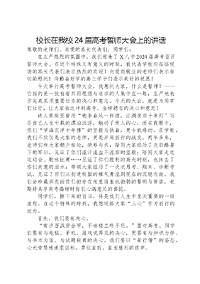 校长在我校24届高考誓师大会上的讲话尊敬的老师们、亲爱的家长代表们、同学们:在庄严热烈的氛围中,我们迎来了X八中2024届高考百日誓师大会。在这个特殊又有意义的时刻,我代表学校向莅临现场的家长代表们表示热烈的欢迎!向爱岗敬业的老师们表示亲切的慰问!向勤奋好学的高三学子们表示美好的祝愿!今天举行高考誓师大会,我想问大家,什么是誓师?——它指的是一批有着共同理想与追求的人集中在一起,庄严地表示完成某项重要任务的决心和意志。今天的大会,就是为同学们壮行,让大家表达冲刺高考、金榜题名的决心和意志!诗人黄庭坚曾用桃李春风一杯酒,江湖夜雨十年灯写尽自己人生十载的漂泊沉浮,触动了世人的心,而在我眼中,你们学海沉浮十年搏的坚毅与执着,更令我感动。在学校,我们不仅仅是大家的老师,更是并肩前行的战友。两年多来,老师们和大家朝夕相处,荣辱与共,陪同大家经历了炎日酷暑下的军训,见证了你们流汗流血不流泪的坚毅;陪同大家走过运动会、歌咏比赛……见证了你们胜利的高光时刻,也抹去了你们失意的泪水;带领大家经历了一次次月考、期末、诊断考试,见证了你们从初进校园的稚气青涩到现在的沉稳内敛。我们会珍藏那些因你们的存在而显得生机勃勃的黎明与黄昏,也期待共享高考揭榜时你们心满意足的喜悦。同学们,接下来的百日,将是我们人生中至关重要的一段旅程。在这个特殊的时刻,我想送给大家三心作为前行的动力。首先,我们要有决心。黄沙百战穿金甲,不破楼兰终不还。面对高考,同学们要有与电脑、手机、游戏说再见的决心,更要有与知识为伴、与书本为伍、与试题较真的决心。我们要以苦行僧的姿态,心无旁骛地追求目标,勇往直前,直至胜利的彼岸。其次,我们要有信心。自信人生二百年,会当水击三千里。面对高考,有同学会因做题不得法而气馁,有同学会因成绩起伏而彷徨,有同学会因为学习状态不佳而忠得患失。面对这些负面情绪,要学会自我开解,要相信自己,相信自己的潜力和实力。只要高考没到,任何一次失败、任何一个错误,都是查缺补漏的好时机。最后一百天,我们要以必胜的信念,迎接高考的洗礼。最后,我们要保持平常心。回首向来萧瑟处,也无风雨也无睛。面对任何一场考试,我们都要以平和的心态对待,不要让分数掌控了自己的喜悲。我们应该有老僧入定般的沉寂,保持内心的平静与淡定,不被过去的成败所困,不被未来的迷茫所扰。只有平时认真对待每一次考试,不骄不躁,才能在高考时保持一颗平常心,发挥出自己的最佳水平。同学们,高考虽非人生的全部,但它却是我们人生旅程中的一道重要关卡,是我们实现梦想的关键一步。在央视短片《冲出人生的7.9公里/秒》里有这样一段话:同学们,我们生活的这个世界,有时候看起来并不是那么公平,我们无法选择自己的出身家庭,也并非努力就一定可以逆天改命,现实有的时候就像引力一样牵引着你们,束缚着你们,难道就没有机会吗?有!至少现在,有一百多所双一流大学,公平地,向你们每一个人敞开大门。这个机会要由你们自己创造!同学们,今日正值惊蛰,这是万物复苏、生命觉醒的时节生命的觉醒,意味着我们要认识到生命的价值与人生的意义。而自我觉醒的标志,就是认识到你的特质是独一无二的,你的未来有无限的可能性。所以,请管理好你的目标,用梦想照亮前行的道路;管理好你的心态,积极乐观地面对机遇与挑战;管理好你的身体,因为它是实现梦想的基础与保障;管理好你的学习,因为知识是开启未来的钥匙,是我们不断前行的动力。让我们以全力以文可居文库——海量学习资料,手机电脑均可下载www.wenkeju.com赴的姿态,积极响应时代的召唤,满怀热忱地投入到后续的征程中,以笔代戈,笃行不怠,昂首阔步,迈向未来!谢谢大家!文可居文库——海量学习资料,手机电脑均可下载www.wenkeju.com
