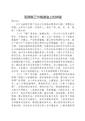 在财政工作推进会上的讲话同志们:对于当前新形势下财政工作面临的困局和问题,想要走出困境,必须守正创新、迎难而上,做好谋、收、支、保、管、诚六篇文章。(一)谋字当头,统揽全局。一是立足以收定支谋预算实。牢固树立量力而行、量入为出的原则,以保基本、保战略为重点,严控预算编制,强化财政预算刚性约束,将过紧日子的要求和理念贯穿支出预算编制、执行、监督全过程。全面实施财政绩效管理,加强绩效监控和评价结果运用,大力削减或取消低效无效支出。对市乡财政体制实行动态调整机制,推动市乡财政体制改革进一步完善。二是立足项目为王谋项目实。配合市政府进一步完善市项目谋划工作专班机制,紧紧围绕当年重点工作任务,谋划实实在在资金有来源、实施有保障的重大项目。实施融资项目谋划推进制度及考核激励办法,调动各单位项目谋划的工作积极性。加大基础设施、公共服务、乡村振兴、百城建设提质等项目投入力度。加快项目资金评审、落实土地前期资金,全力支持保障重大项目落地。(二)收字为要,克难前行。一是拓宽财政资金渠道。按照稳固壮大基础财源、培育做强新兴财源、强化收入征收管理的思路,加大综合治税力度,注重税务、国土等部门协作,深入开展税源调研、精准研判收入状况。开展以数治税、实现涉税信息共享,确保应收尽收、做到挖潜增收,壮大地方可用财力。二是盘活存量、用好增量。以国有资本、国有资产、国有资源为重要支撑,盘活存量、创造增量,多渠道筹措、整合财政资金。实现财政资金集中使用、国有资产保值增值、国有资本功能放大、国有资源集约利用。三是加快政府专项债券项目落地。精准把握政策导向,建立债券项目常态化申报机制,争取更多项目通过进入发行储备库,以高质量的项目储备争取更多资金支持。(三)支惟崇俭,严管增效。一是优化支出结构。坚持先谋事、再排钱,按轻重缓急把部门预算分为红黄绿三级,确立三保支出的优先保障地位。要求预算单位科学合理确定支出需求,打破刚性公用经费只增不减惯性,科学修订公用经费定额标准,大力压减低效无效支出。二是严格项目审核。对项目库管理按照无目标、不预算,有目标、必审核的原则,严格项目库门槛筛选机制。大力推行公务卡结算。坚决遏制超标准、超范围支出三公经费。严格新增资产配置和资产处置审核。利用财政评审、政府采购等政策,切实厉行节约,实现财政资金的节支增效。(四)保字发力,务实为民。一是兜牢兜实保民生福祉。坚持人民至上理念,把保障和改善民生福祉作为各项工作的出发点和落脚点。继续全面推进城乡养老服务体系建设,实施密集型医共体改革。通过职业培训补贴、大众创业担保贷款贴息、公益性岗位补贴等措施促进就业困难人员摆脱贫困。把特困群体补助资金落到实处,城乡低保实现应保尽保等。二是惠农强农保乡村振兴。持续抓好惠民惠农财政补贴资金一卡通管理工作。财政保障巩固拓展脱贫攻坚成果与乡村振兴过渡期衔接资金投入力度只增不减。不断支持实施产业项目,壮大村集体经济,助推乡村振兴发展。加快美丽乡村建设,推动农民的幸福指数不断提升和宜居宜业的乡村振兴战略提档升级。三是惠企纾困保市场活力。继续落实减税降费政策,优化政府采购领域营商环境,大力推动中小企业政采贷业务提质增量扩面,降低小微企业和三农等市场主体融资担保门槛,对满负荷生产规上工业企业和先进制造业给予财政奖励,向困难群体发放爱心消费券等,为中小企业纾困解难,助力经济平稳健康发展。(五)管字引领,守土尽责。一是管有序,强化财政监督。加强与纪检、审计部门的沟通协调,实现信息共享。扩文可居文库——海量学习资料,手机电脑均可下载www.wenkeju.com大财政监督范围,坚持财政资金支付到哪里,资金监管触角就延伸到哪里,严肃财经纪律源头治理,使财政资金防火墙进一步牢固。二是管作风,提升工作效能。坚持从严管党治党,以建设清廉机关、清廉国有企业、清廉干部队伍为抓手,着力打造政治清明、为民清廉、服务高效、干部清正的廉洁机关,驰而不息推动全面从严治党向纵深发展。(六)诚字为本,防化风险。一是防化政府债务风险。持之以恒抓实防范化解地方政府债务风险工作,坚持对地方政府隐性债务进行高压监管,坚决遏制增量、妥善化解存量,牢牢守住不发生重大债务风险底线。二是防化国有公司债务风险。调整优化国有公司债务结构,深化国有公司市场化改革和投融资体制改革,打破借新还旧的局面,强化国有公司自我造血功能,实现公司收益,最终达到债务可持续和债务风险的总体控制,擦亮诚信X的金字招牌。道阻且长,行则将至;行而不辍,未来可期。X财政将在市委、市政府的坚强领导下,以推动财政事业高质量发展为目标,进一步培植涵养税源确保财政收入更加稳步提升,进一步优化支出结构确保财政资金更加聚力增效,进一步强化财政监管确保财政工作